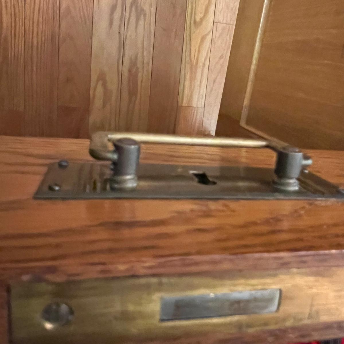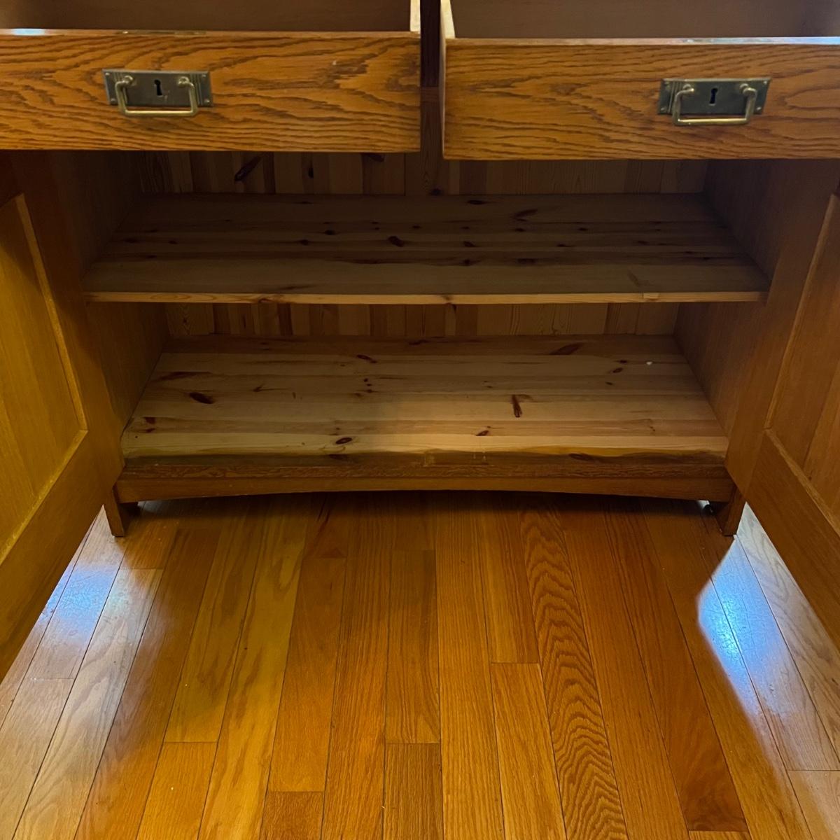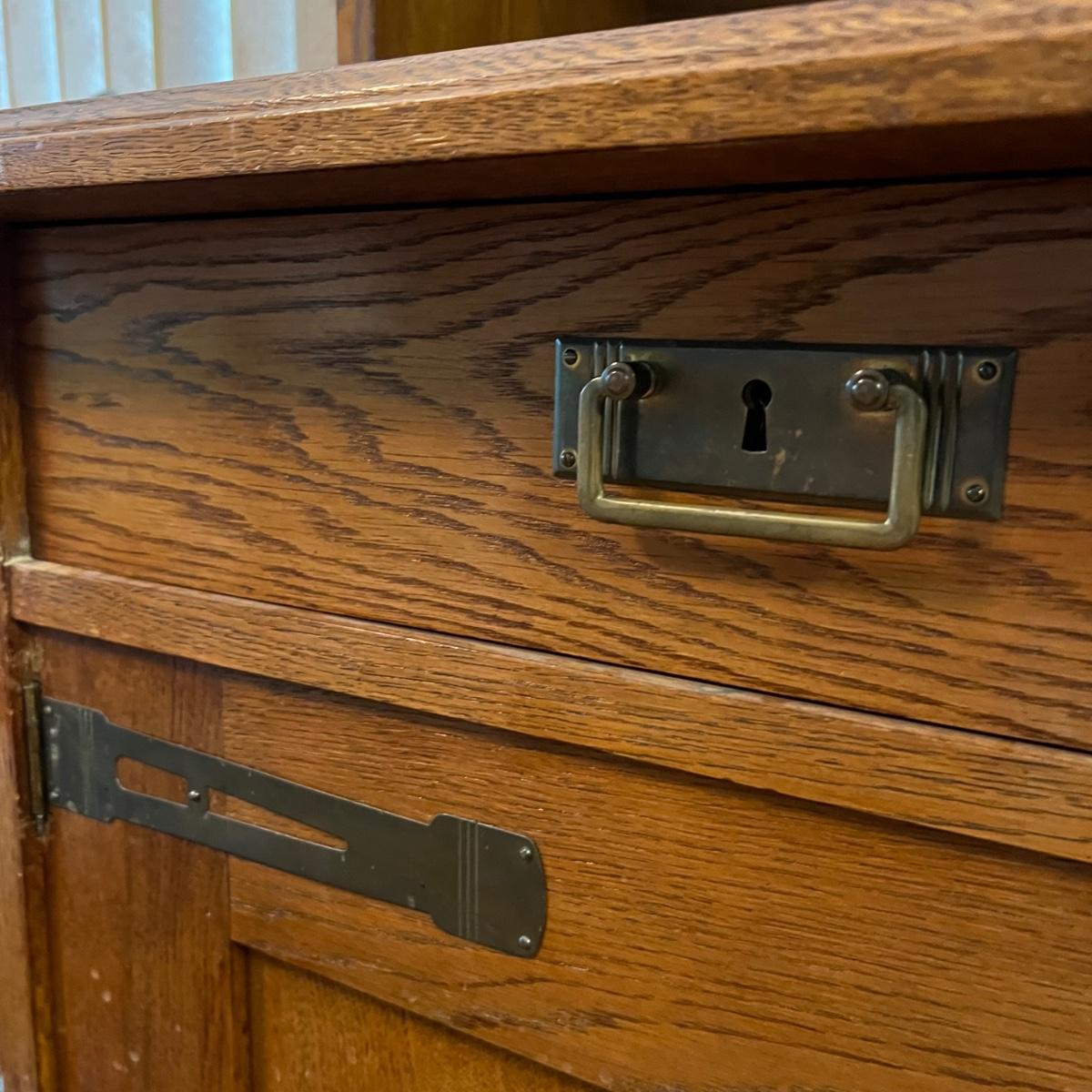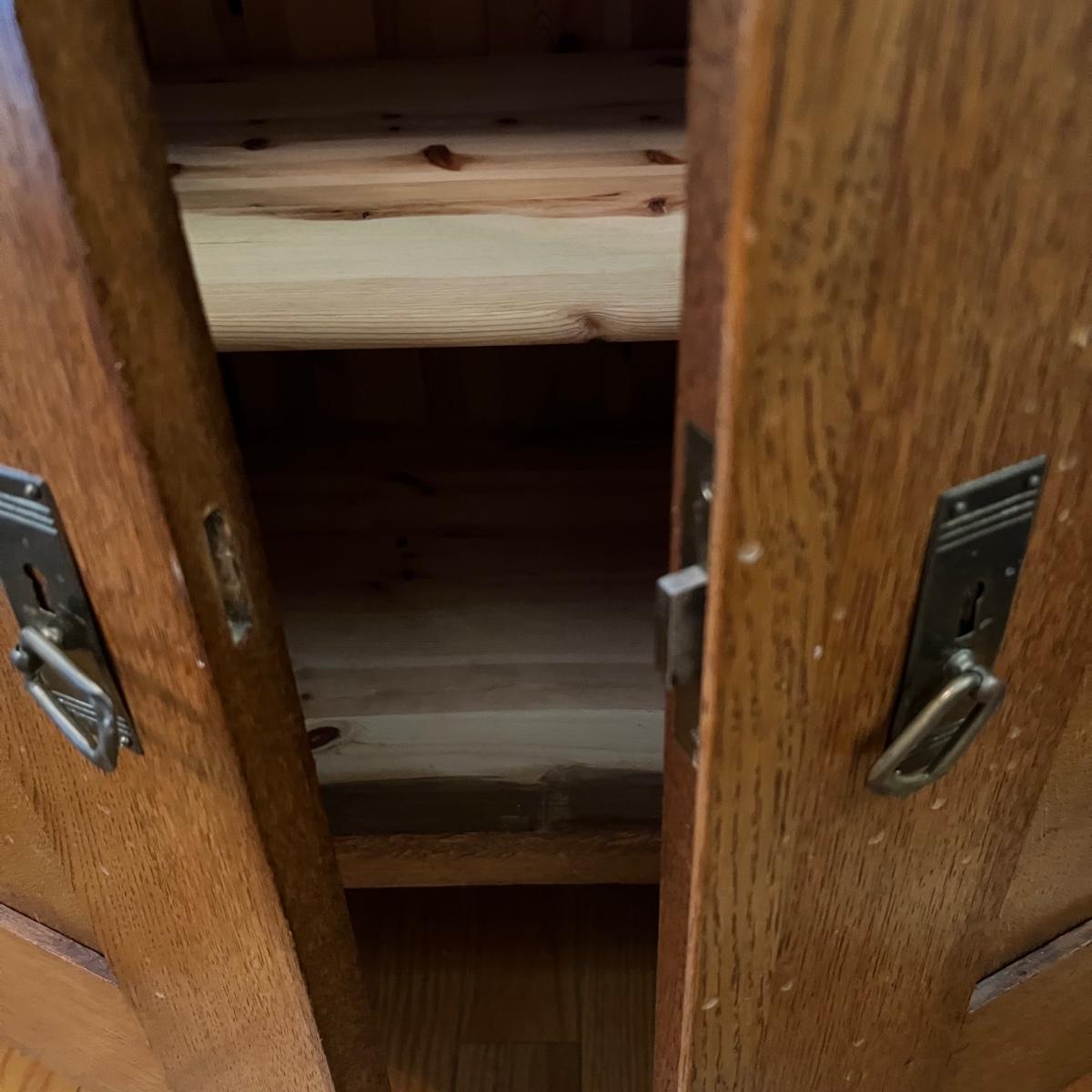 This beautiful hutch has beveled glass panels in the top two doors that flank an open cabinet. The lower section has two doors with carved details and brass hardware that open up to a generously sized single shelf cabinet that has two also generously sized dovetailed drawers above. This hutch is solid wood and appears to be possibly tiger oak with pine interior, likely an import. There is no key. Lock is stuck in locked open, ie the lock sticks out, so you do have to close the doors together simultaneously, but they close without any problem, see image.