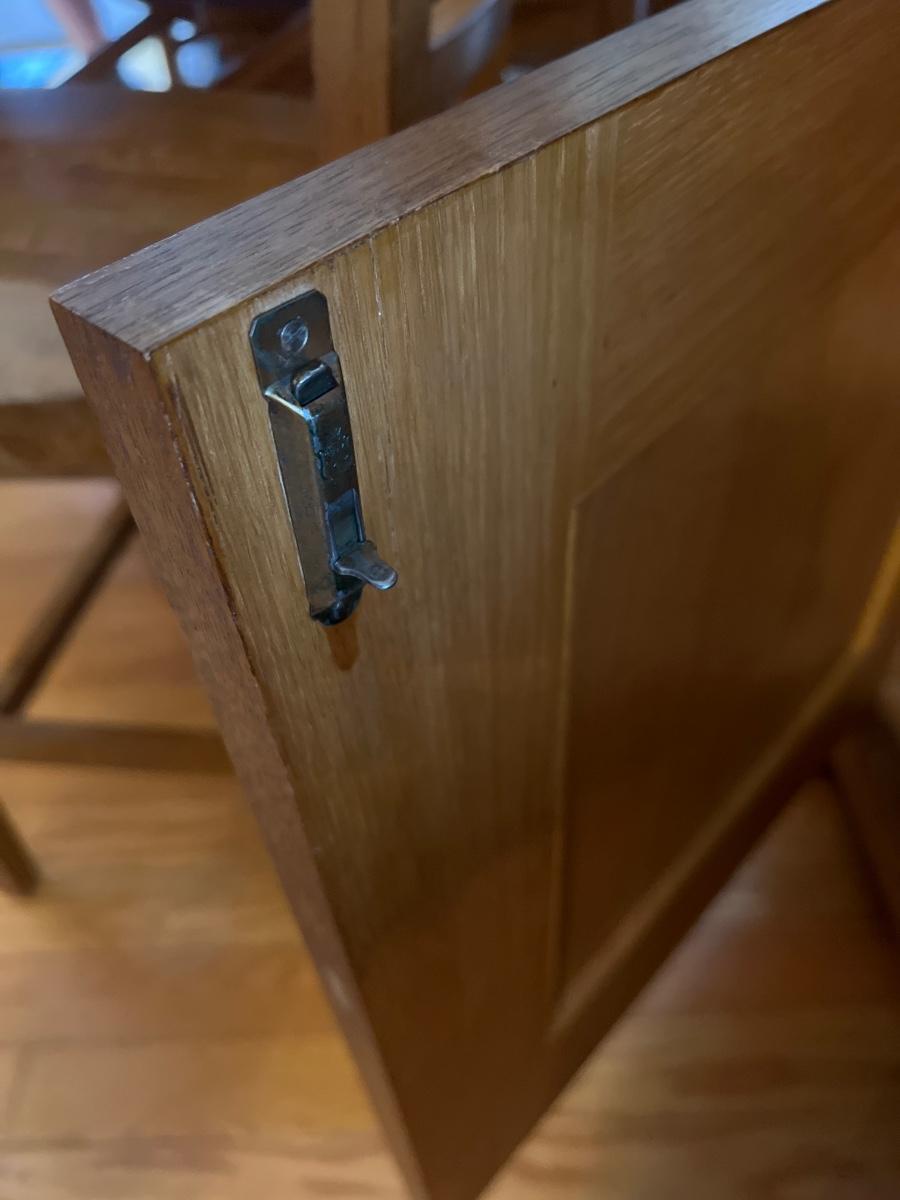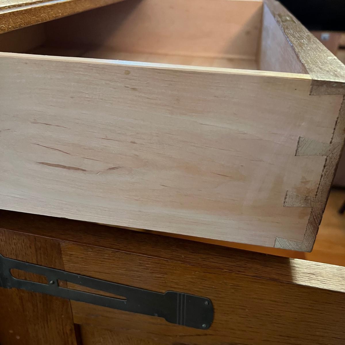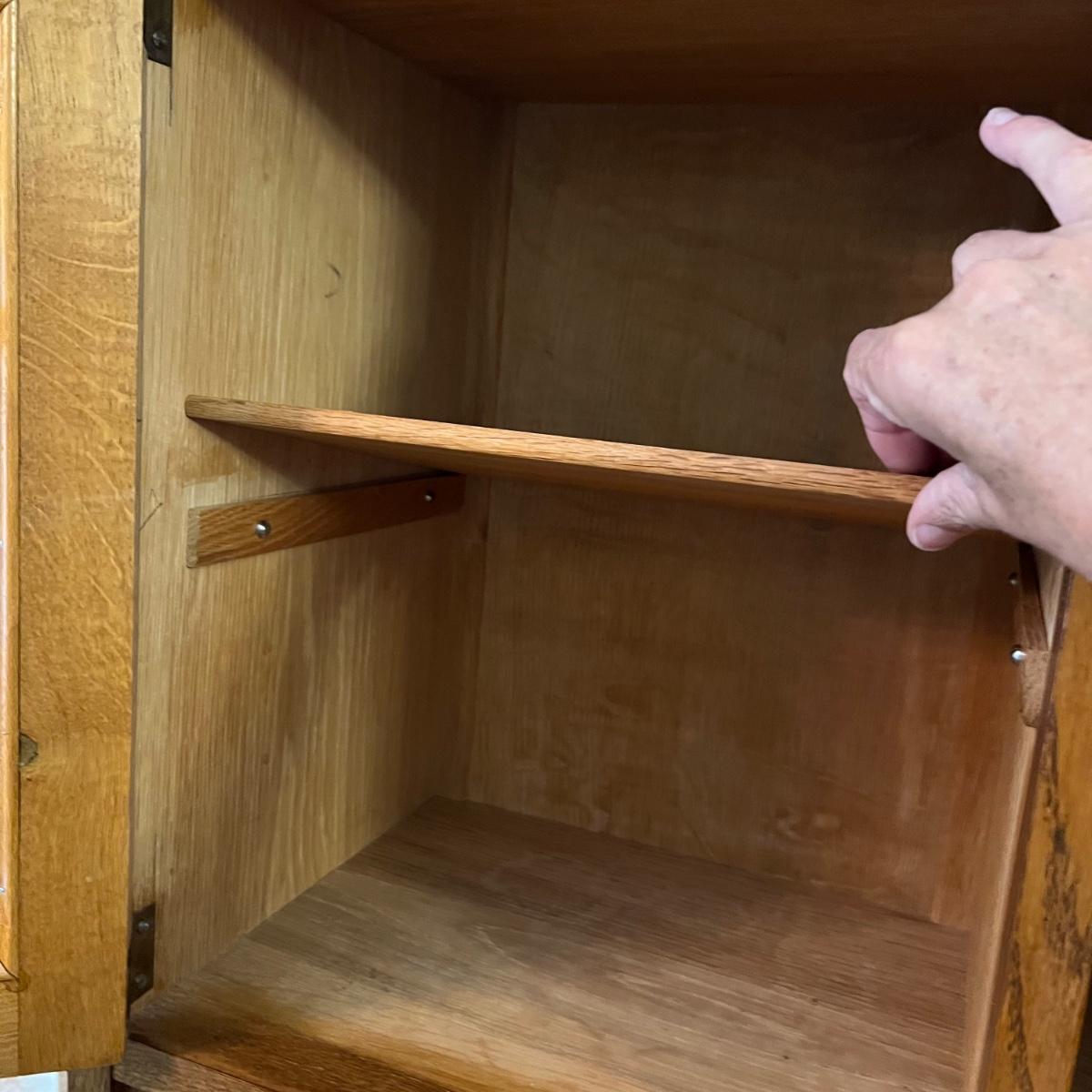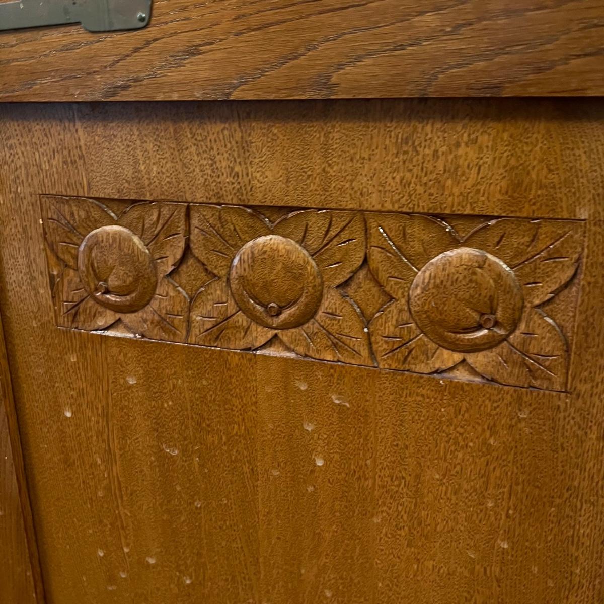 This beautiful hutch has beveled glass panels in the top two doors that flank an open cabinet. The lower section has two doors with carved details and brass hardware that open up to a generously sized single shelf cabinet that has two also generously sized dovetailed drawers above. This hutch is solid wood and appears to be possibly tiger oak with pine interior, likely an import. There is no key. Lock is stuck in locked open, ie the lock sticks out, so you do have to close the doors together simultaneously, but they close without any problem, see image.