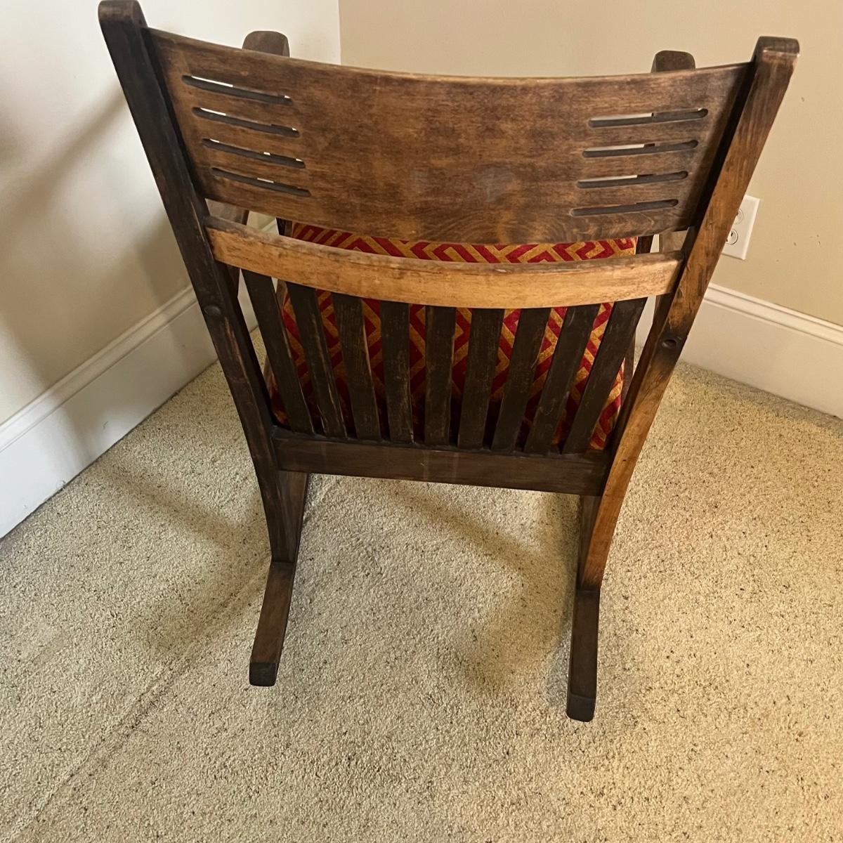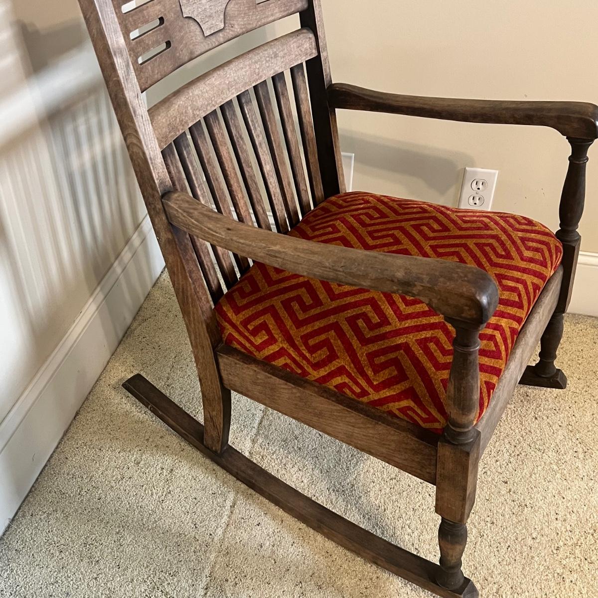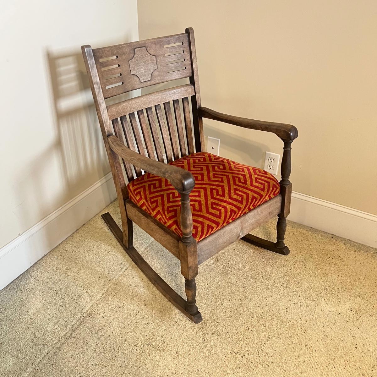 This attractive Arts and Crafts style rocking chair has a red and gold geometric removable cushion. The bottom of the chair has floor protecting pads. Solid wood chair measures 23” x 29.5” x 34”H with a 17.5” seat height.