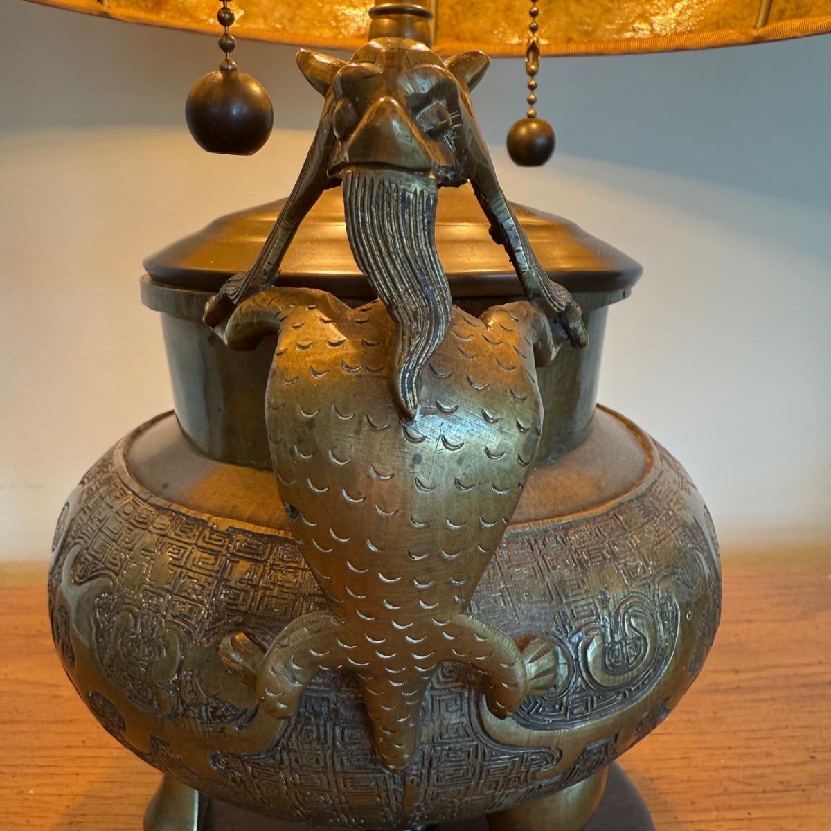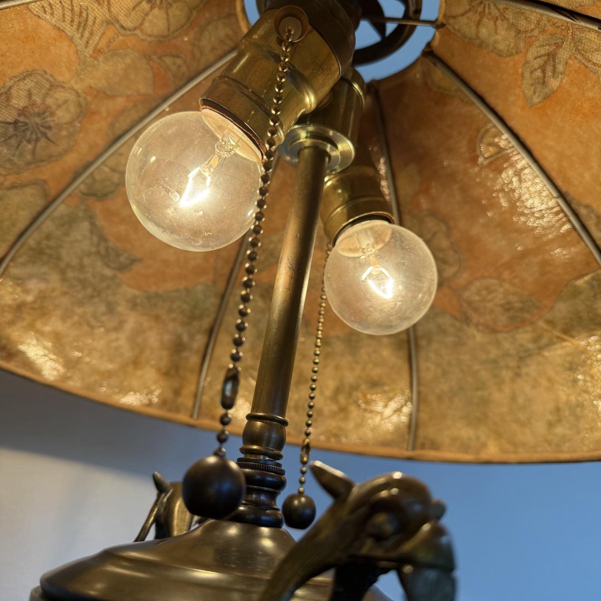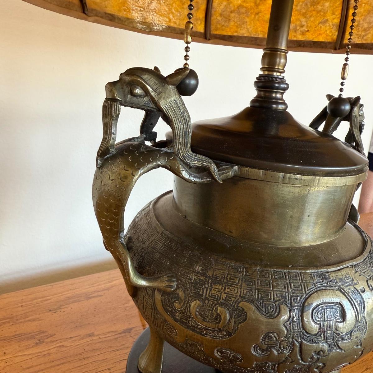 This lot contains a fabulous brass table lamp with what appears to be a mica shade. This unique piece has a wooden base on which a brass body sits with stunning details and two dragon-like figures on either side. The shade is a round shape, when turned on you can see a stunning floral design while enjoying the warmth the mica puts off. The lamp has two pull switches, one on either side that activates its own light bulb, each switch is a one way switch. This item measures 5.5”D at the base and stands 19”H. This item powered on when plugged in. Shipping available.