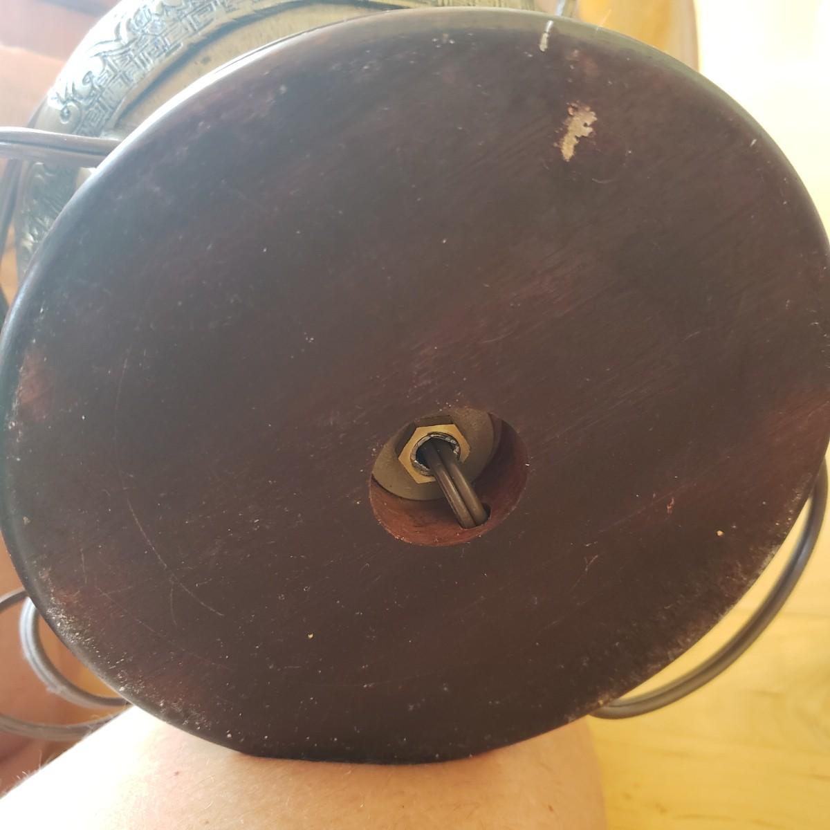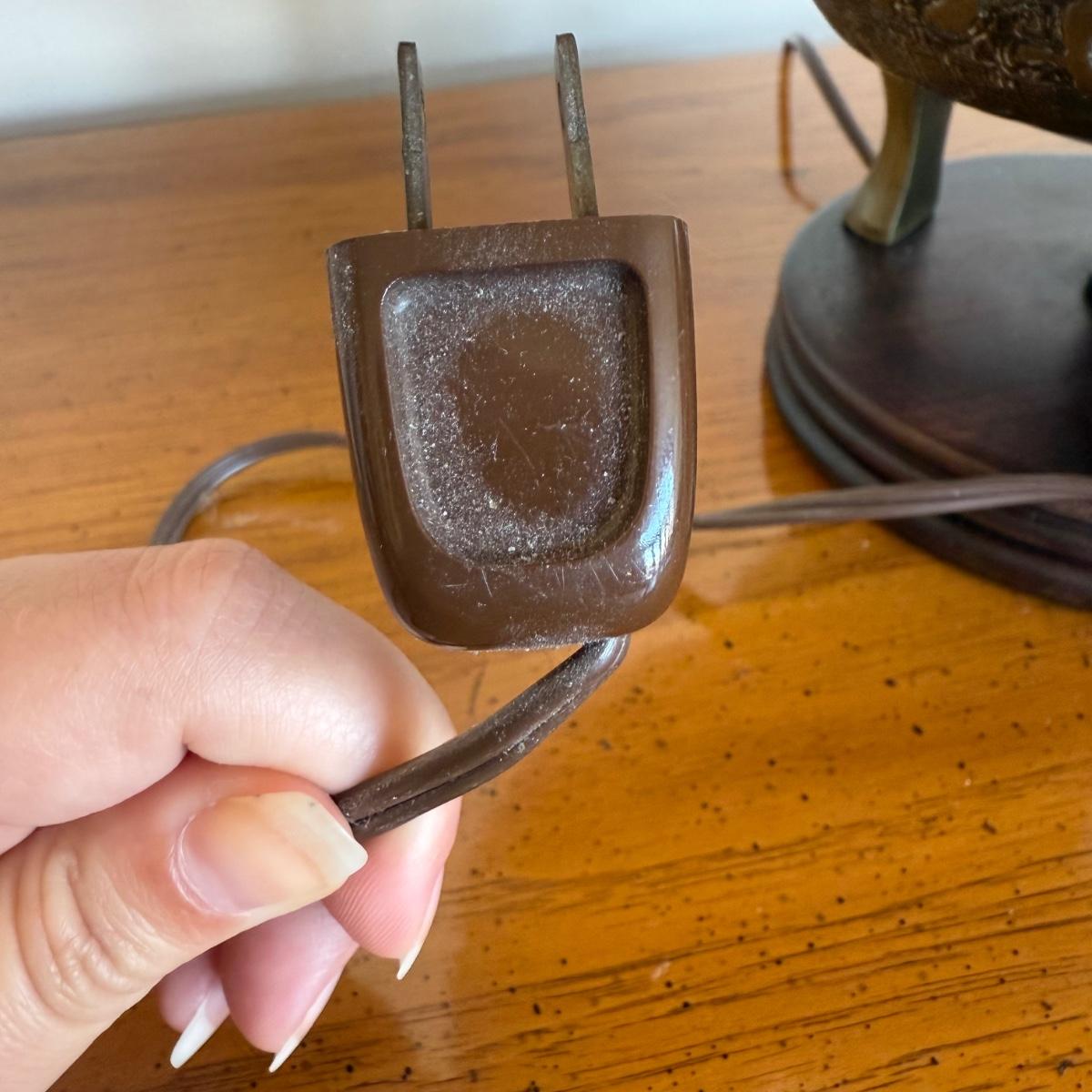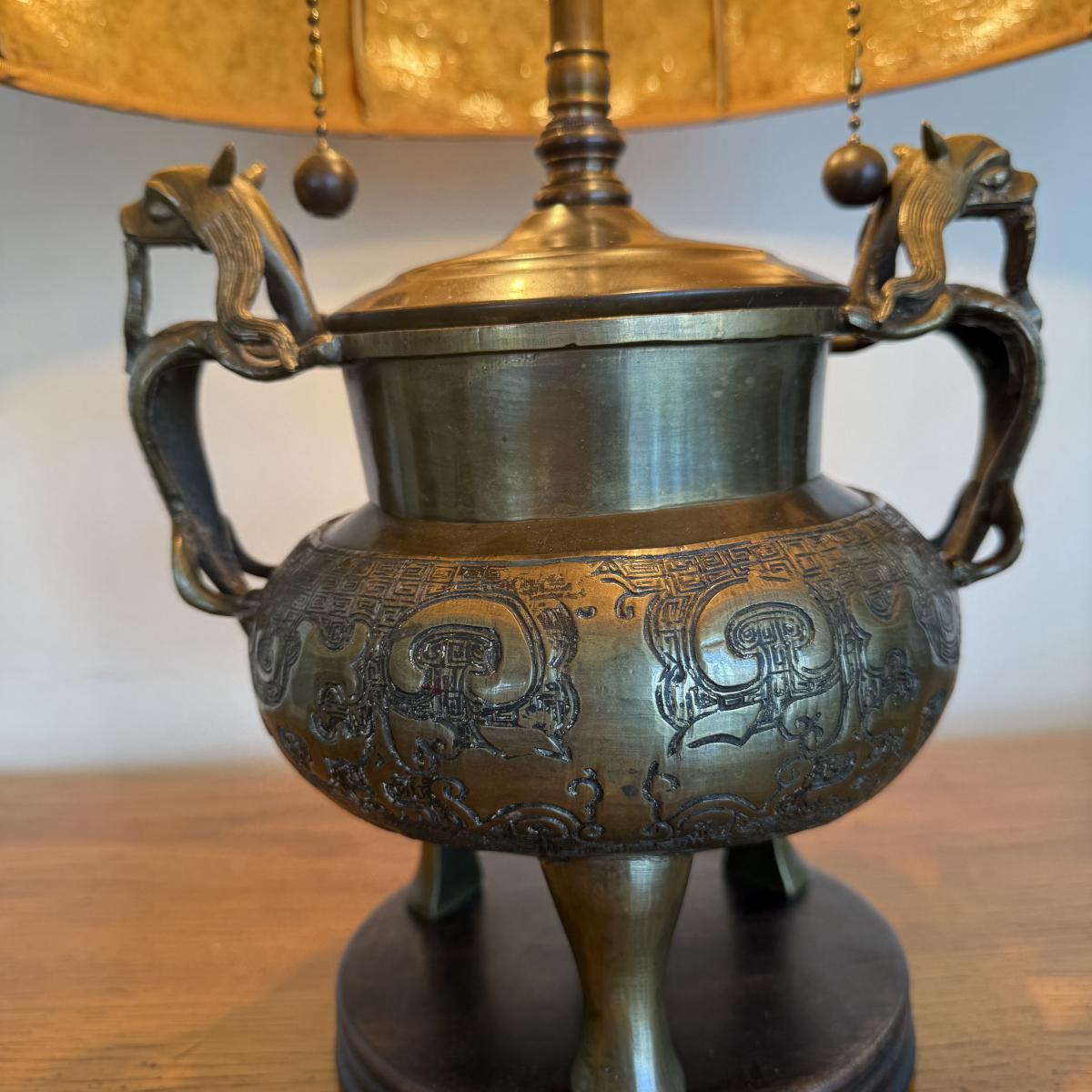 This lot contains a fabulous brass table lamp with what appears to be a mica shade. This unique piece has a wooden base on which a brass body sits with stunning details and two dragon-like figures on either side. The shade is a round shape, when turned on you can see a stunning floral design while enjoying the warmth the mica puts off. The lamp has two pull switches, one on either side that activates its own light bulb, each switch is a one way switch. This item measures 5.5”D at the base and stands 19”H. This item powered on when plugged in. Shipping available.