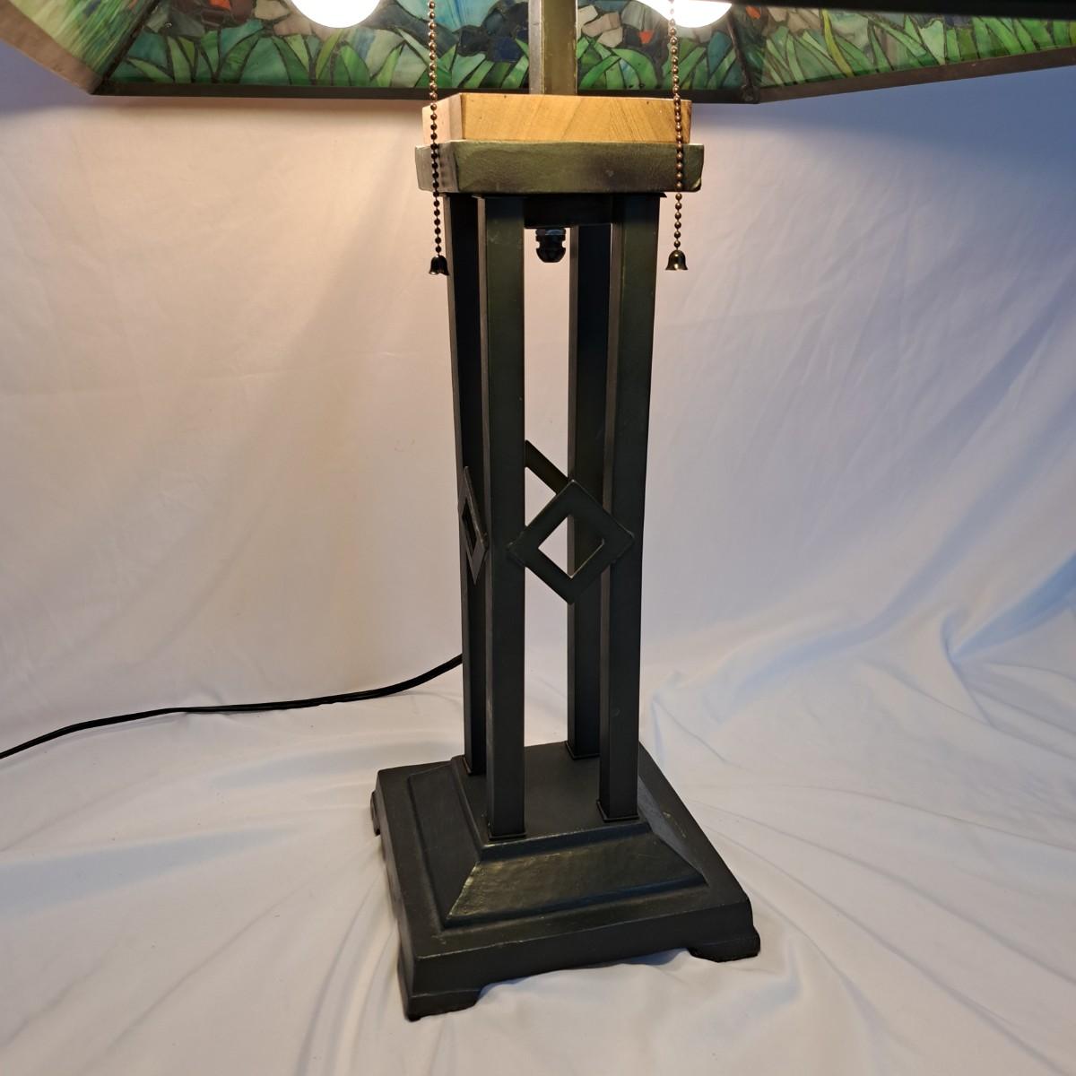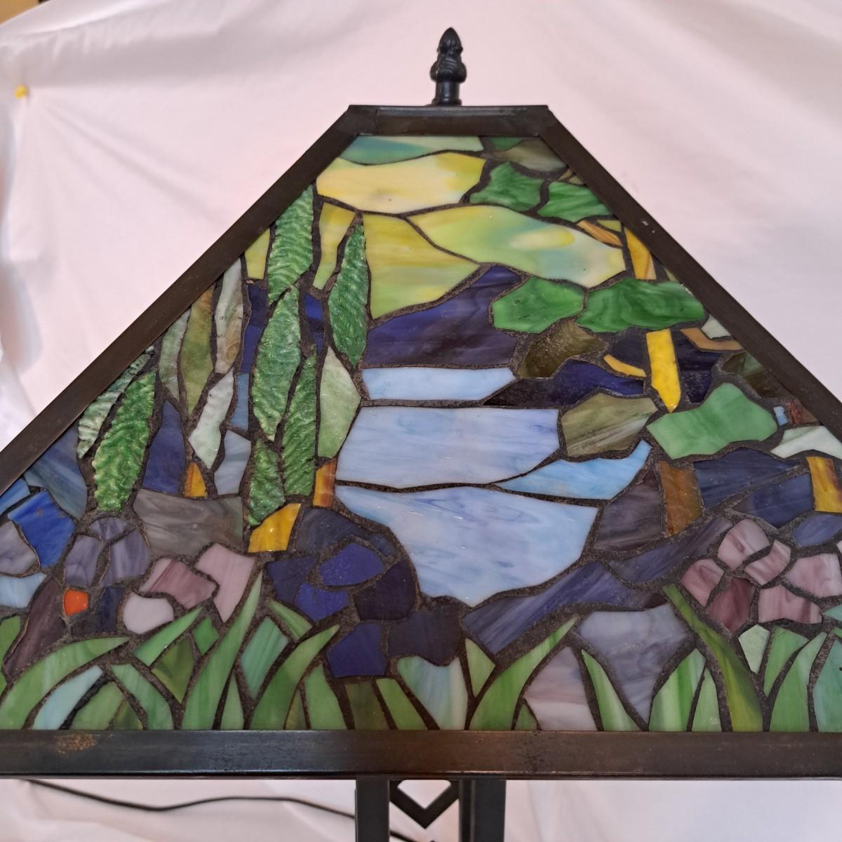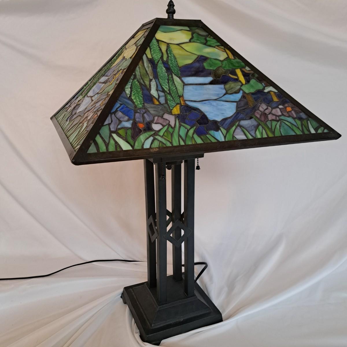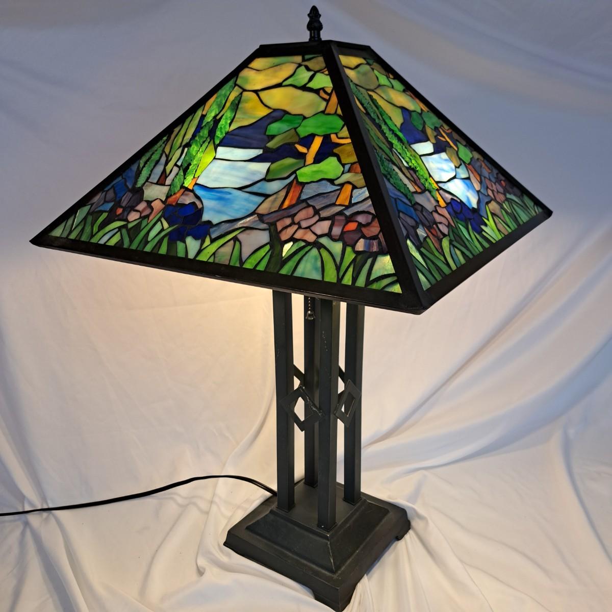 Arts & Crafts-style table lamp, 7" x7.5" (base) x 27.5"H with a four-panel shade that by itself measures 17" panels (width) x 12.5"H. Shade is a wonderful Tiffany-style mosaic design featuring a wooded lake scene. Bottom base is metal with a wood top and three on/off light sockets with metal pulls. Powered on when plugged in. Some surface scratches on base as shown. No maker's mark is visible. This is a very heavy lamp. Shipping is available, but can be costly. We suggest contacting our preferred local shipping provider, Postage Express, with dimensions and getting an estimate before bidding: (828) 255-9250 or shipping@postageexpressnc.com.
