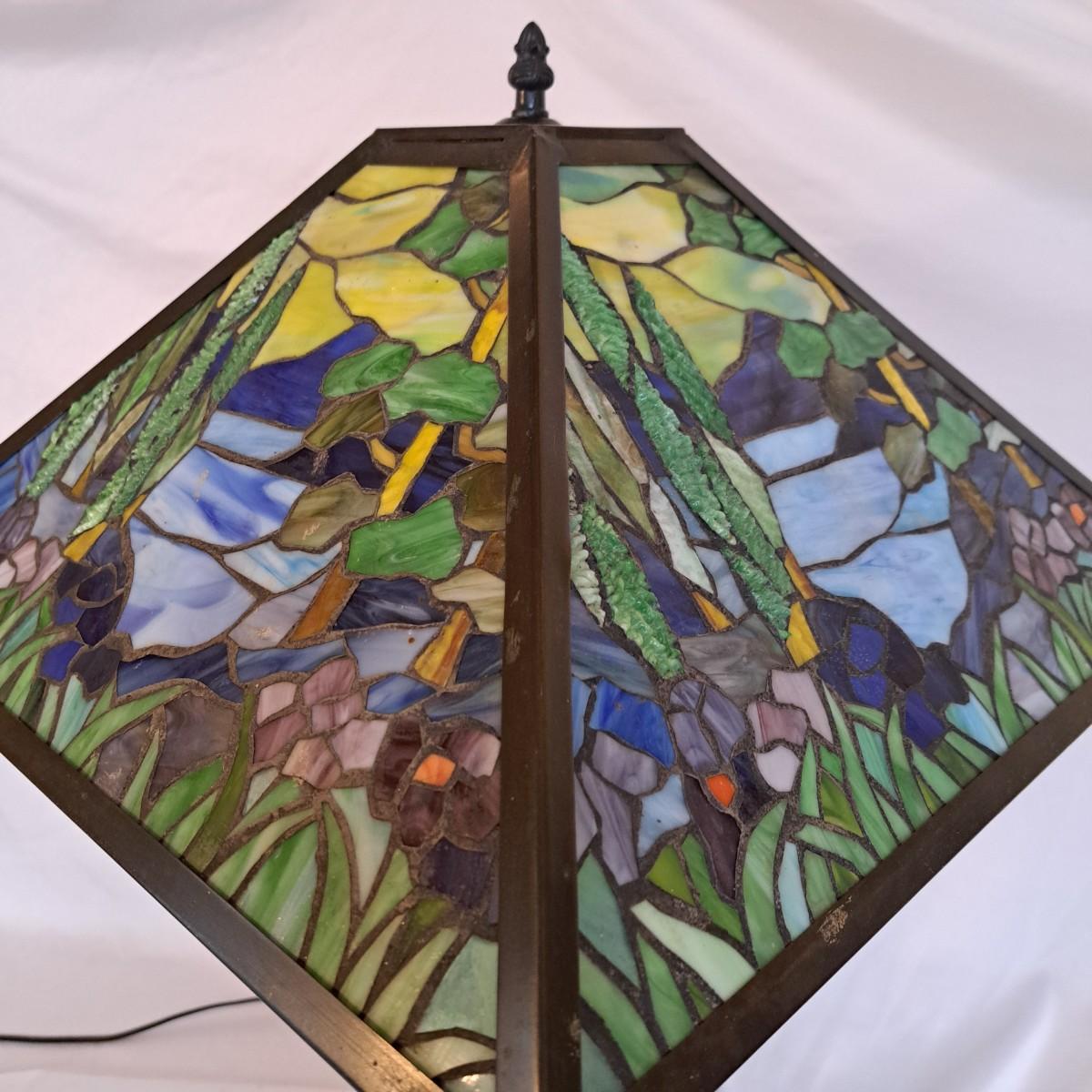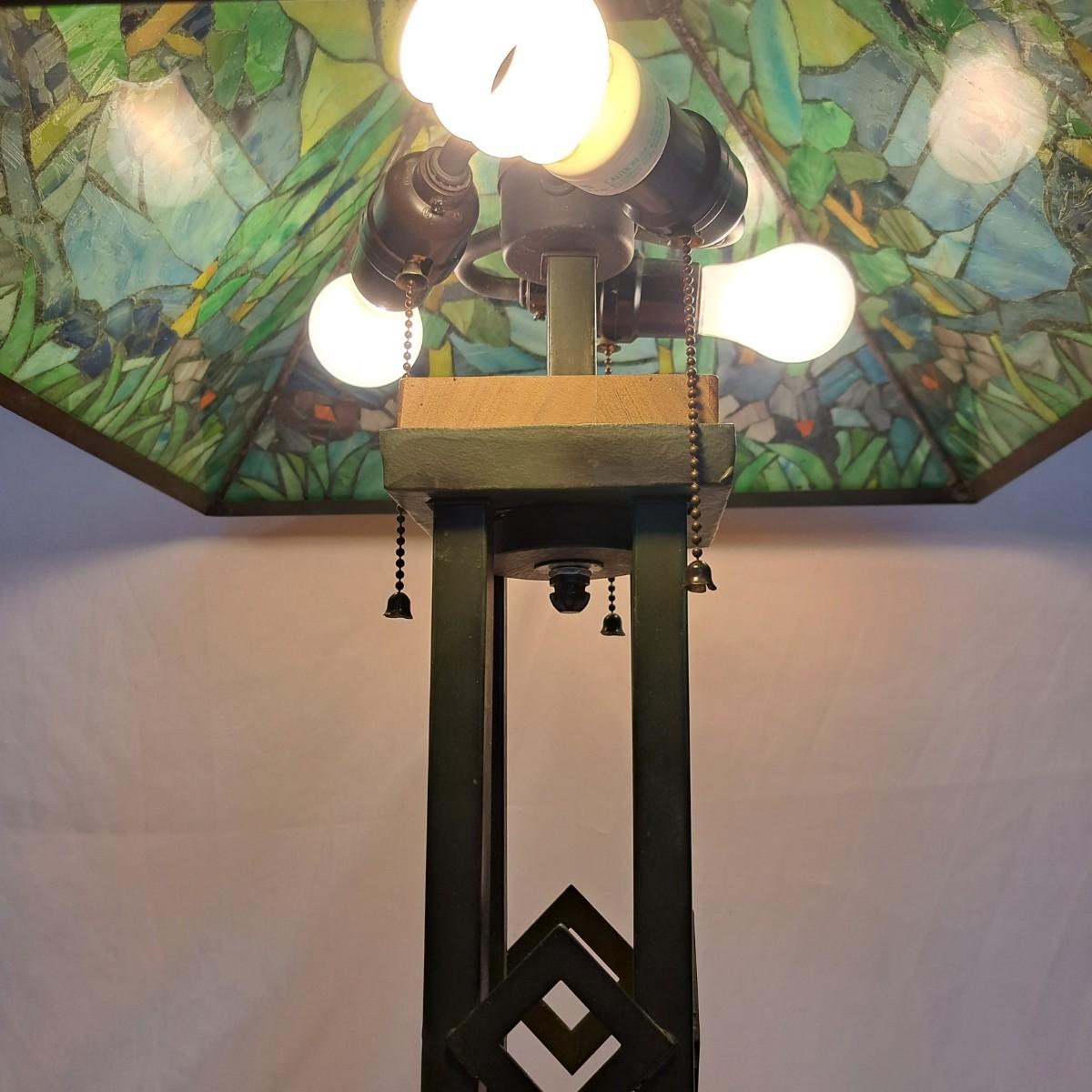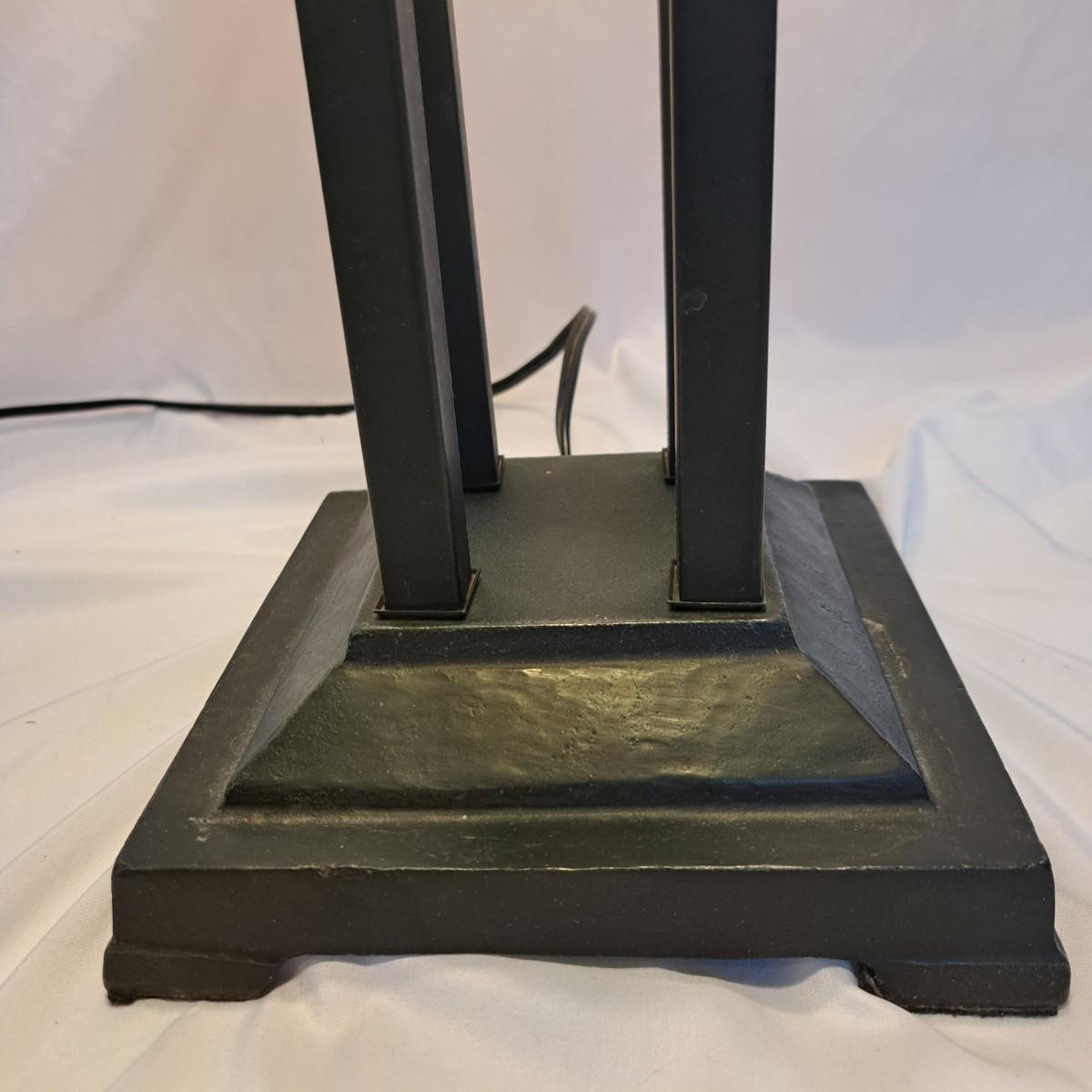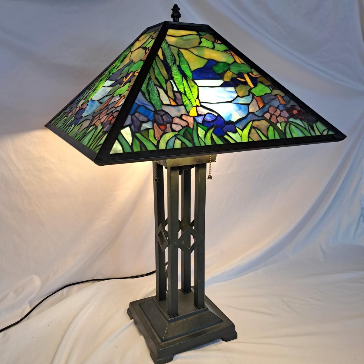 Arts & Crafts-style table lamp, 7" x7.5" (base) x 27.5"H with a four-panel shade that by itself measures 17" panels (width) x 12.5"H. Shade is a wonderful Tiffany-style mosaic design featuring a wooded lake scene. Bottom base is metal with a wood top and three on/off light sockets with metal pulls. Powered on when plugged in. Some surface scratches on base as shown. No maker's mark is visible. This is a very heavy lamp. Shipping is available, but can be costly. We suggest contacting our preferred local shipping provider, Postage Express, with dimensions and getting an estimate before bidding: (828) 255-9250 or shipping@postageexpressnc.com.