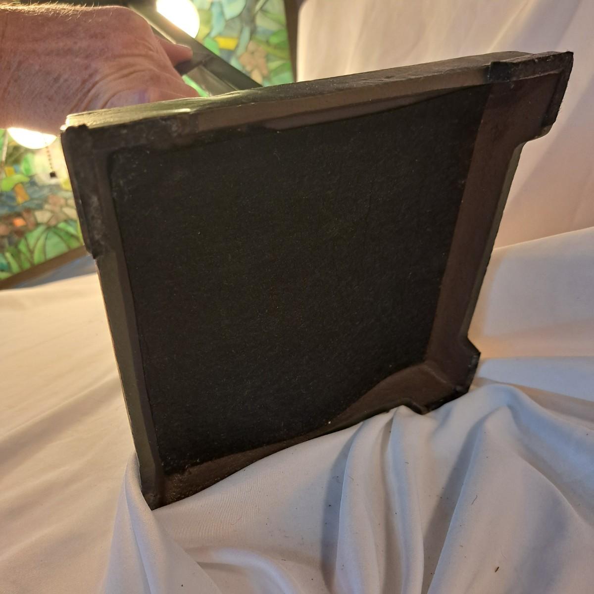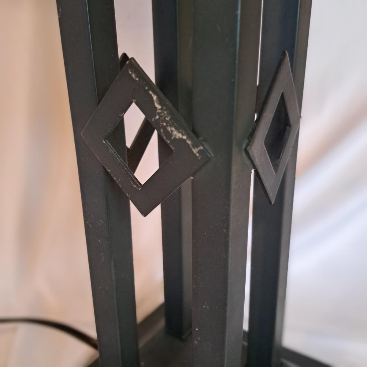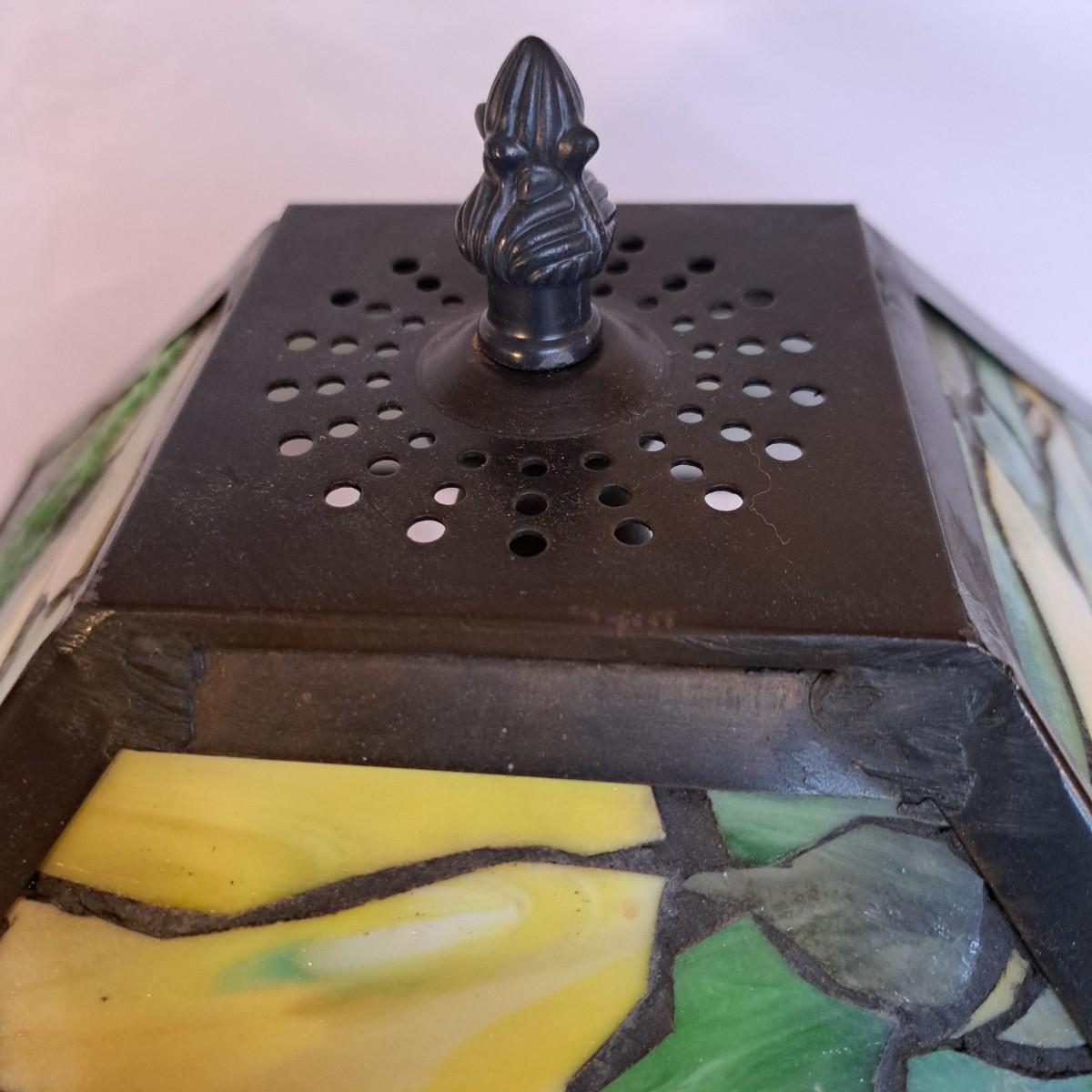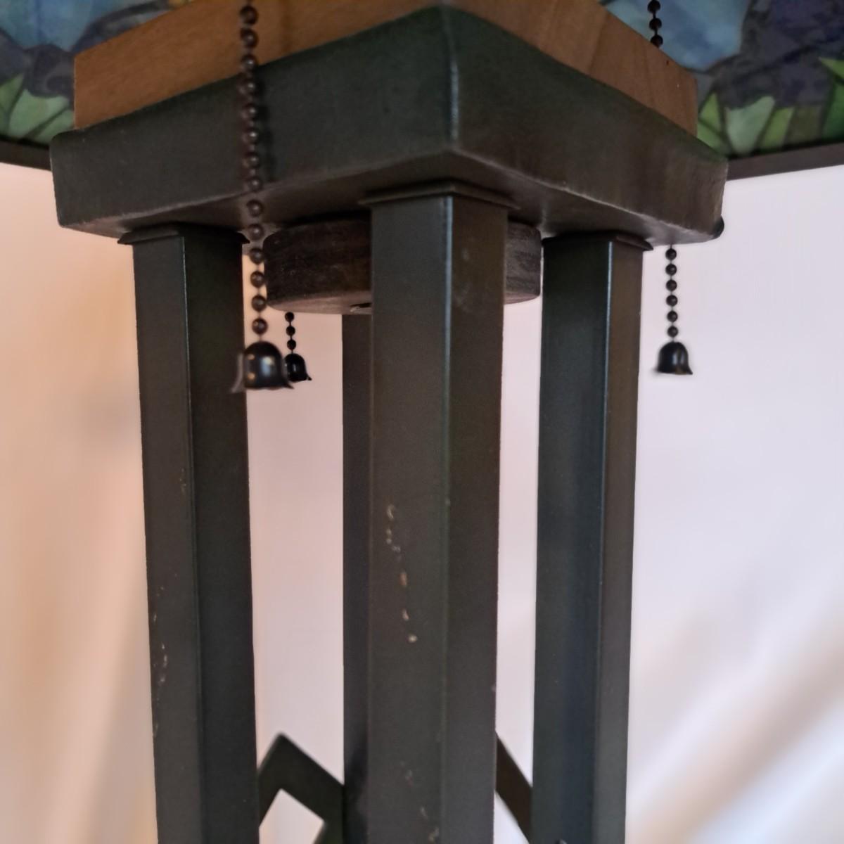 Arts & Crafts-style table lamp, 7" x7.5" (base) x 27.5"H with a four-panel shade that by itself measures 17" panels (width) x 12.5"H. Shade is a wonderful Tiffany-style mosaic design featuring a wooded lake scene. Bottom base is metal with a wood top and three on/off light sockets with metal pulls. Powered on when plugged in. Some surface scratches on base as shown. No maker's mark is visible. This is a very heavy lamp. Shipping is available, but can be costly. We suggest contacting our preferred local shipping provider, Postage Express, with dimensions and getting an estimate before bidding: (828) 255-9250 or shipping@postageexpressnc.com.