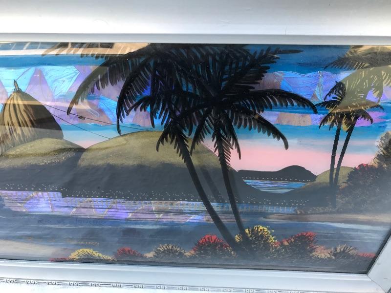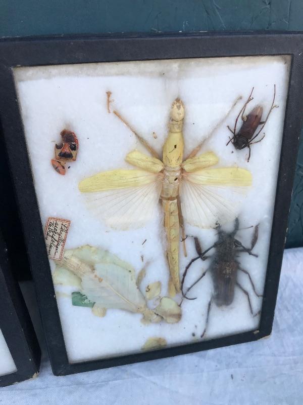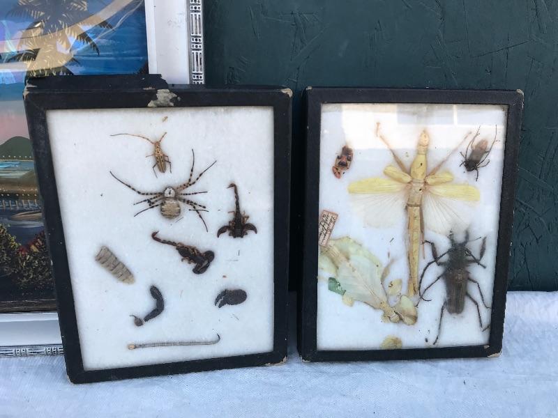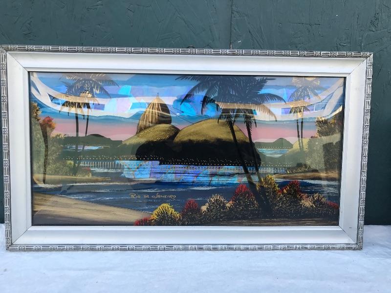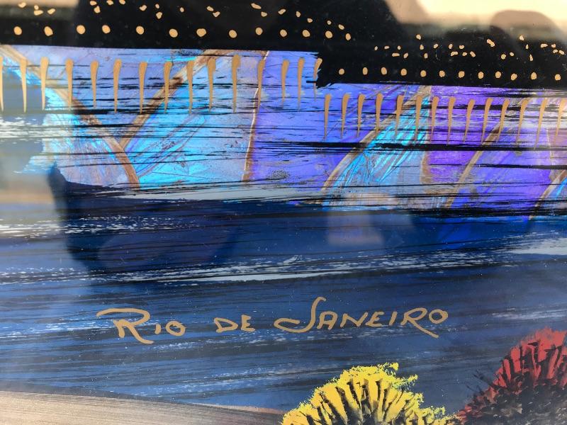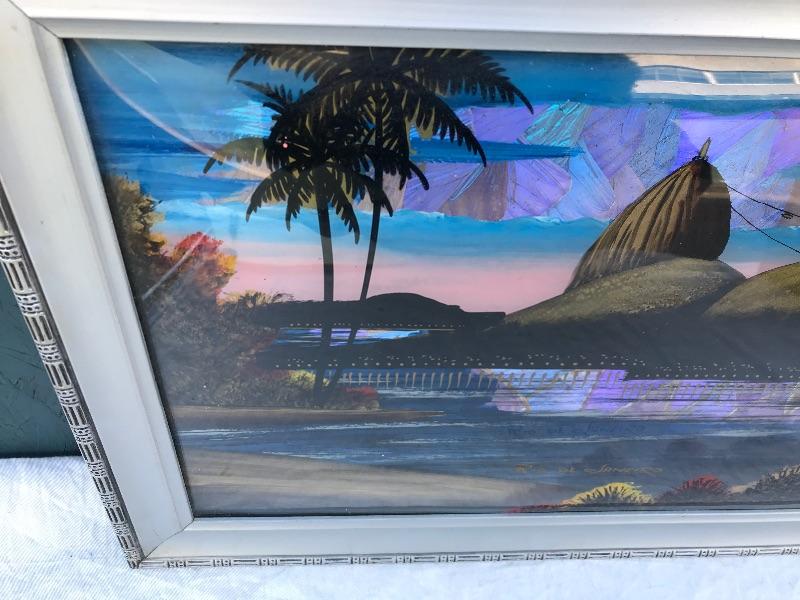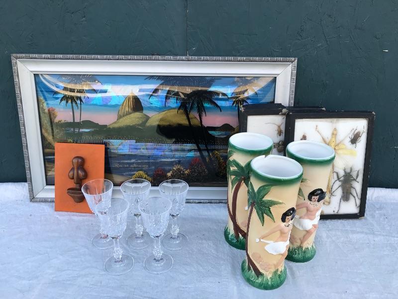 This Rio de Janeiro framed piece is a reverse glass painting with genuine iridescent butterfly wings. It is 22.5" x 12.5". Included are 3 mid century "Sail with Harvey's" ceramic hand painted hula glasses. There is a chip in one of them. There are two insect taxidermy pieces. There is a set of 5 crystal cordial glasses in perfect condition. Lastly, there is a small wood carving by Grace Jones from 1972.