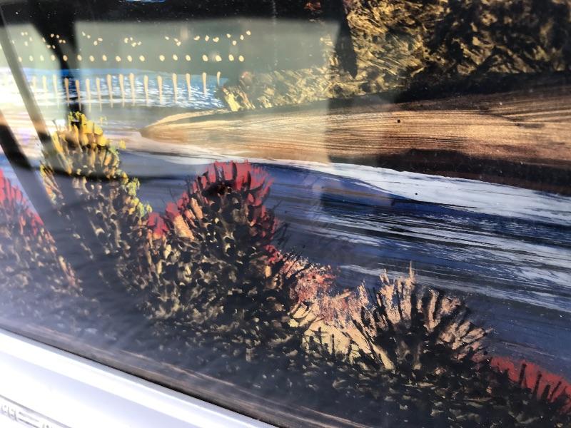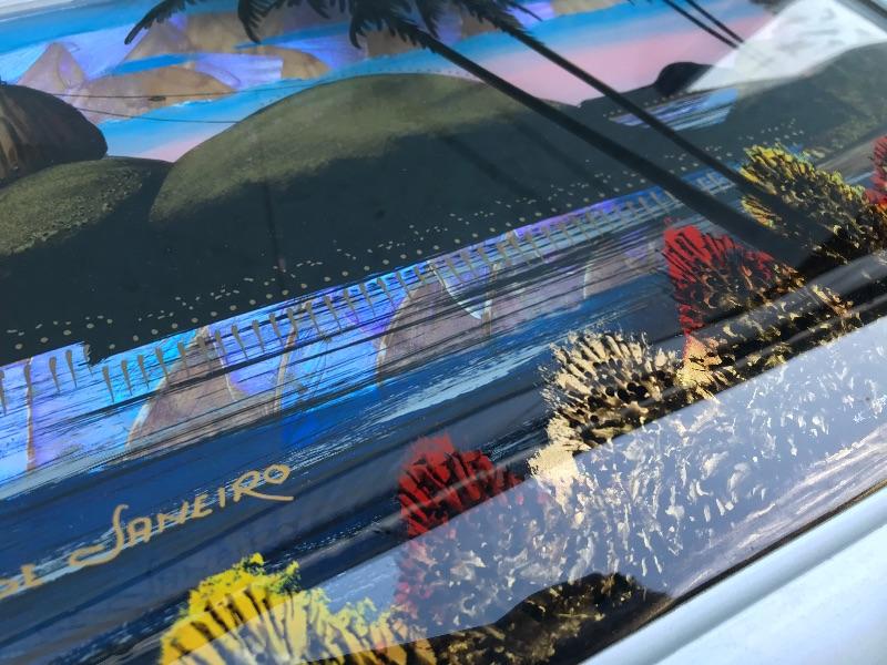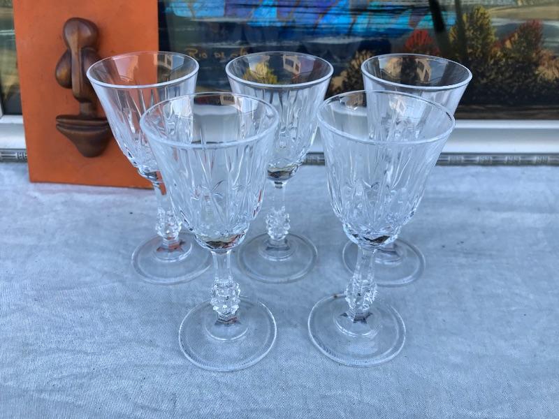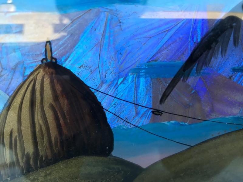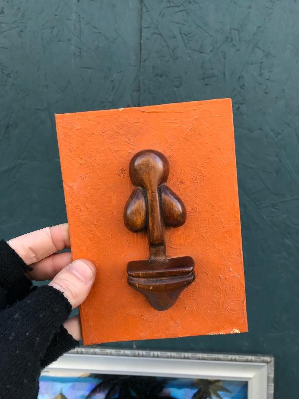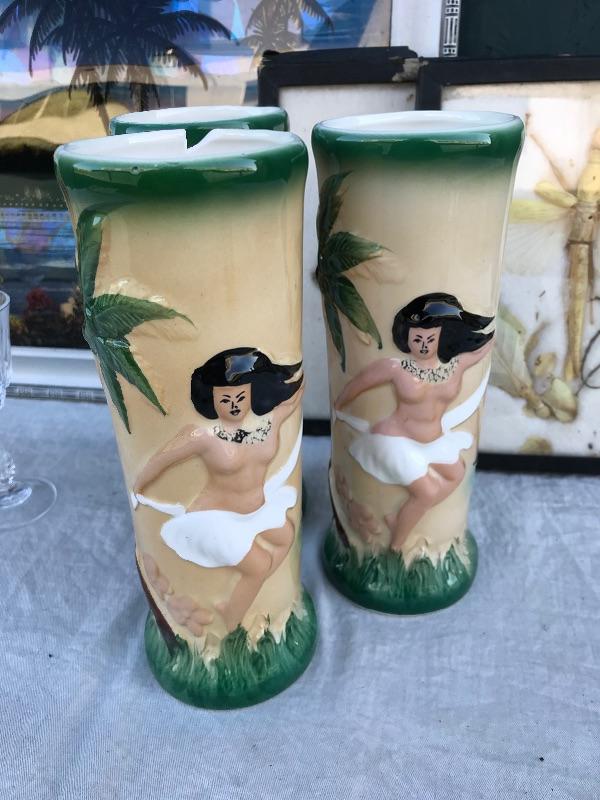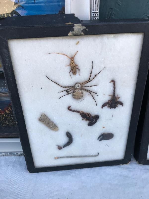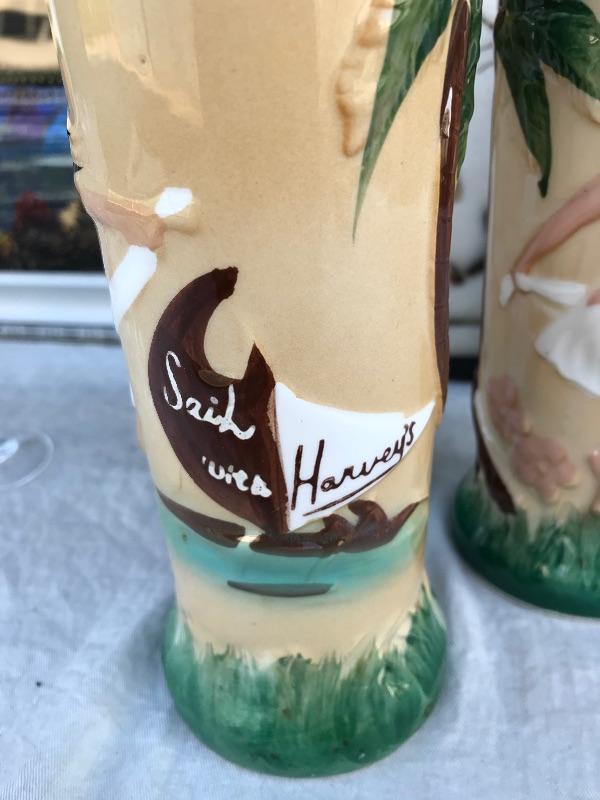 This Rio de Janeiro framed piece is a reverse glass painting with genuine iridescent butterfly wings. It is 22.5" x 12.5". Included are 3 mid century "Sail with Harvey's" ceramic hand painted hula glasses. There is a chip in one of them. There are two insect taxidermy pieces. There is a set of 5 crystal cordial glasses in perfect condition. Lastly, there is a small wood carving by Grace Jones from 1972.