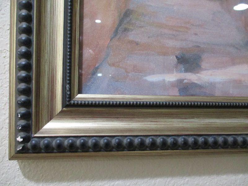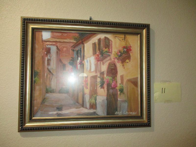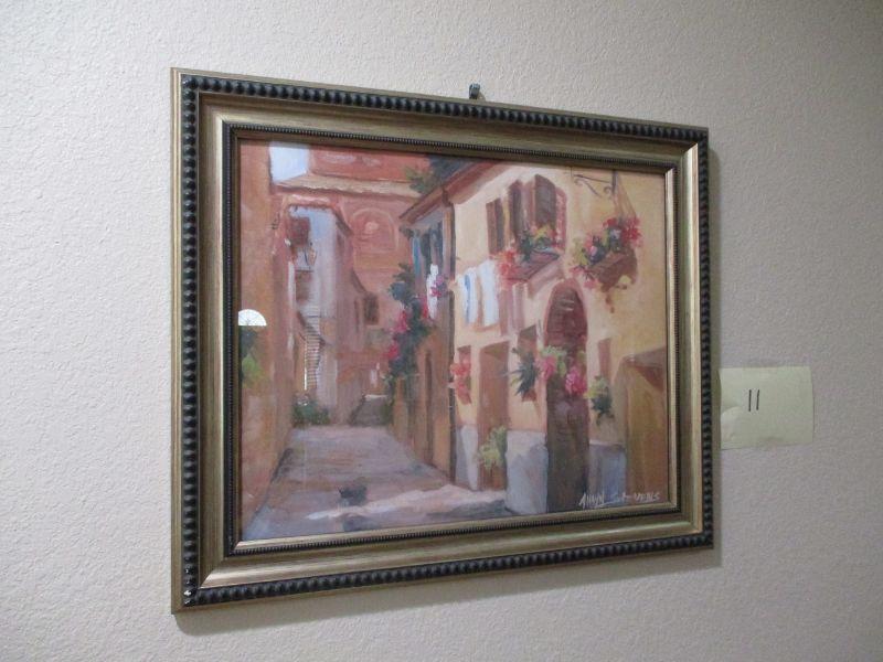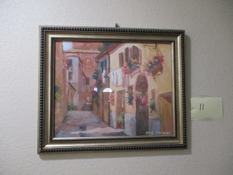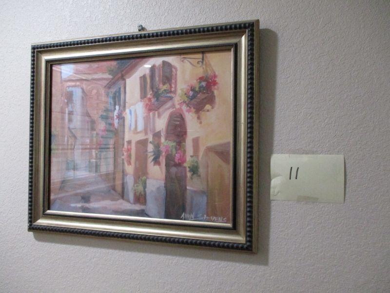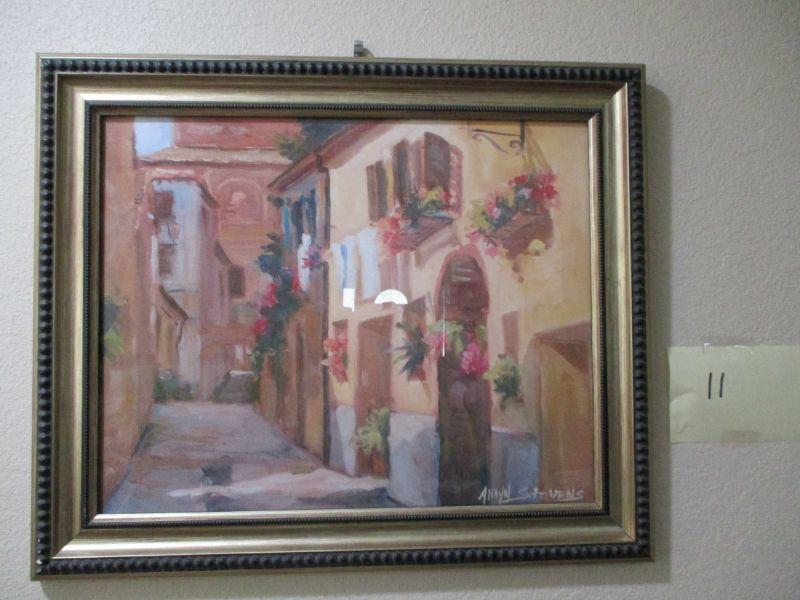 Small framed artwork by Allayn Stevens. Approx 24in width. 20in height. Small nick on frame.