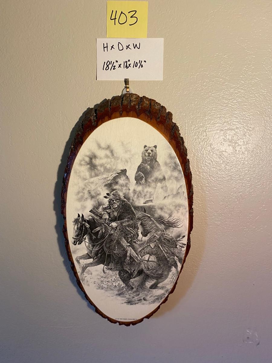 Oval tree stump slice art bear, horse and rider Lake Shasta Caverns by O'Brien California