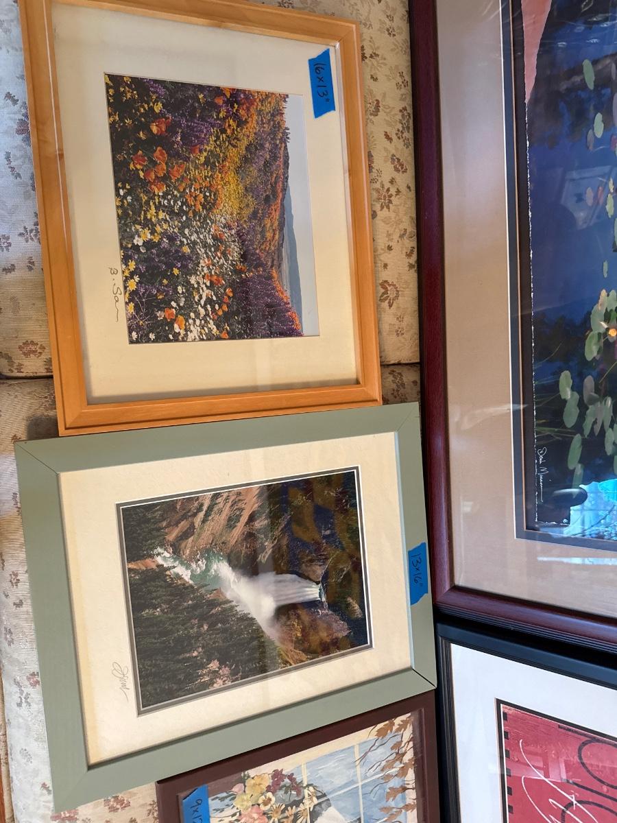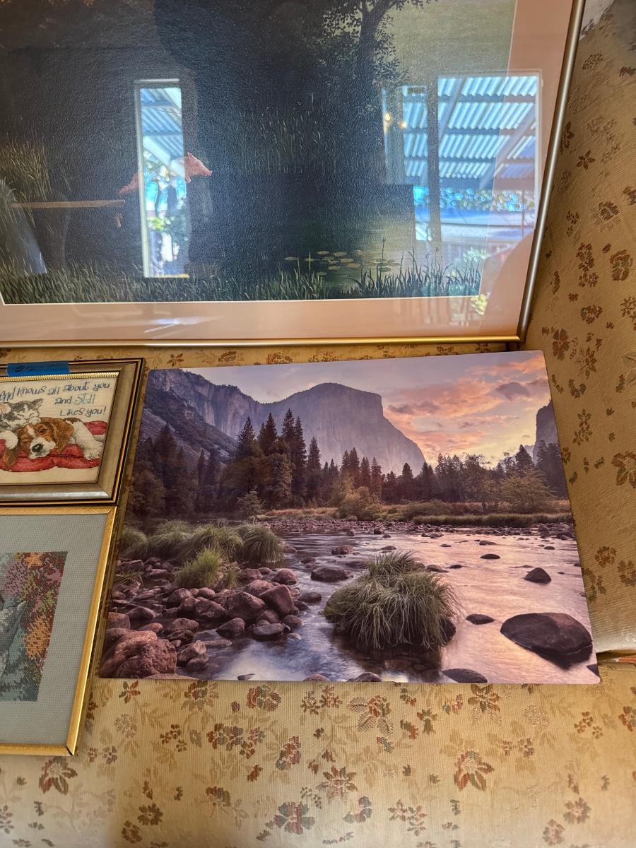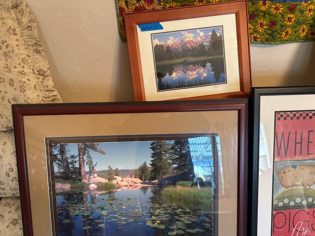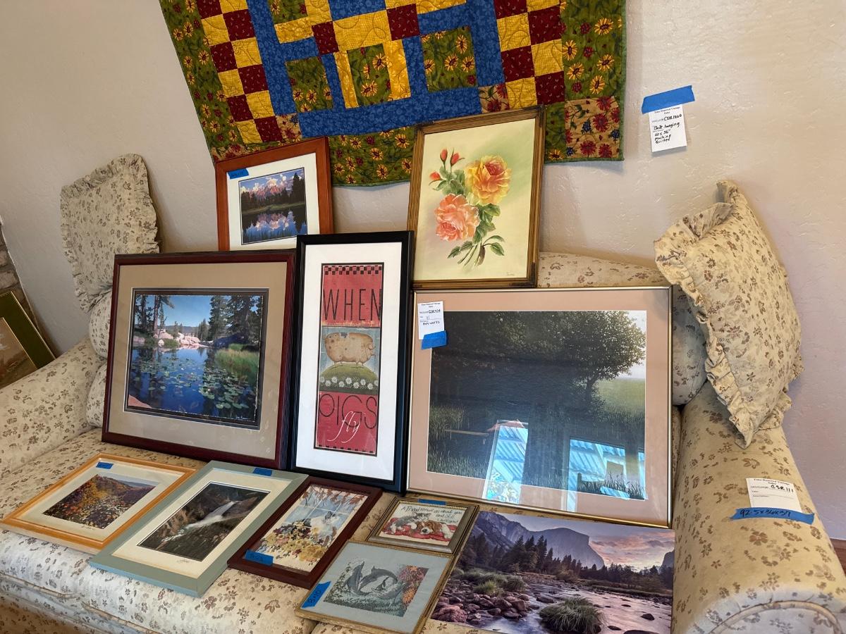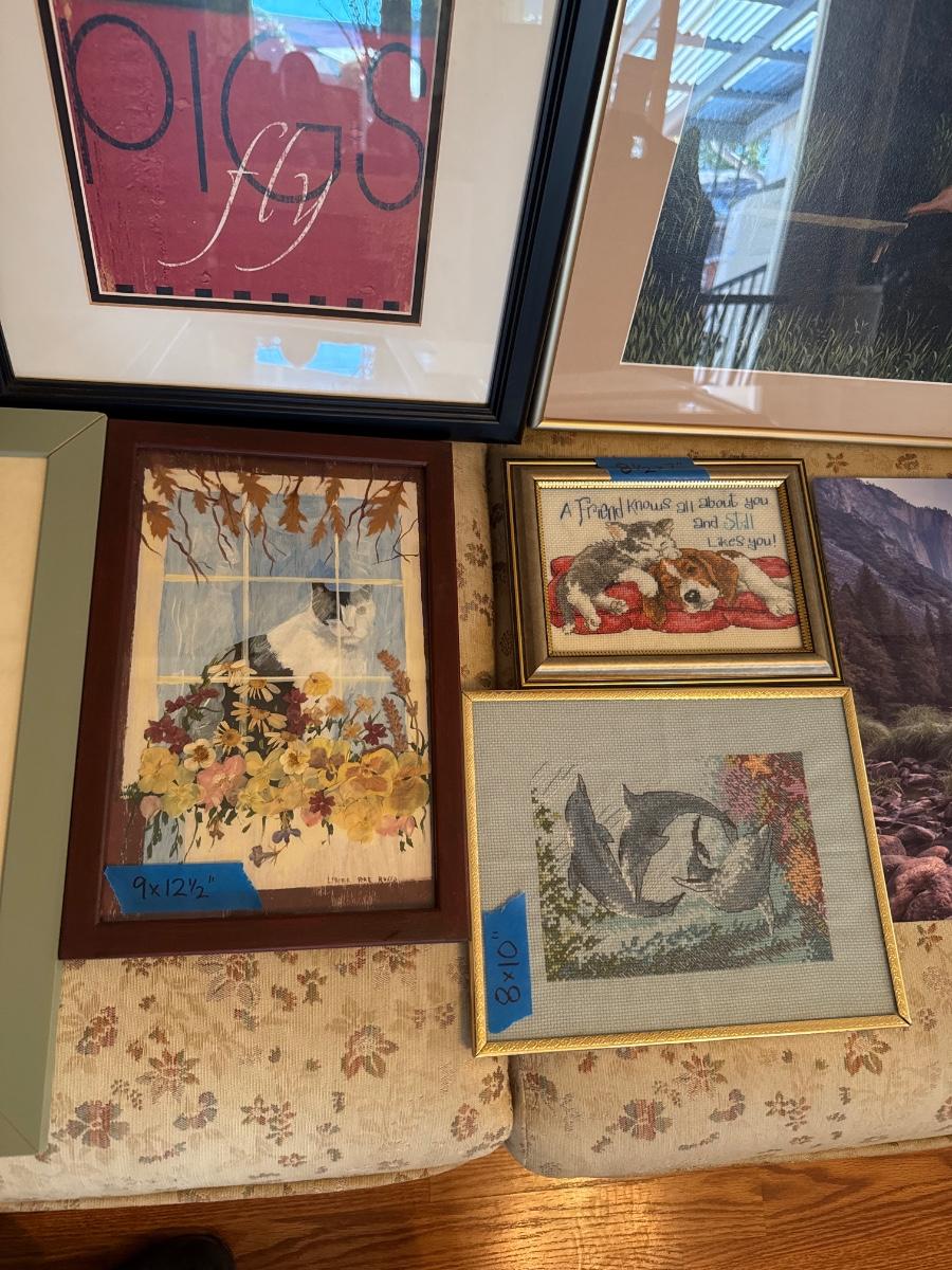 Needle point , prints framed wall art, Quilt is in another lot no shipping