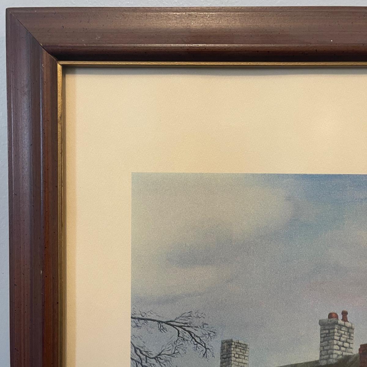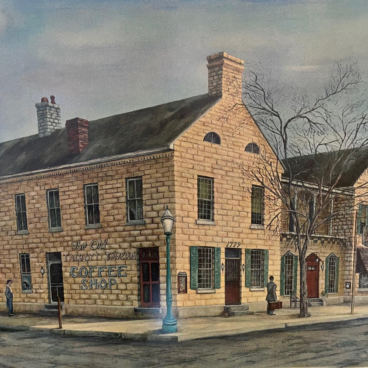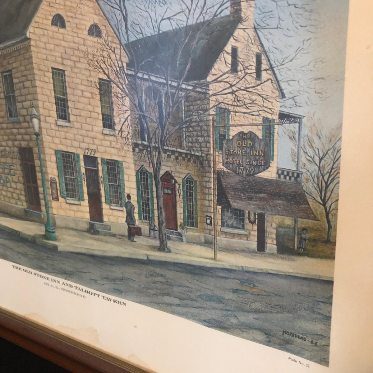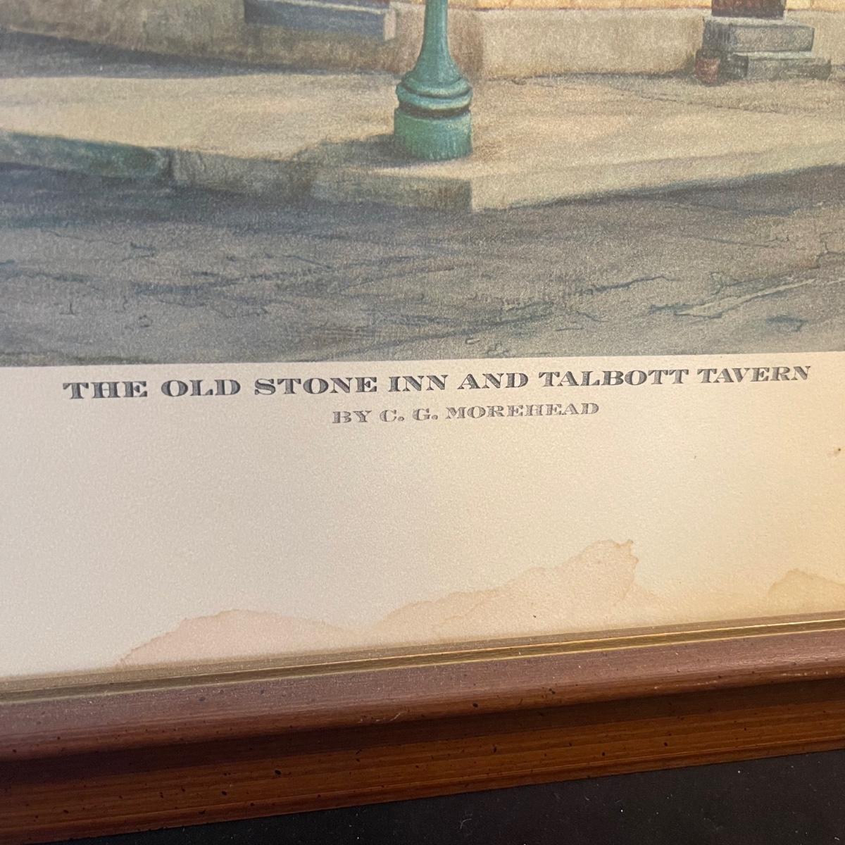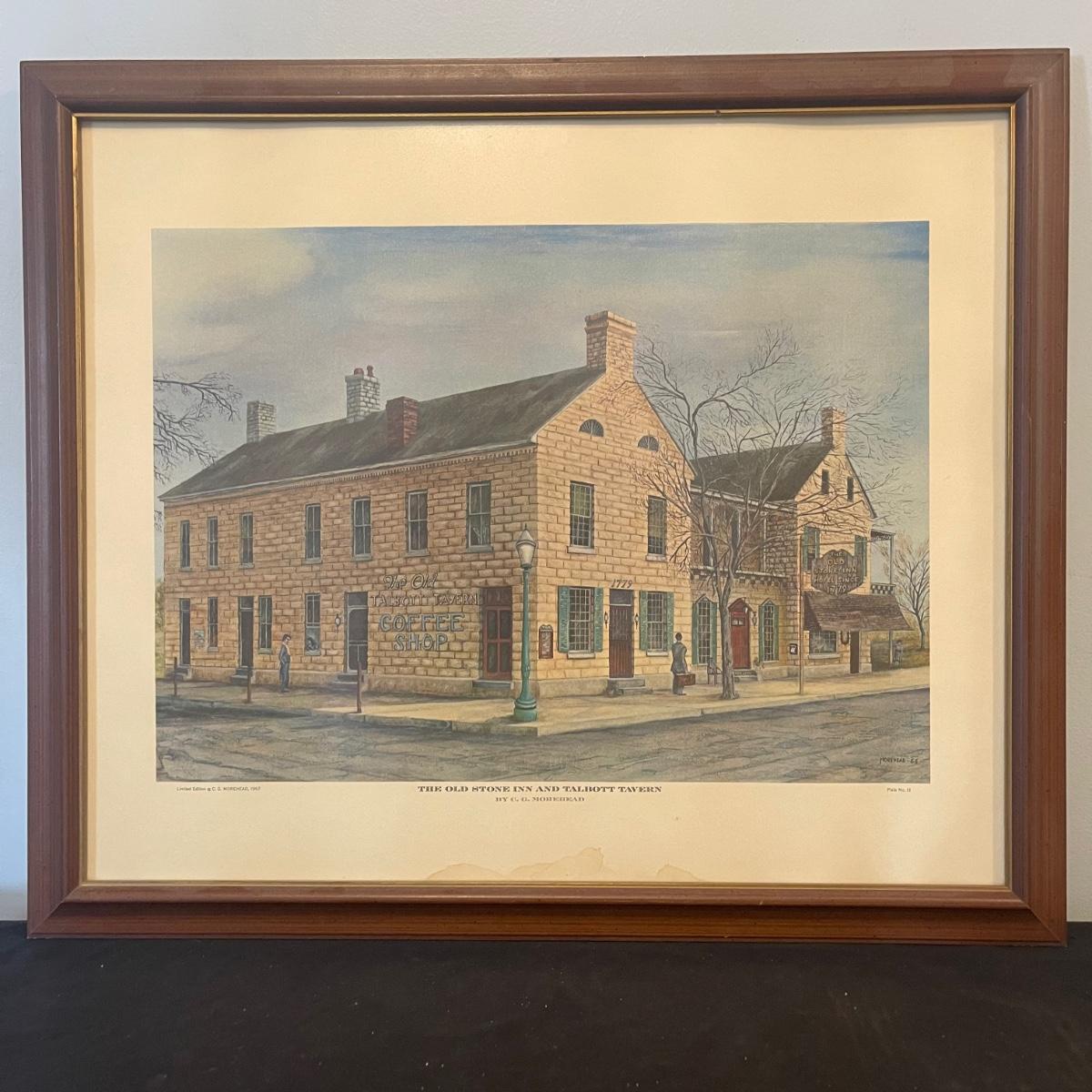 “The Old Stone Inn and Talbott Tavern” by C.C. Morehead. It is a 1967 limited edition. It measures just under 23” x 27”. The glass of the frame has a slight texture and there is some discoloration at the bottom of the art.