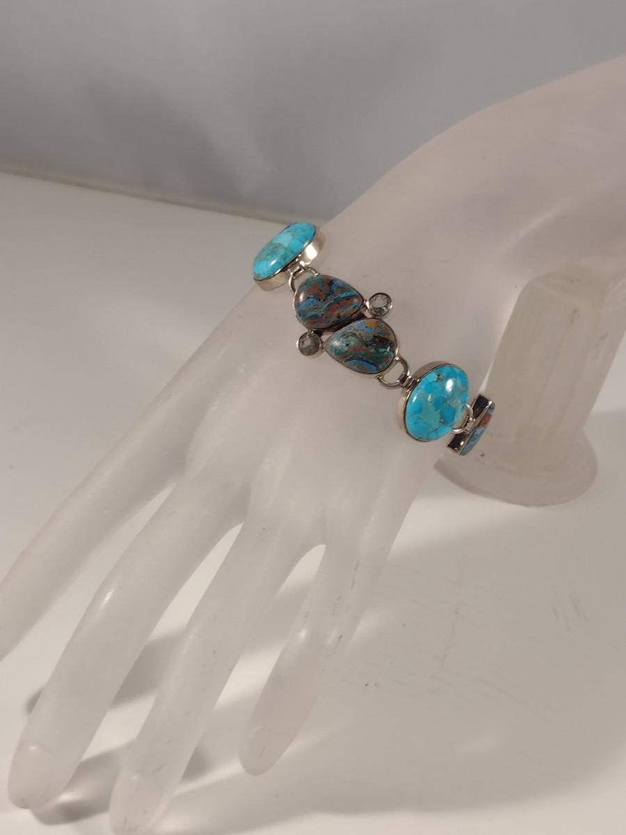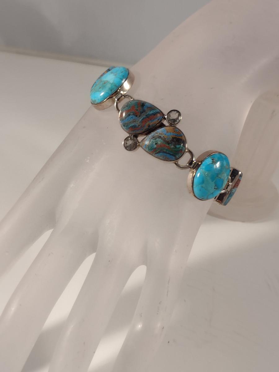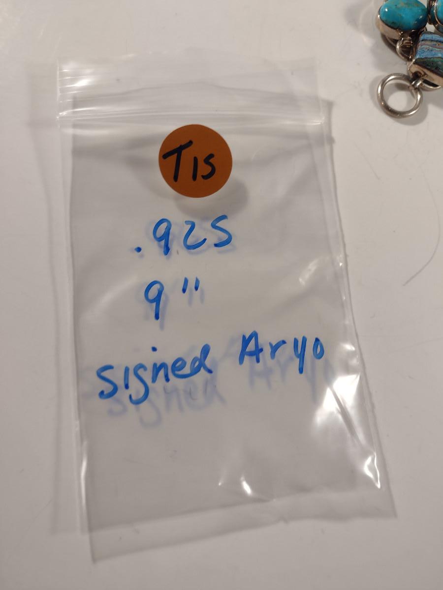 Arya Sterling Silver and Multi Stone Bracelet- Approx 9" and (T15). Stones are possibly turquoise, rainbow calsilica, and white topaz.
