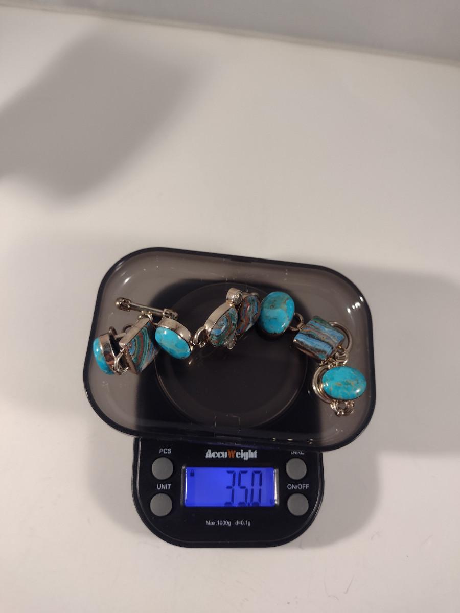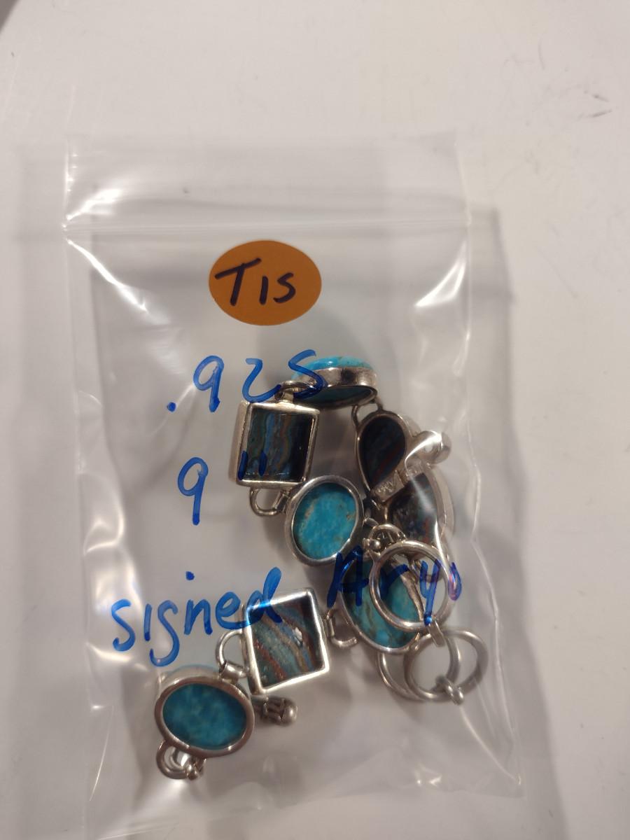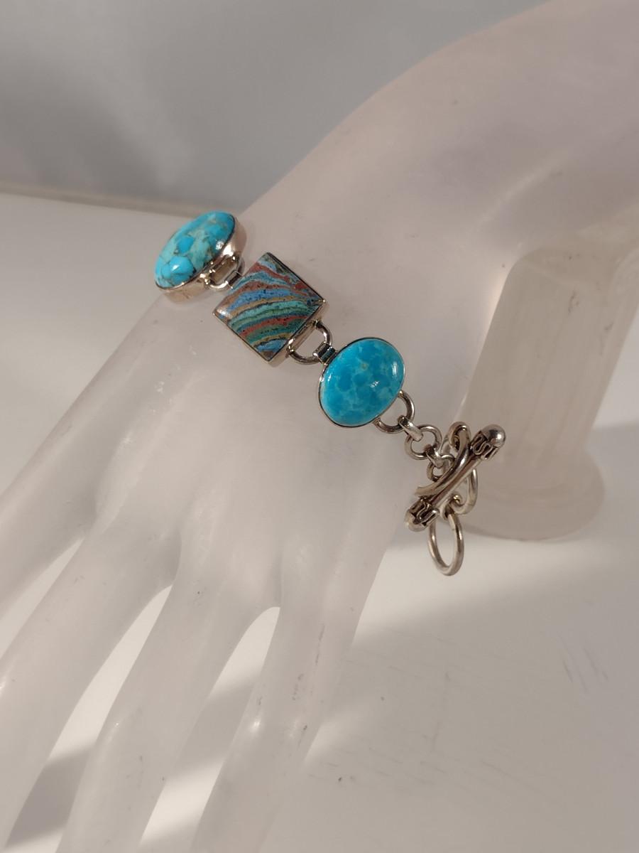 Arya Sterling Silver and Multi Stone Bracelet- Approx 9" and (T15). Stones are possibly turquoise, rainbow calsilica, and white topaz.