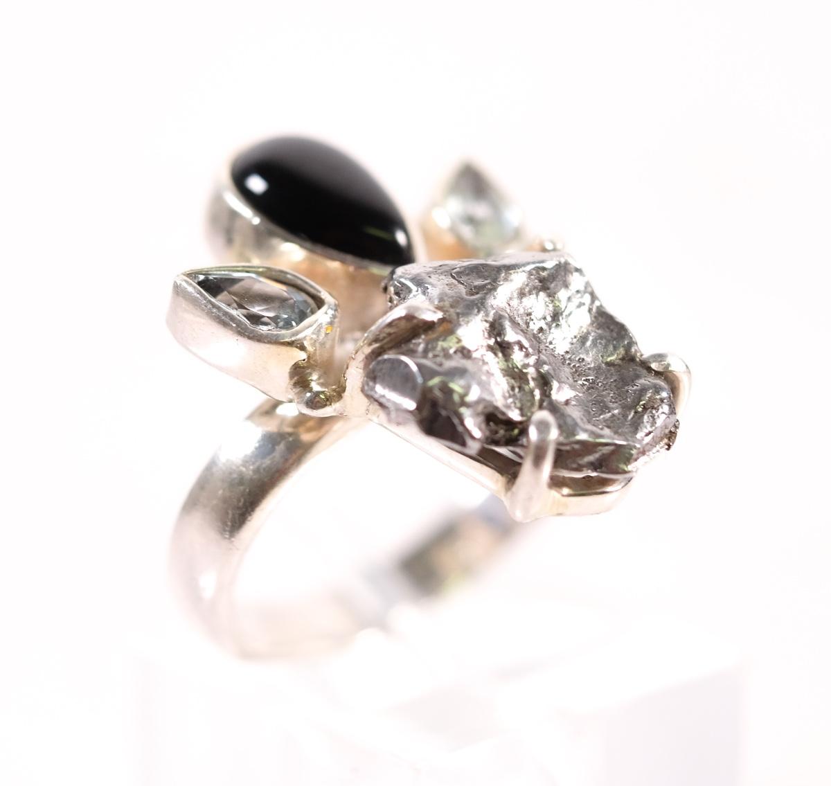 Sterling Meteorite & Topaz Ring, AS IS, the ring band is very bent, shown in last photo. Weighs approx. 6.5 grams.Stamped 925.