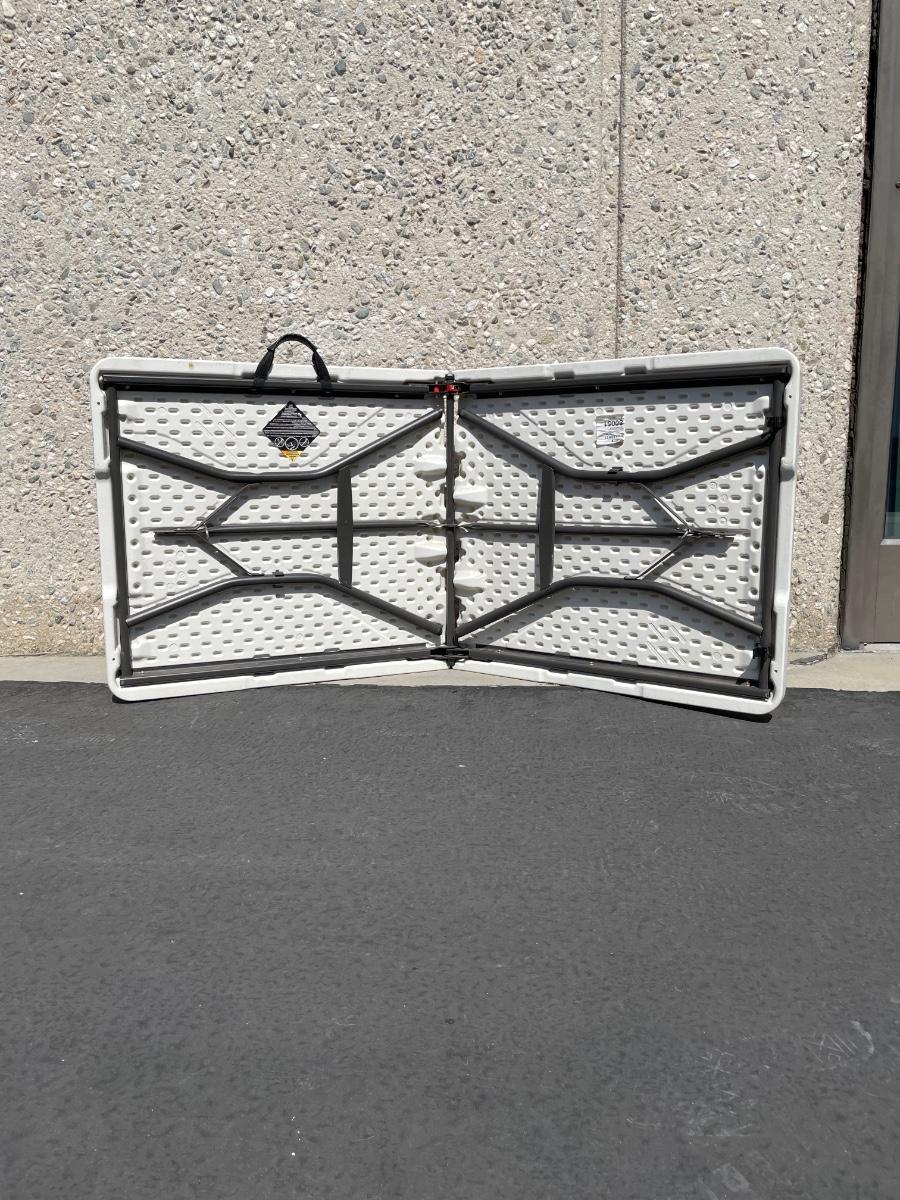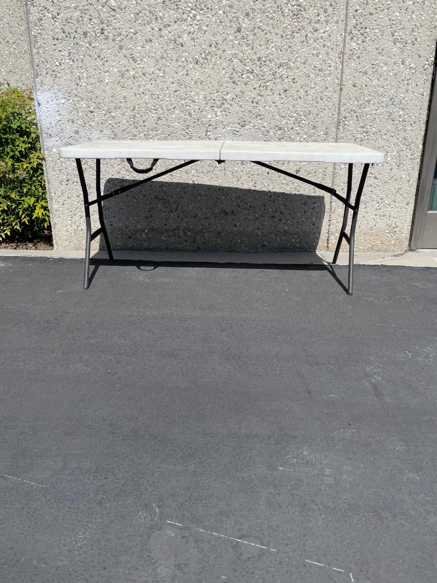 White folding table by Lifetime, model 80051. Steel frame and folding legs. When set up table measures approx. 60” long by 27” wide.
