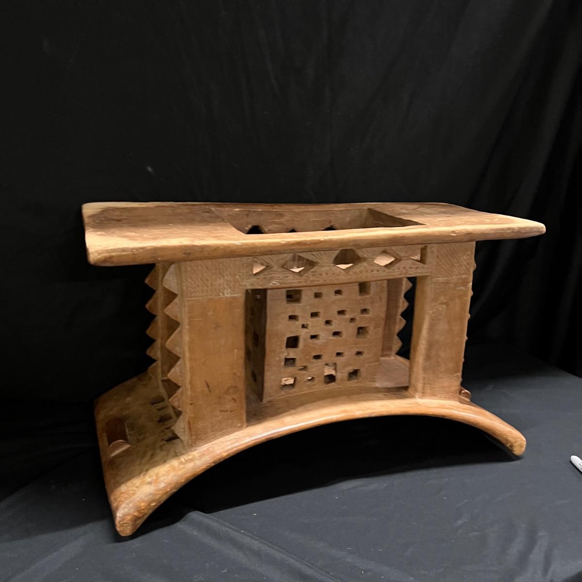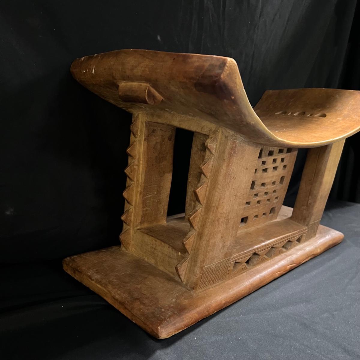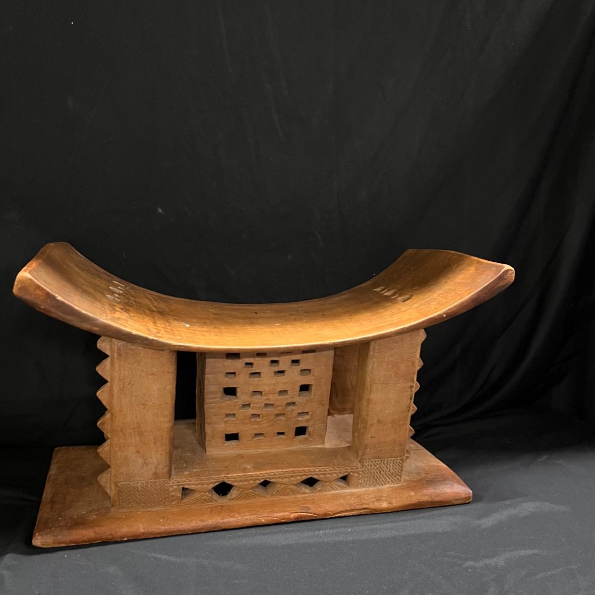 This beautiful piece appears to be an Asante style stool. It's a lightweight wood (one small blemish and a minor small crack shown in a pics). It has carved details, see images.