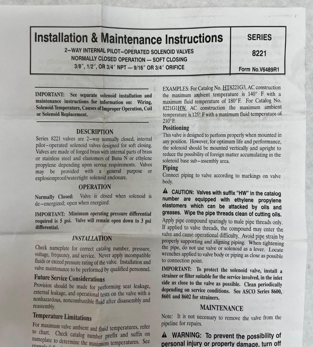 ASCO Series 8210 2-Way Solenoid Valve 8210G009 Red Hat NIB