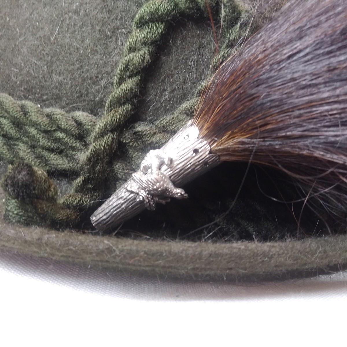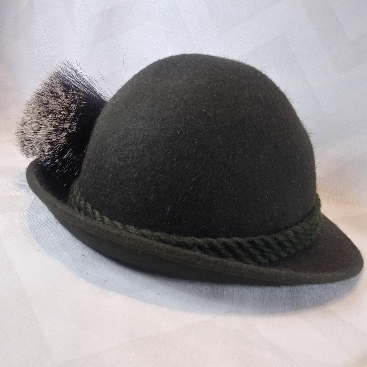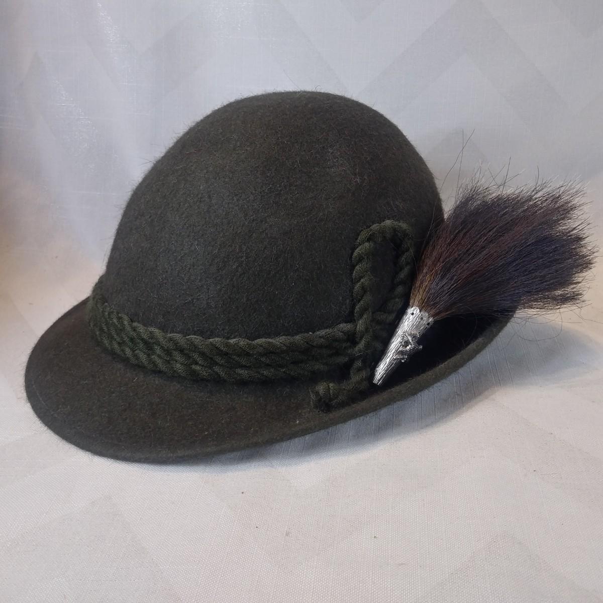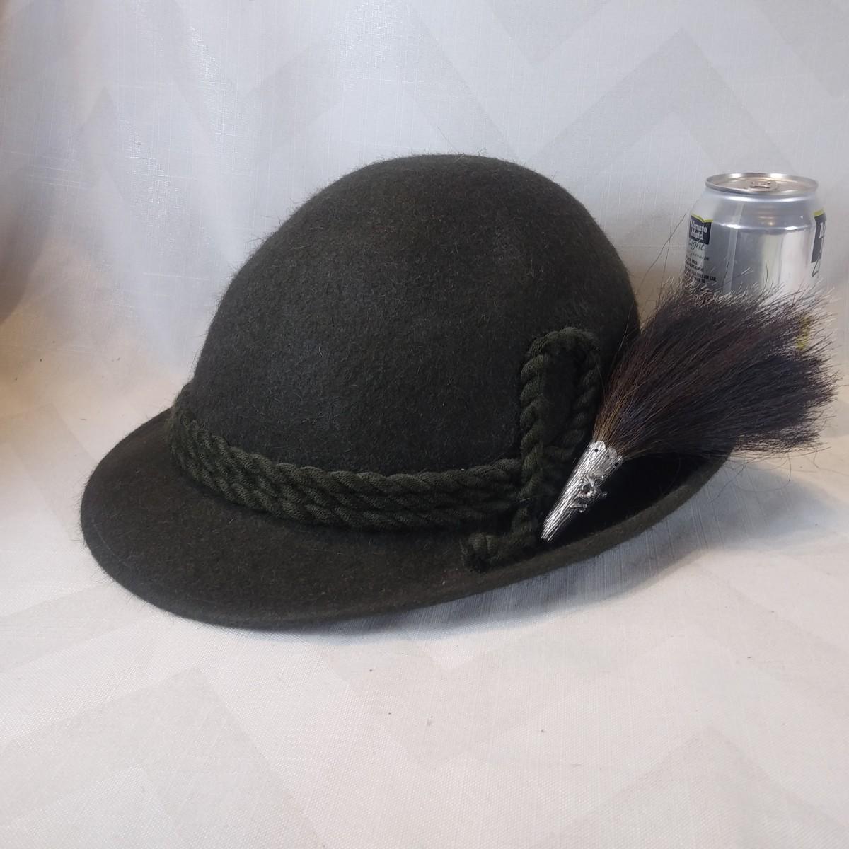 This auction lot is for a Bavarian Alpine Fedora adorned with a very nice Gamsbart Hat Pin. The Gamsbart is true animal hair contained within a metal horn - often sterling silver, this horn is unmarked as far as best we can determine. This hat is a very classic dark-forest-green wool felt Bavarian Alpine Fedora-style hat. Appears unused - no size stated. If you are ready to traverse the Alpine Way this is the hat you wear to embellish with all those nifty tourist pins a hiker gathers along the way.