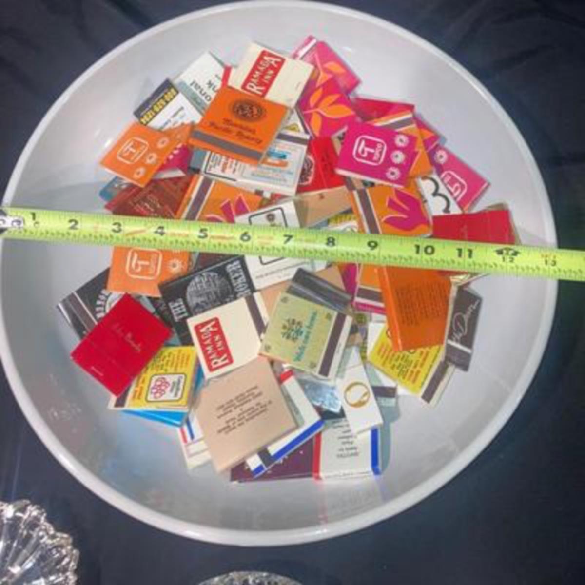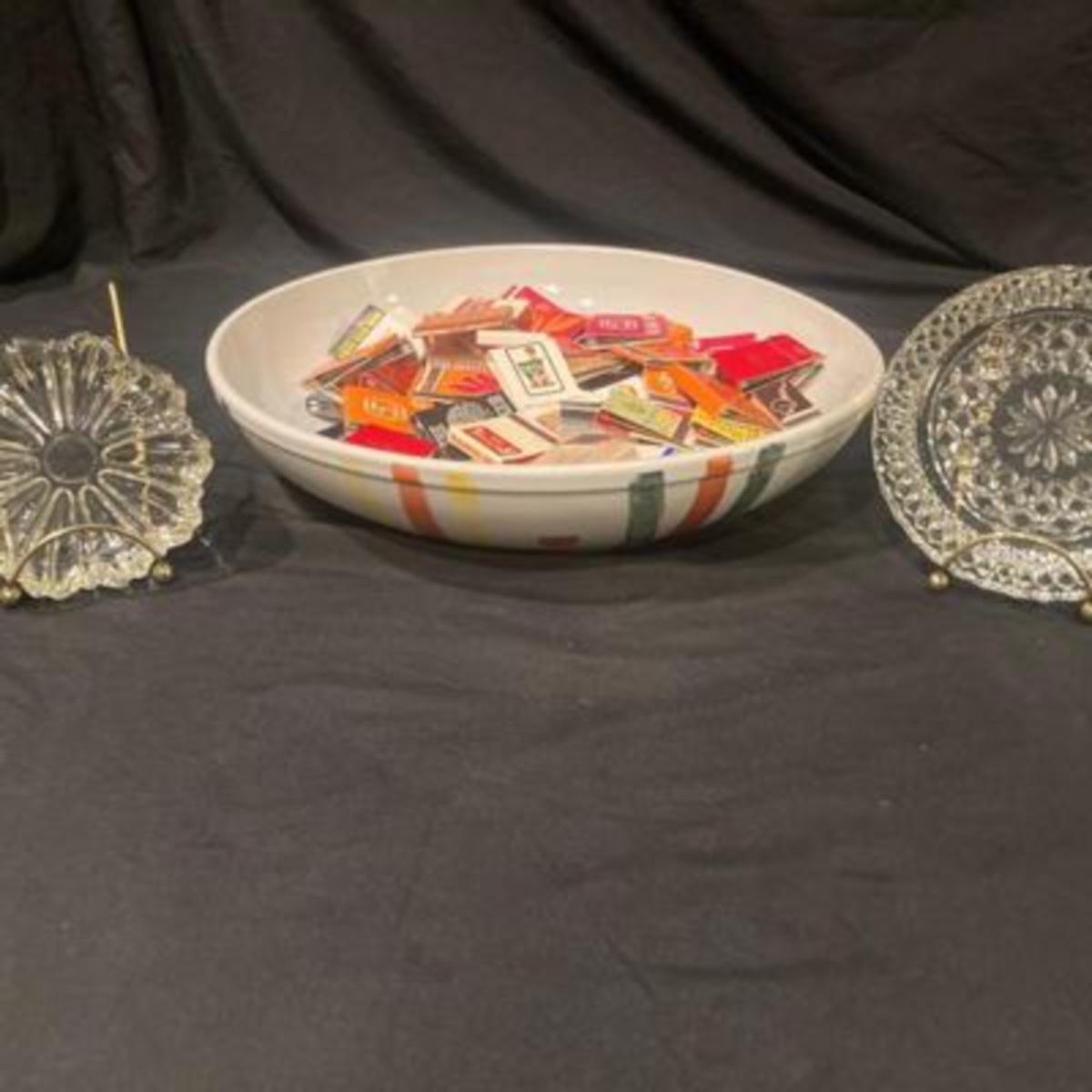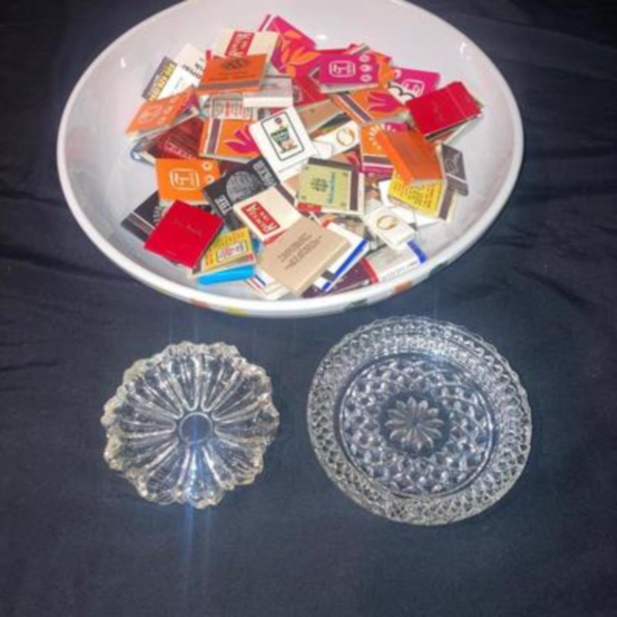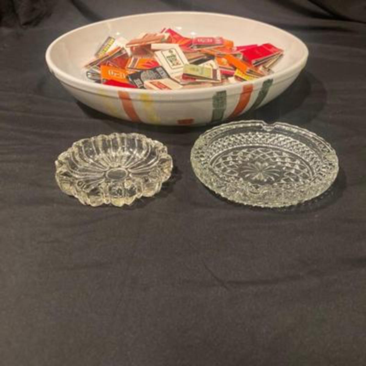 Large 13 inch dish filled with vintage matches in to glass ashtrays.