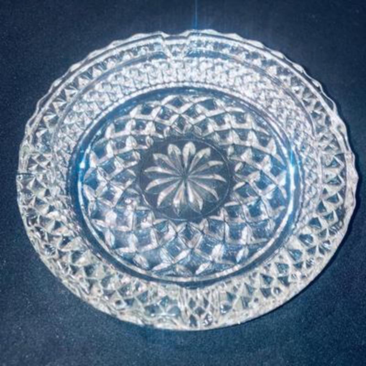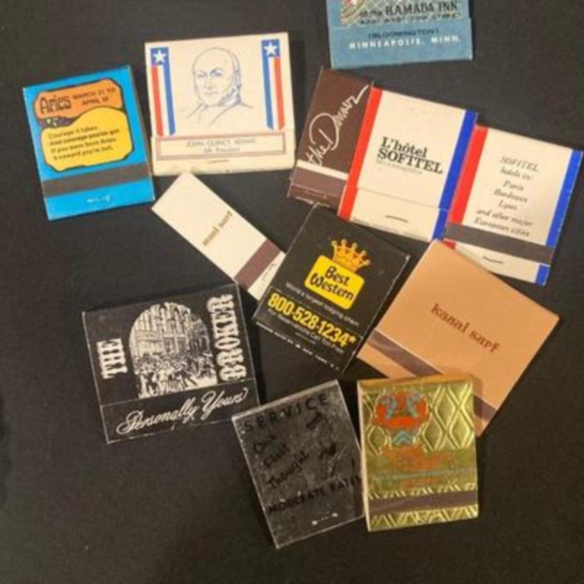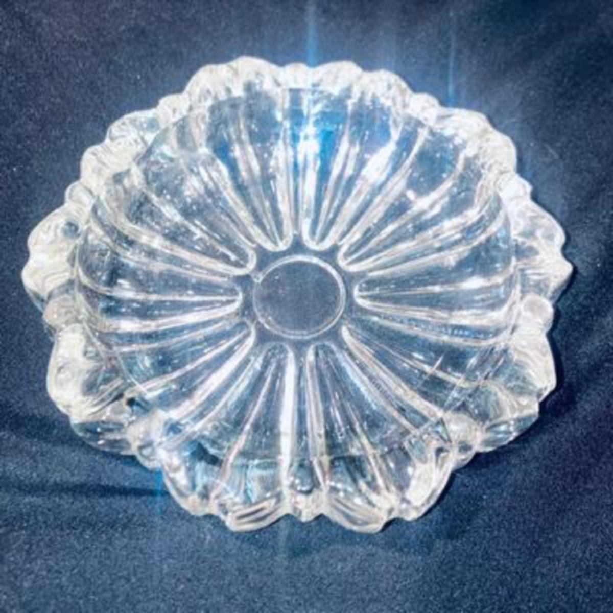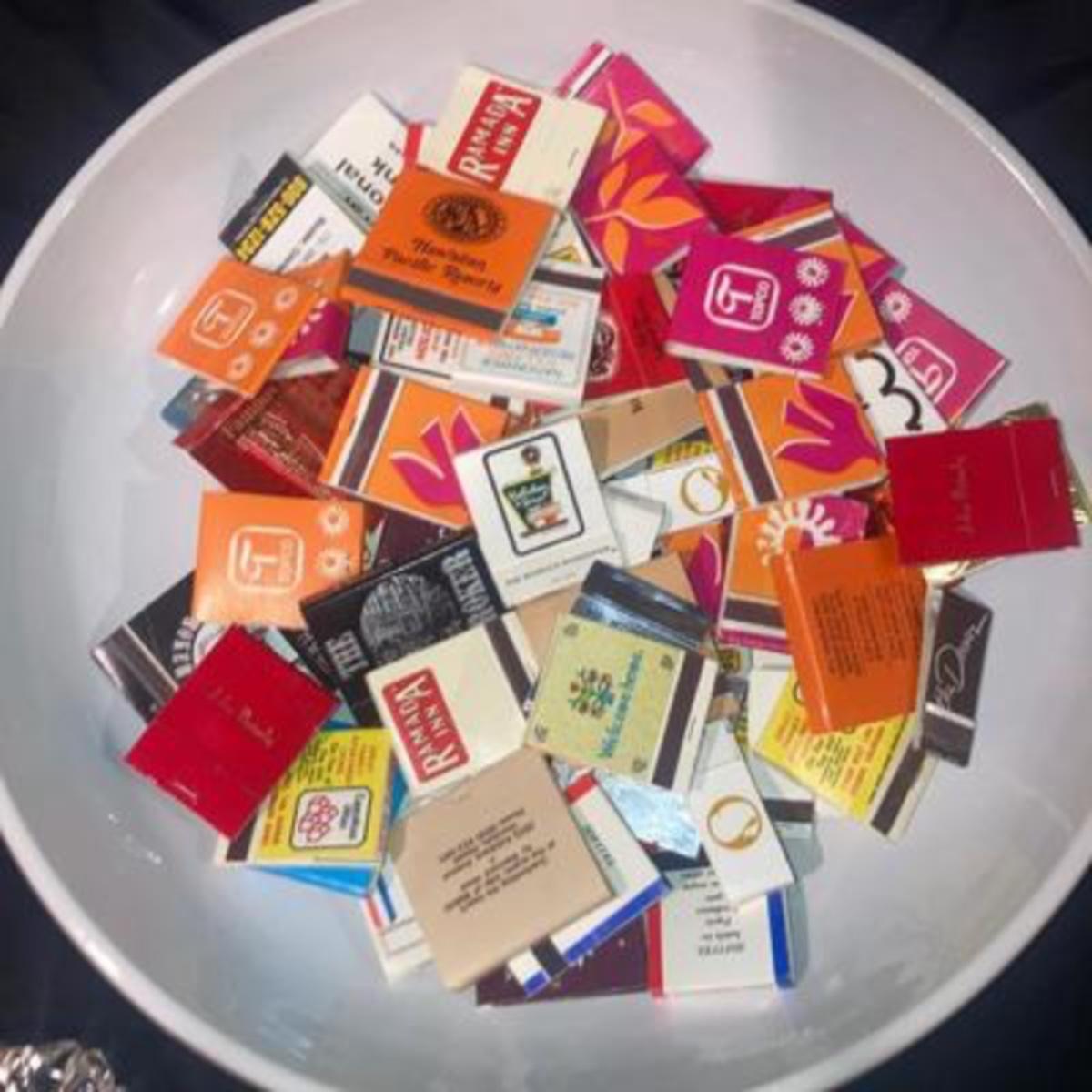 Large 13 inch dish filled with vintage matches in to glass ashtrays.