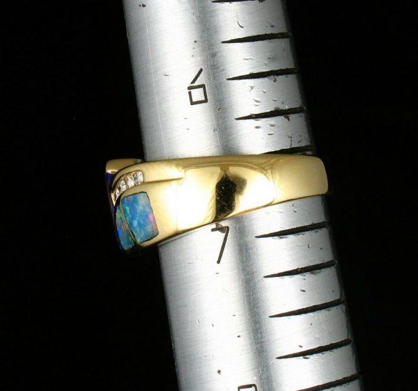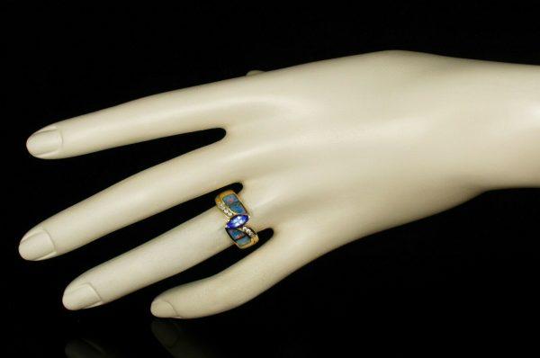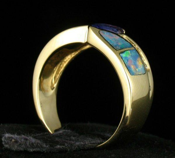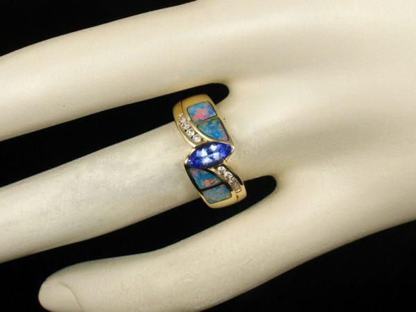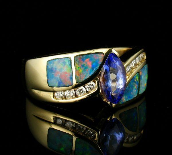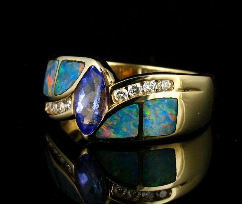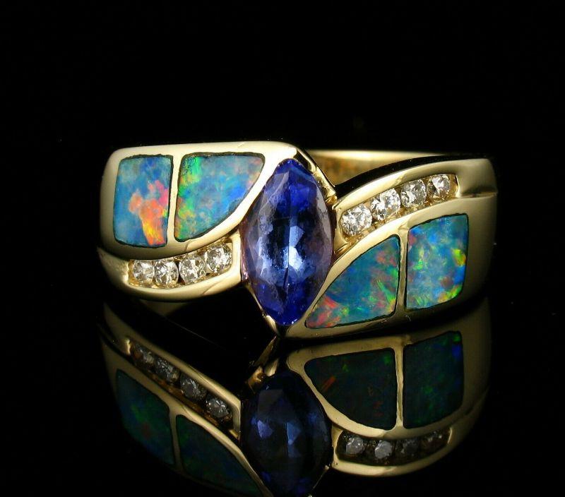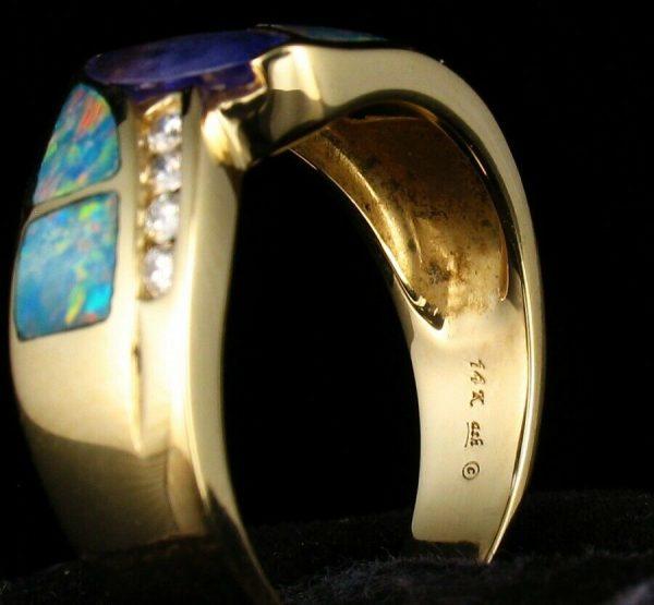 Description: ASHER SIGED NATURAL 1.18ctw TANZANITE SOLID AUSTRALIAN BLACK OPAL INLAY DIAMOND 14K YELLOW GOLD WIDE BAND RING