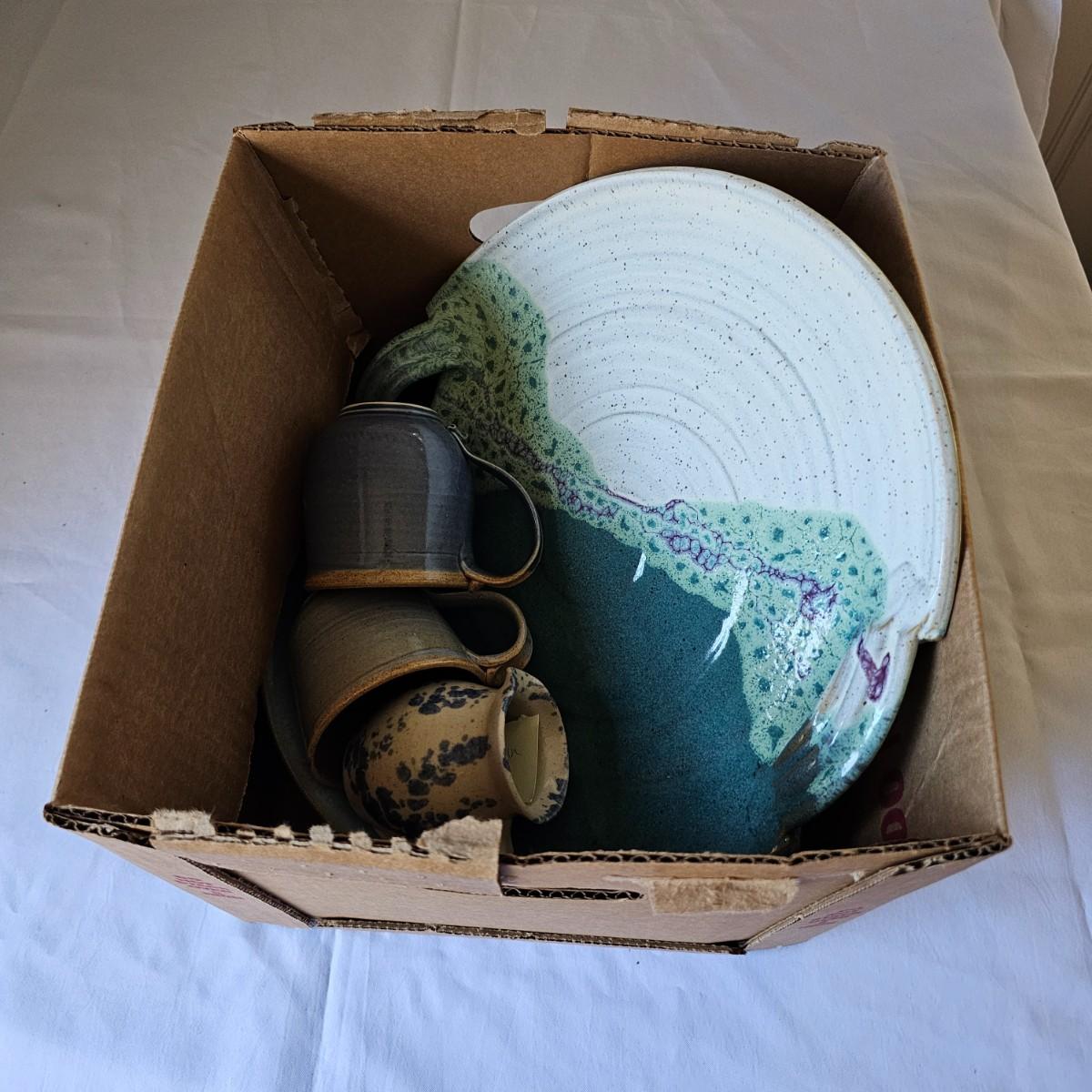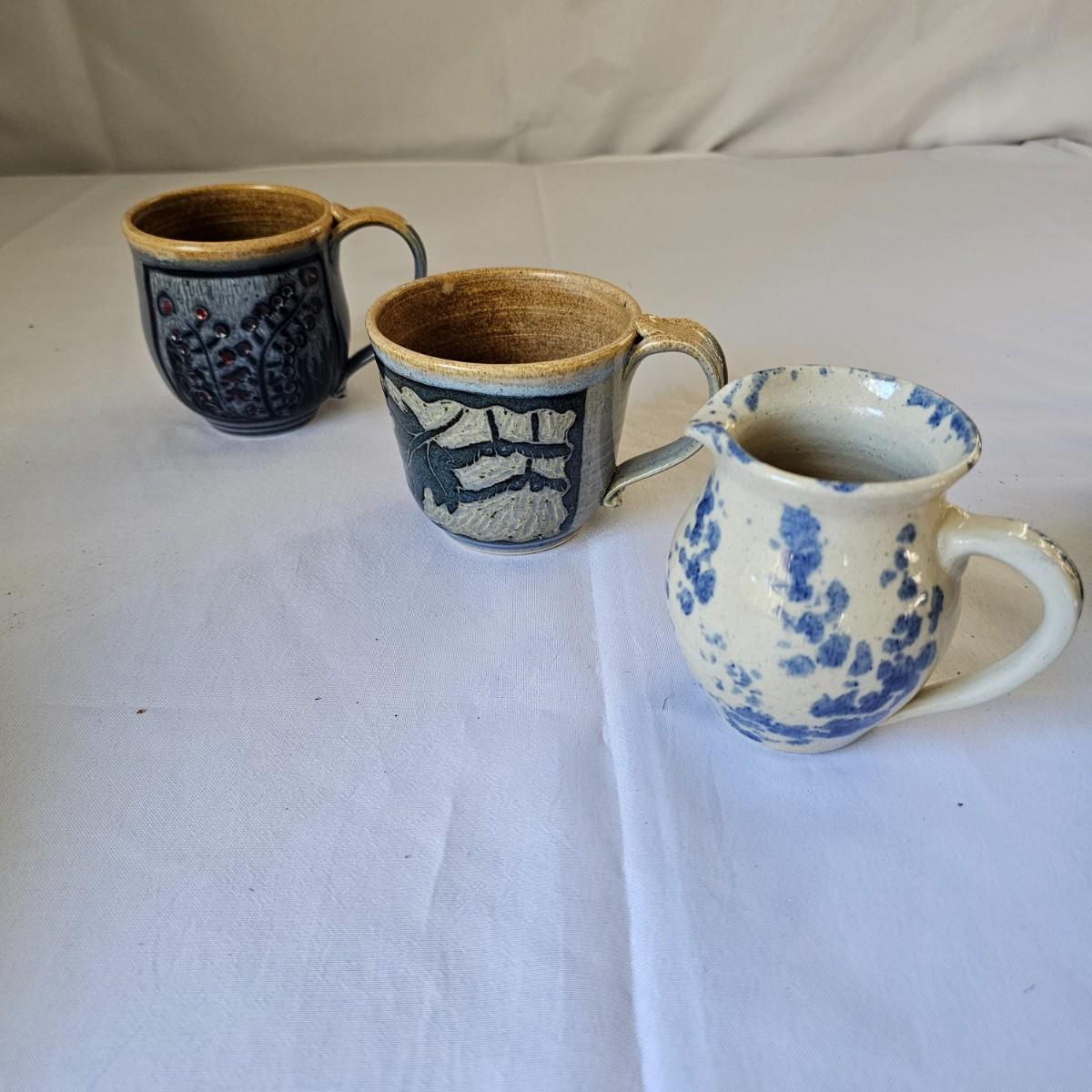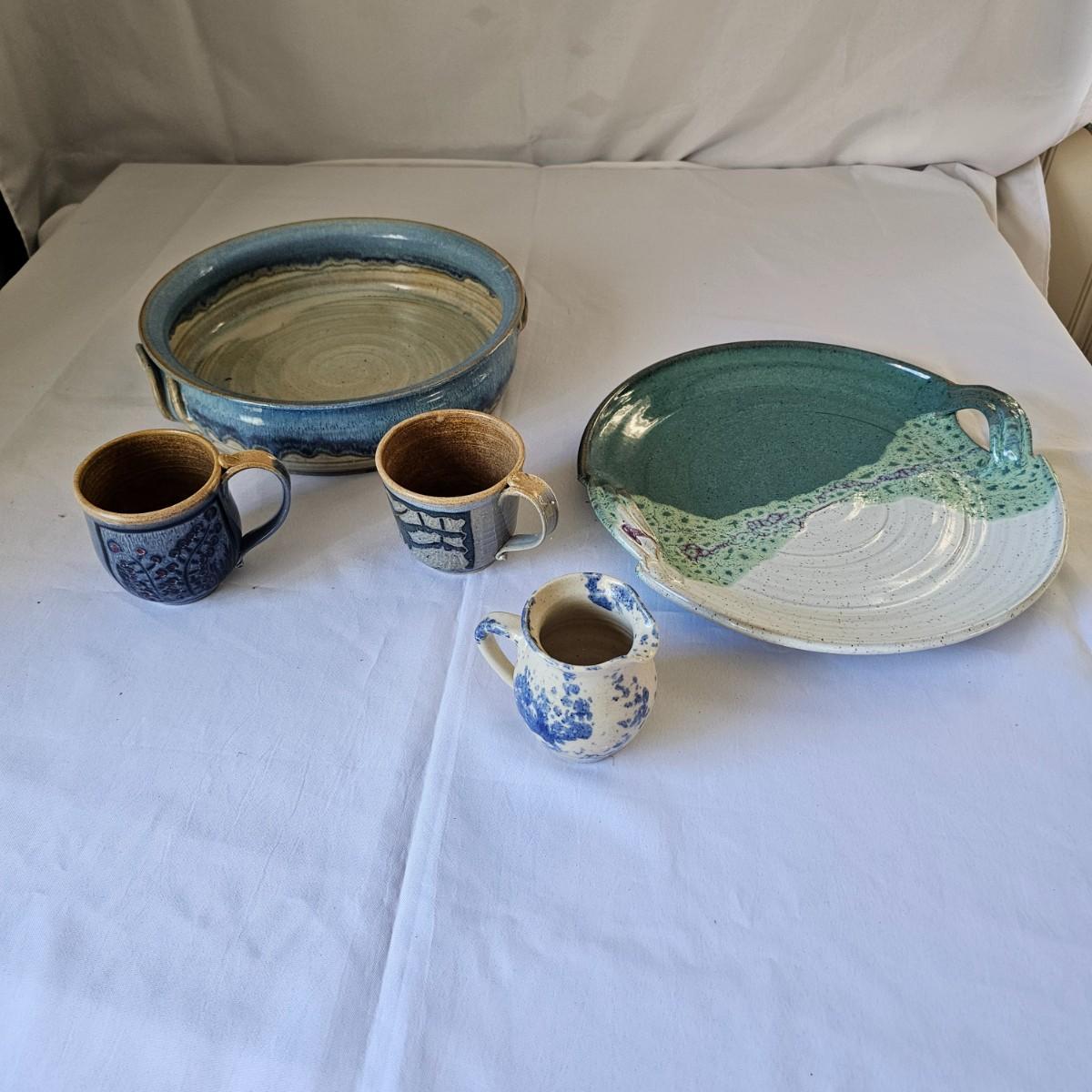 Some pottery items produced by local artists from Asheville and Black Mountain. The large plate piece measures 13.5"D, and the bowl is 12"D x 3"H. There are also three handmade cups in this lot. See photos for details. Shipping available.