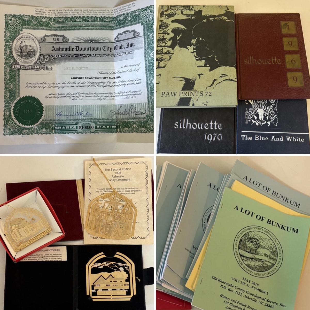 This lot includes many different pieces of local Asheville Memorabilia: a stack of the Buncombe County Genealogical Society publication, Rosters & Bylaws of several clubs, 3 Asheville Country Day yearbooks, collectible holiday ornaments, Janirve Foundation grant booklets, and more. See pictures for reference. Shipping Available.