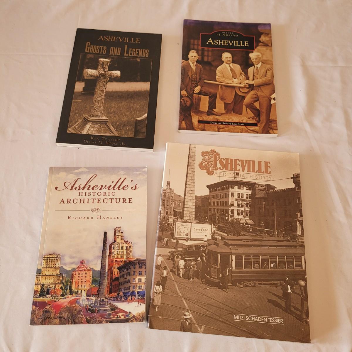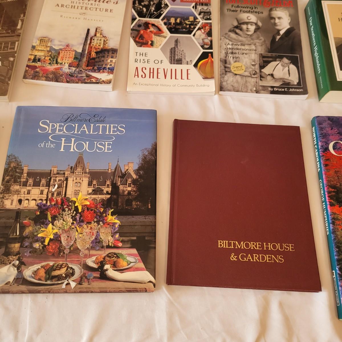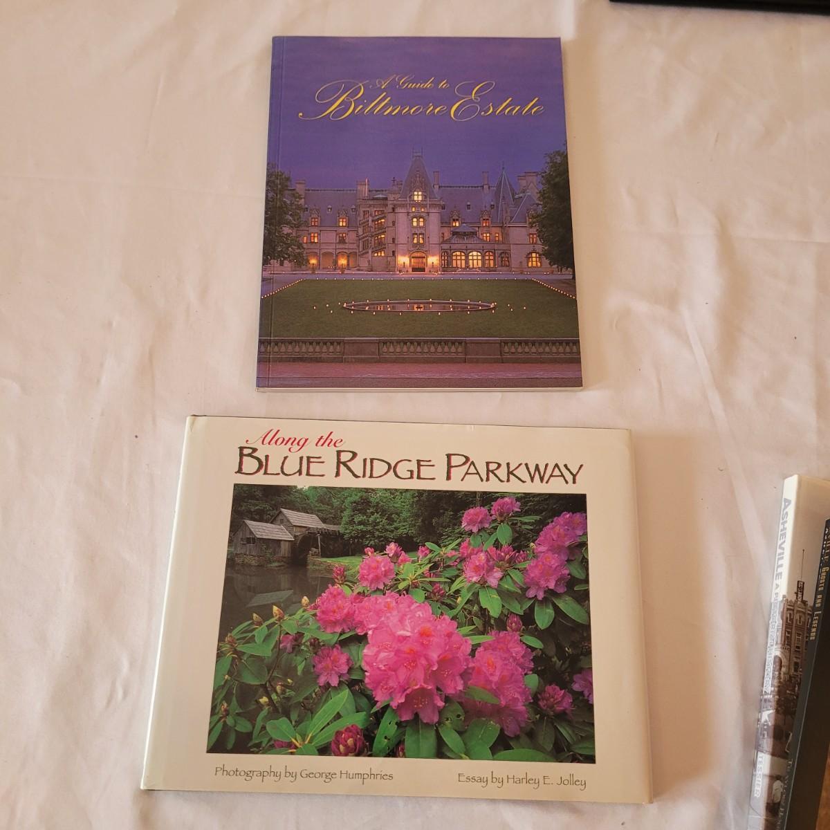 A collection of Asheville themed books including Biltmore House books, as well as NC books and a framed photo of the Hale-Bopp comet over the Blue Ridge Parkway. Frame measures approximately 10.75” x 9”. Shipping available.