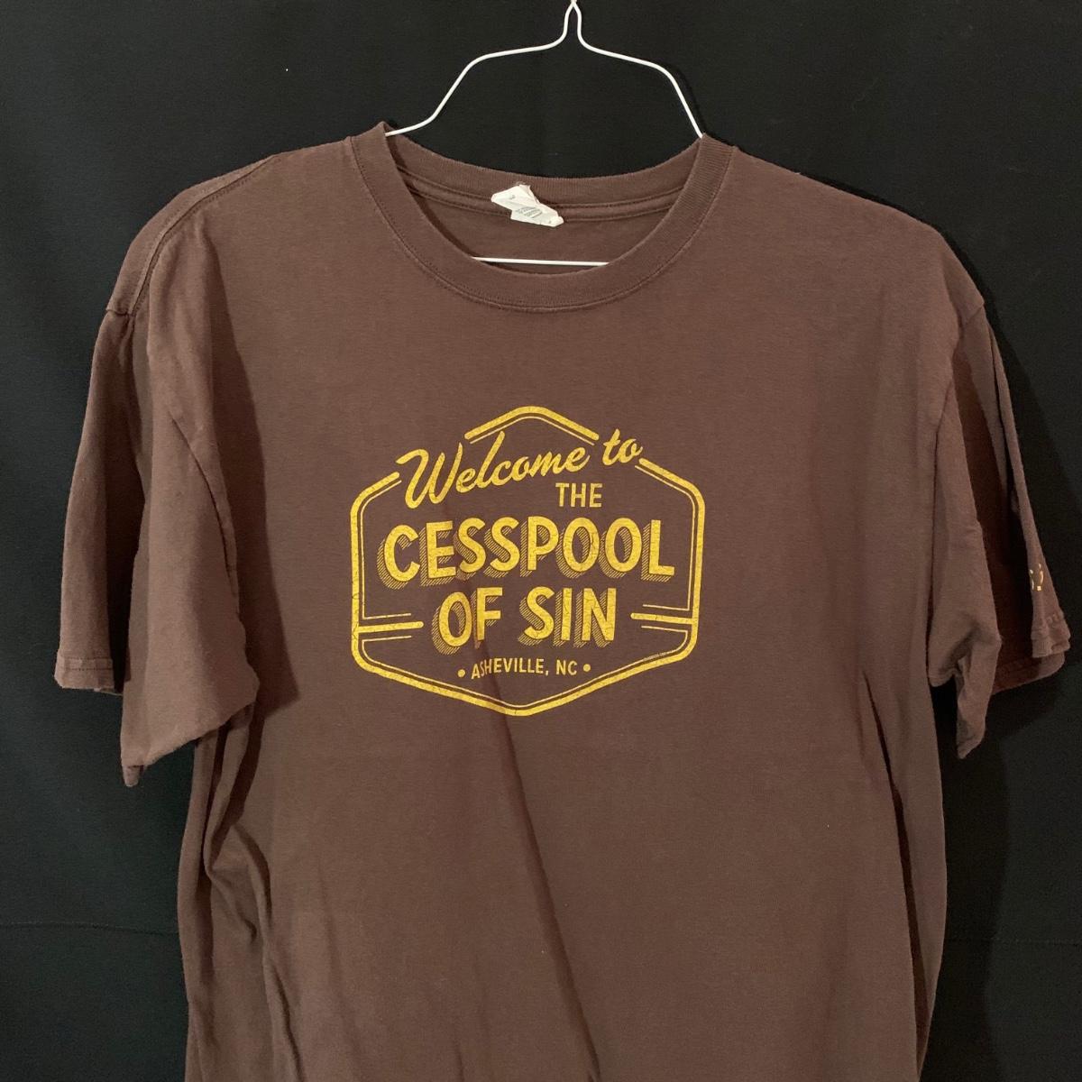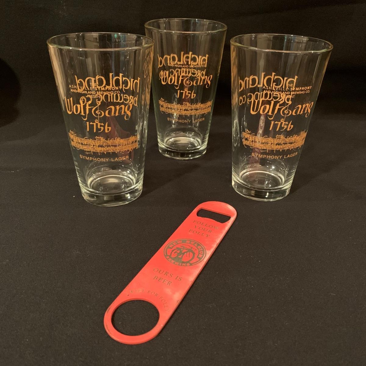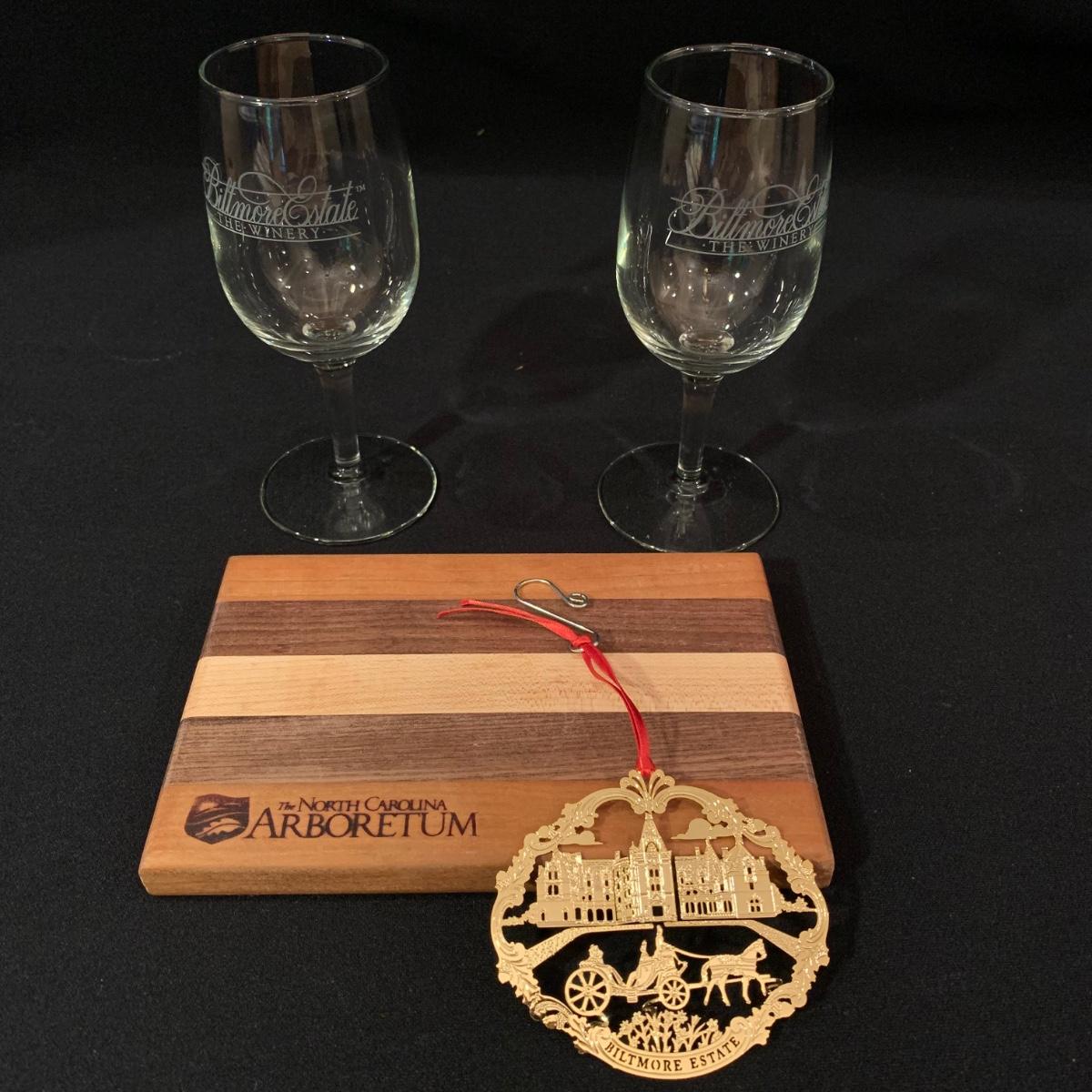 Large collection of Asheville souvenirs. This lot includes three Asheville Symphony Highland Pint glasses, two Biltmore Wine tasting glasses, one 24k Gold finished Biltmore Centennial ornament, one medium and one xtra large “Welcome to the Cesspool of Sin Asheville” shirts, two ceramic Asheville Symphony mugs, two cheese boards from the Arboretum, two Ghost of Richmond Hill booklets, one black bear magnet, one North Carolina shaped cookie cutter, one xtra large Asheville Tourist baseball jersey, two opened Highland crowlers, one New Belgium shopping bag, five Asheville Symphony pins, and one 8.5” x 10.5” framed embroidery of the Biltmore Estate. Perfect lot for the Asheville lover in your life! All items have been used, please see photos for more details.