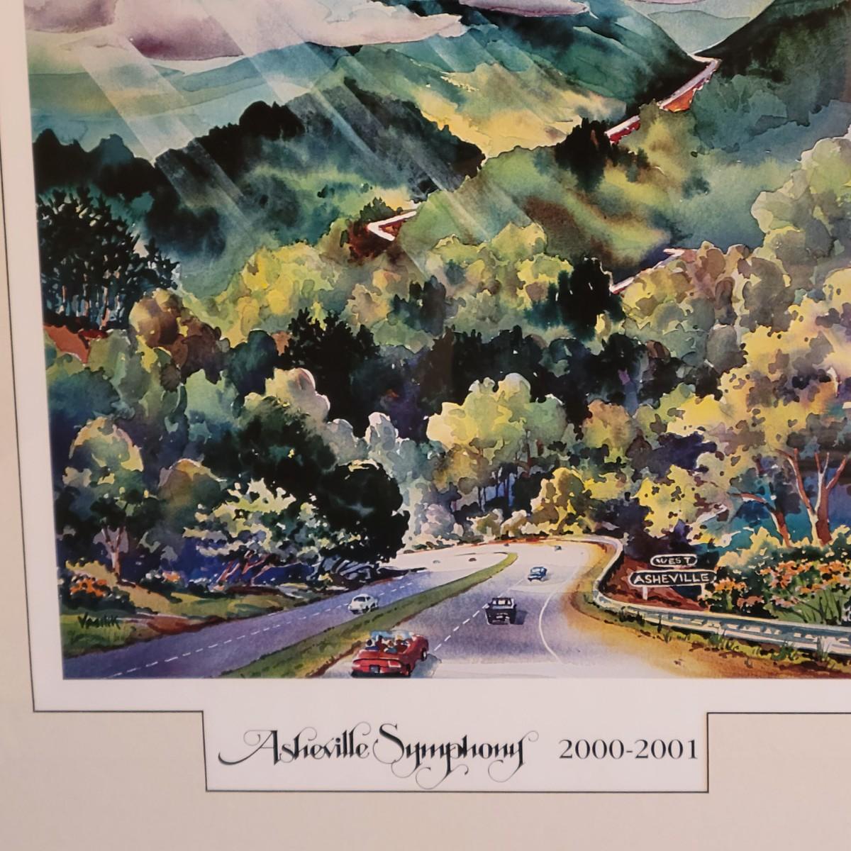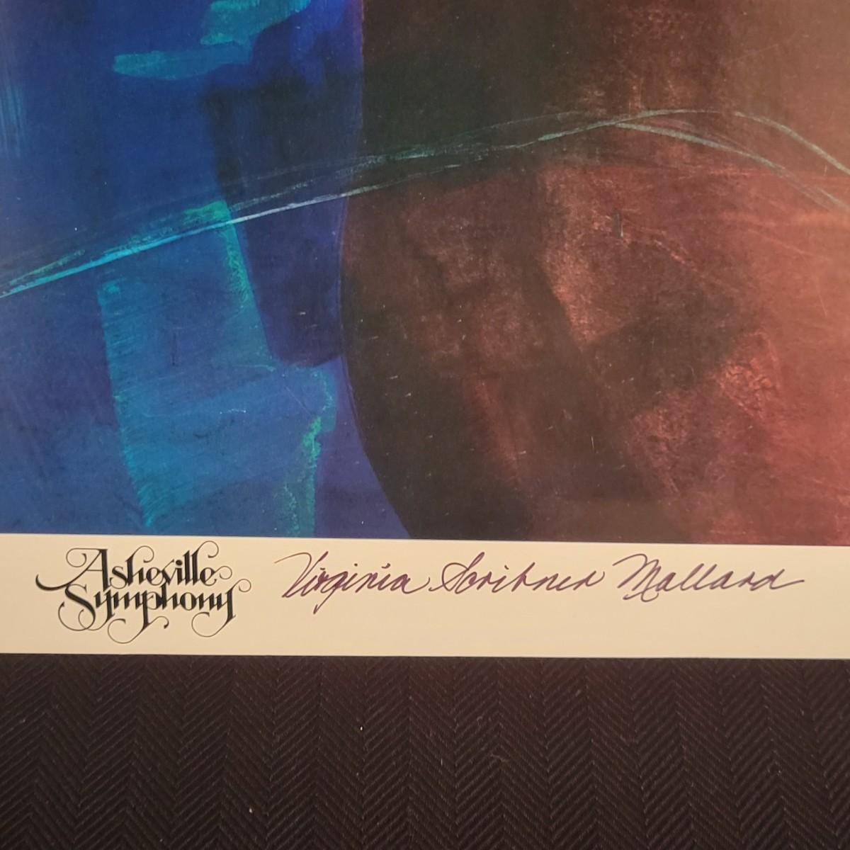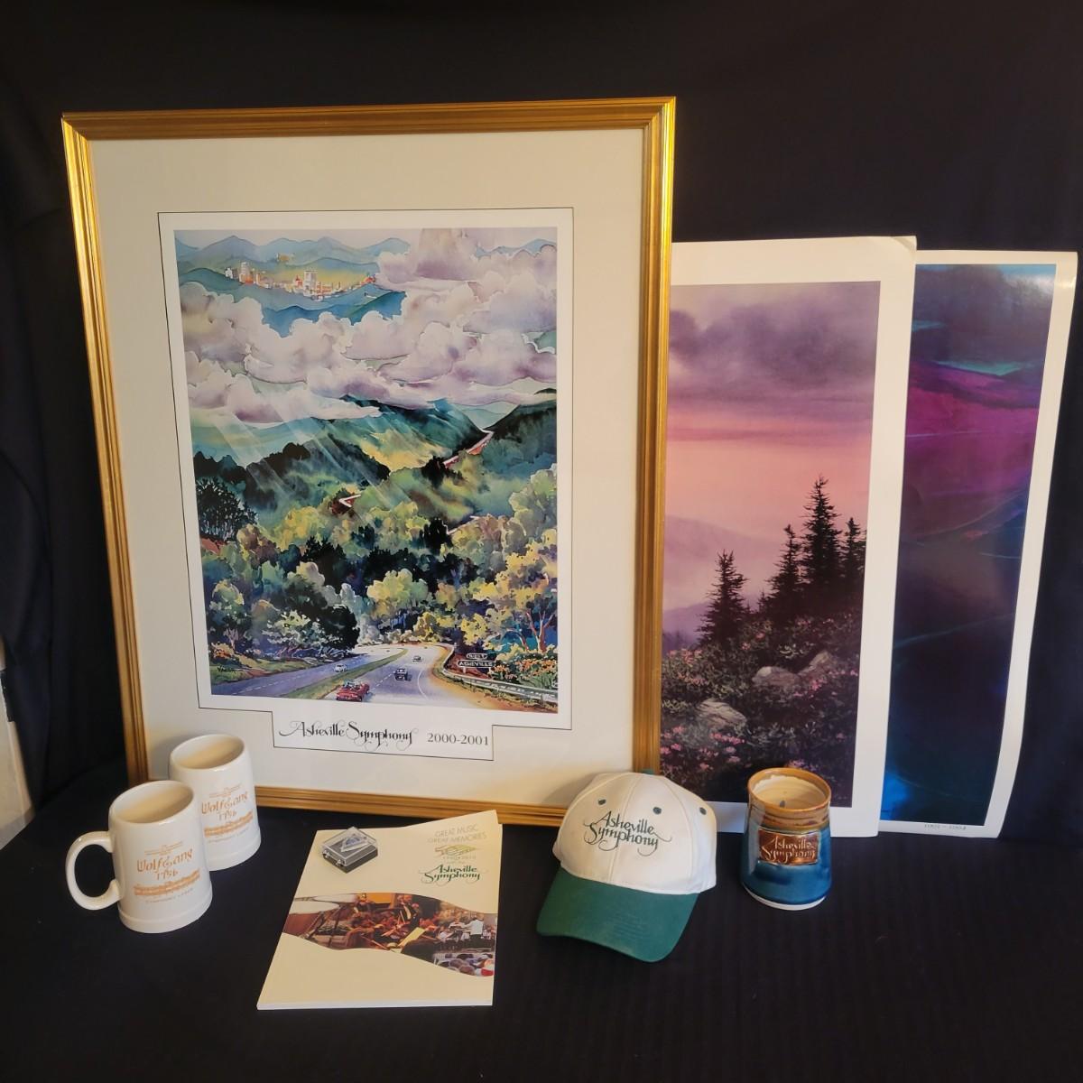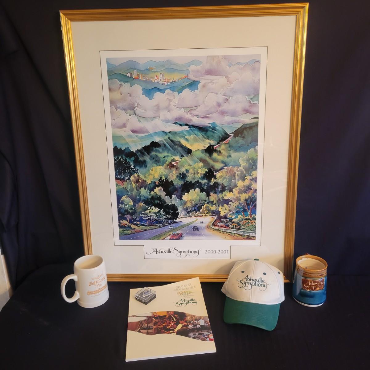 A collection of memorabilia items for the Asheville Symphony Orchestra. Included are coffee cups (one is signed), a hat, a pin, a booklet and multiple prints. There are two unframed prints, one of which is pen signed by Virginia Mallard. There is also a framed print that has a single mat with a wooden frame that has a gold finish. It measures approximately 26" x 31”. Shipping available. Shipping can be costly. We suggest contacting our preferred local shipping provider, Postage Express, with dimensions and getting an estimate before bidding: (828) 670-5501 or postageexpress@yahoo.com.