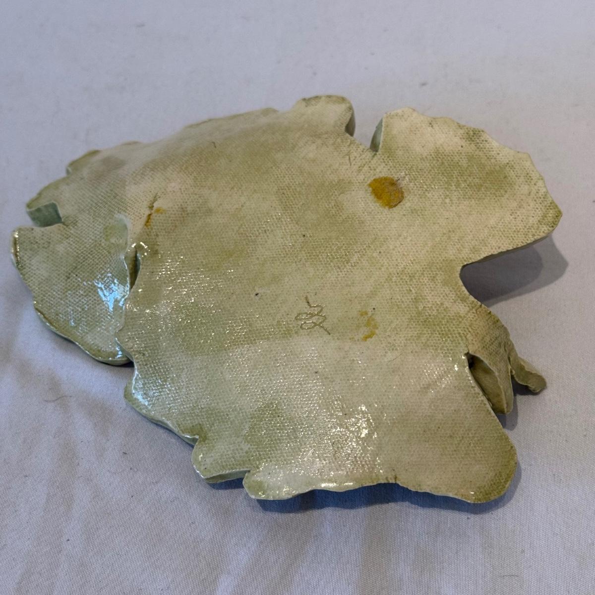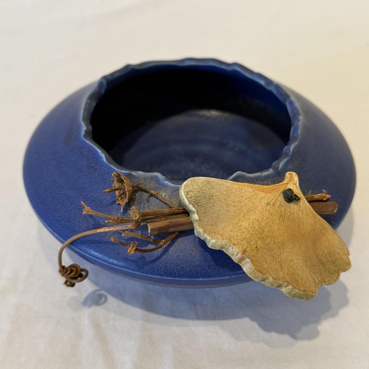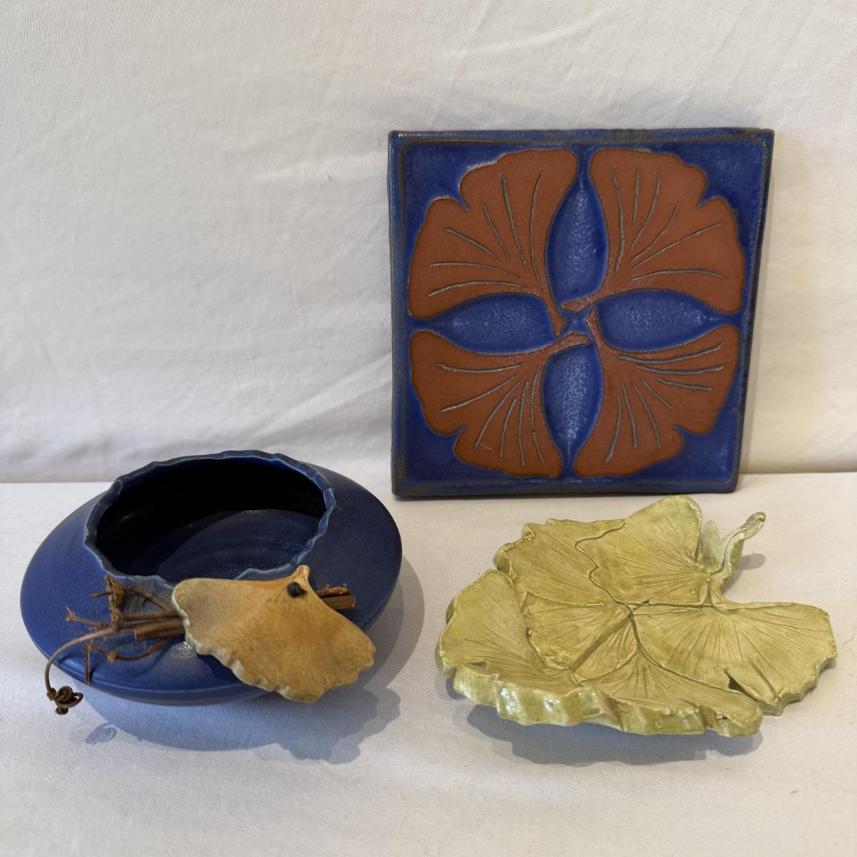 Three gingko leaf themed pottery pieces. The Asheville Tileworks tile is 6”sq. The small blue bowl is signed “K Stoner”, likely by potter Karen Stoner. It has a ceramic gingko leaf attached, as well as some other natural materials. A signed gingko ceramic soap dish is included as well.