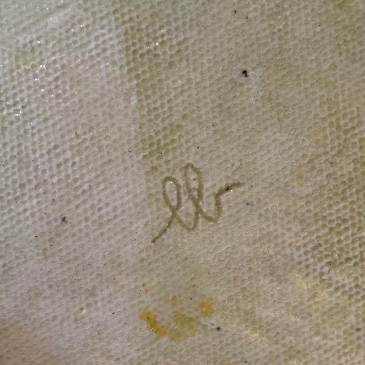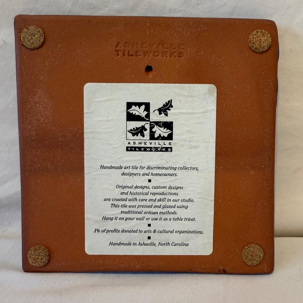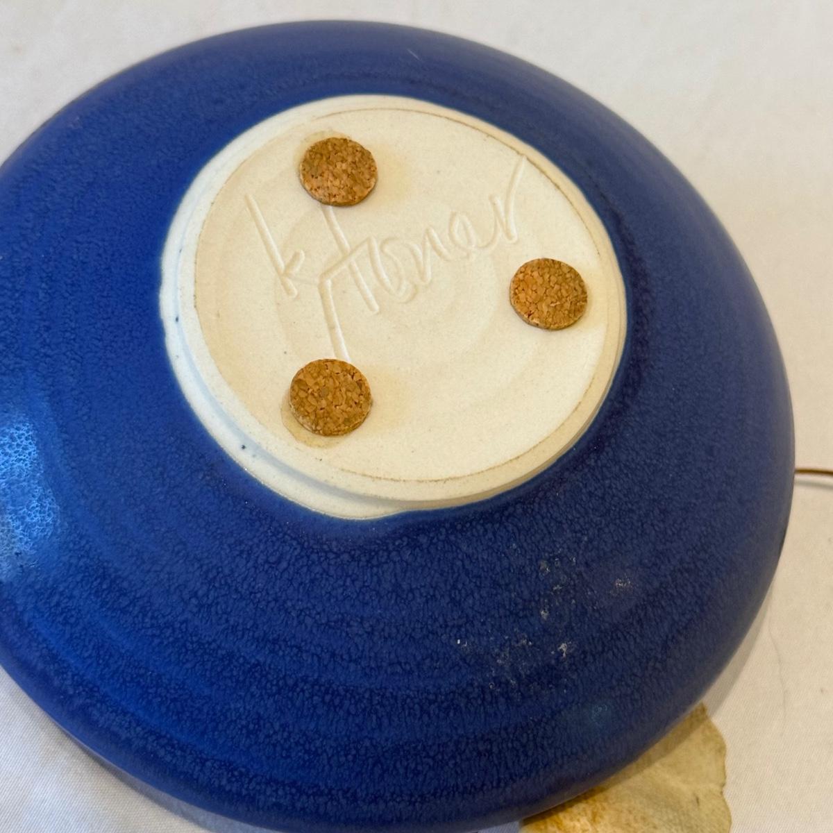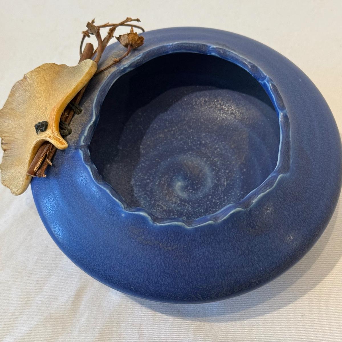 Three gingko leaf themed pottery pieces. The Asheville Tileworks tile is 6”sq. The small blue bowl is signed “K Stoner”, likely by potter Karen Stoner. It has a ceramic gingko leaf attached, as well as some other natural materials. A signed gingko ceramic soap dish is included as well.