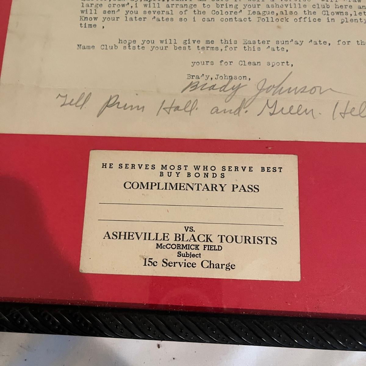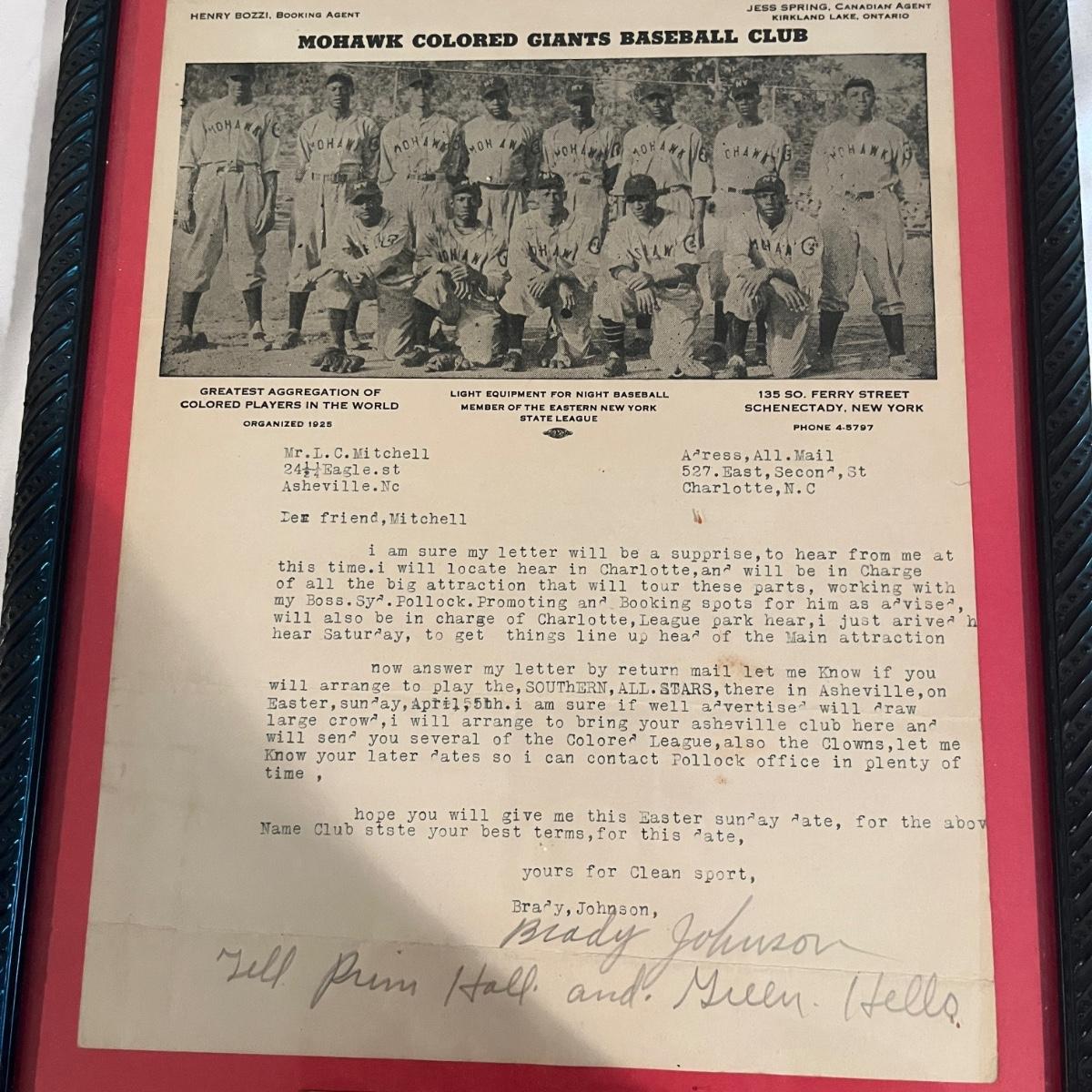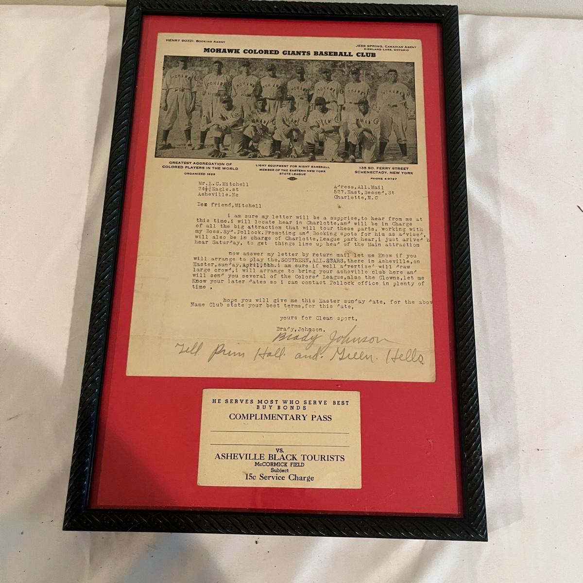 Lot includes a signed copy of The Old Ball Yard by Bob Terrell and a wooden framed letter from the Mohawk Colored Giants Baseball Club and an Asheville Black Tourists pass. Frame measures 10.5” x 16”H.