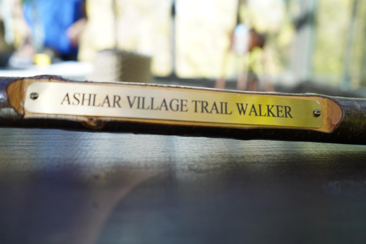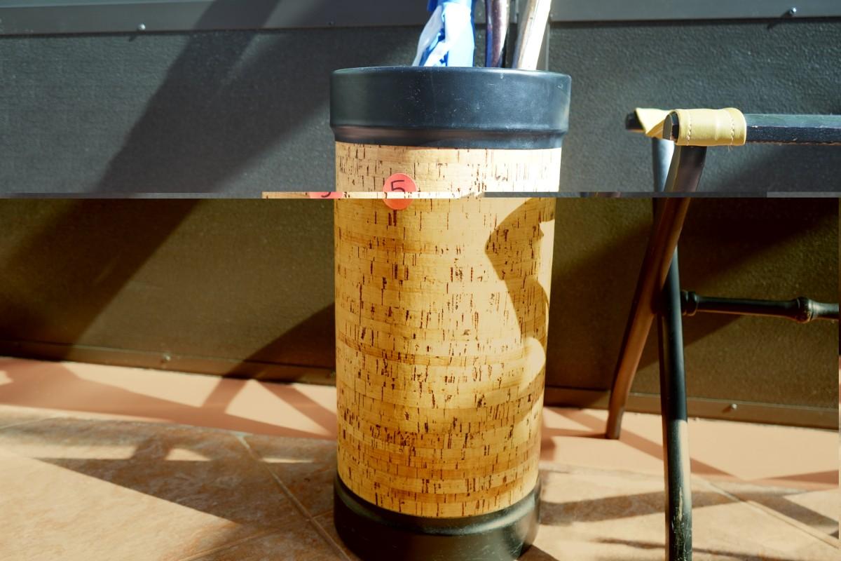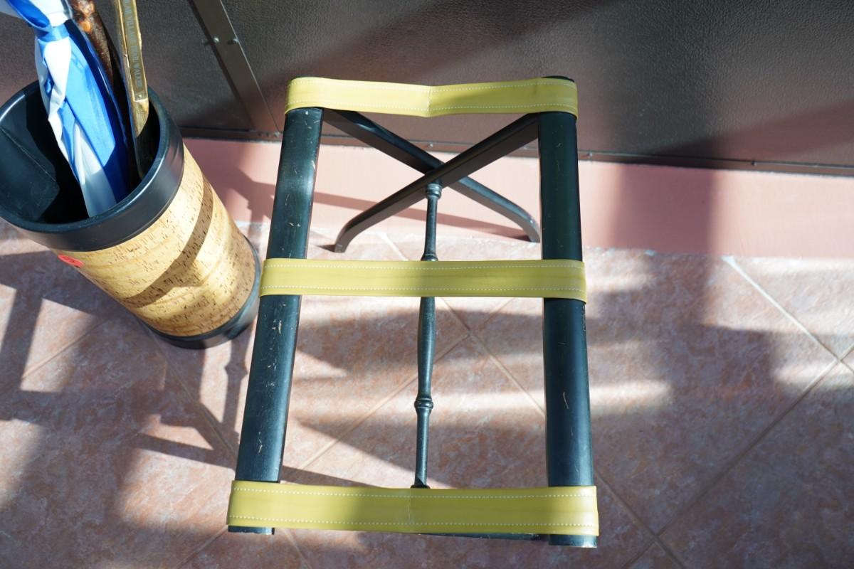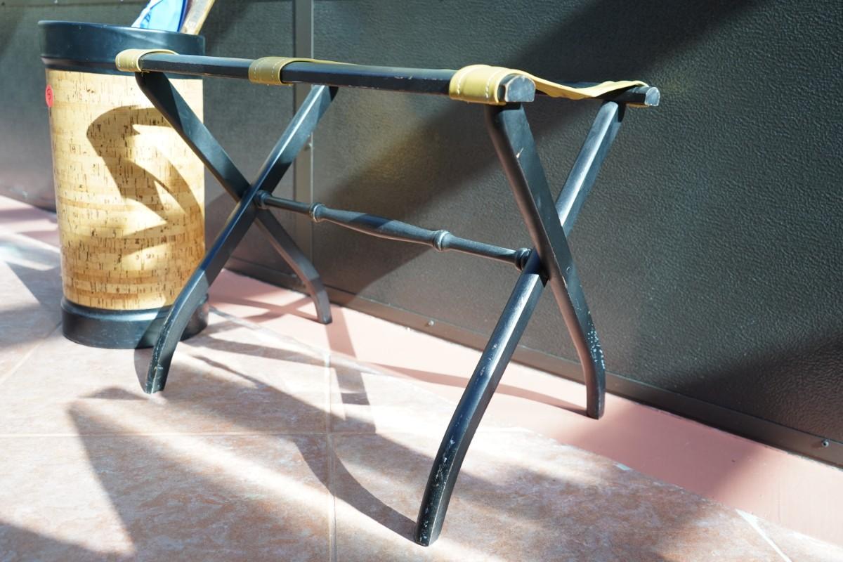 Two wooden walking sticks and a golf umbrella with a decorative holder and luggage rack. Walking stick #1 stands 45" high, #2 stands 42" high. Decorative holder is 9.25" in diameter, standing 19.25" tall. The luggage rack measures 22.25 W x 15 D x 17.5 H.