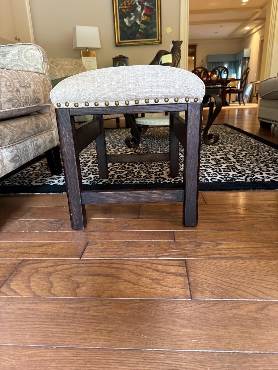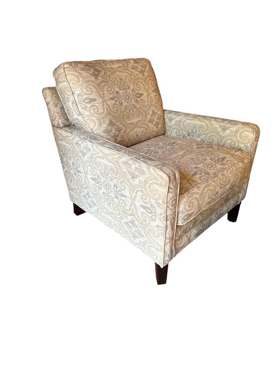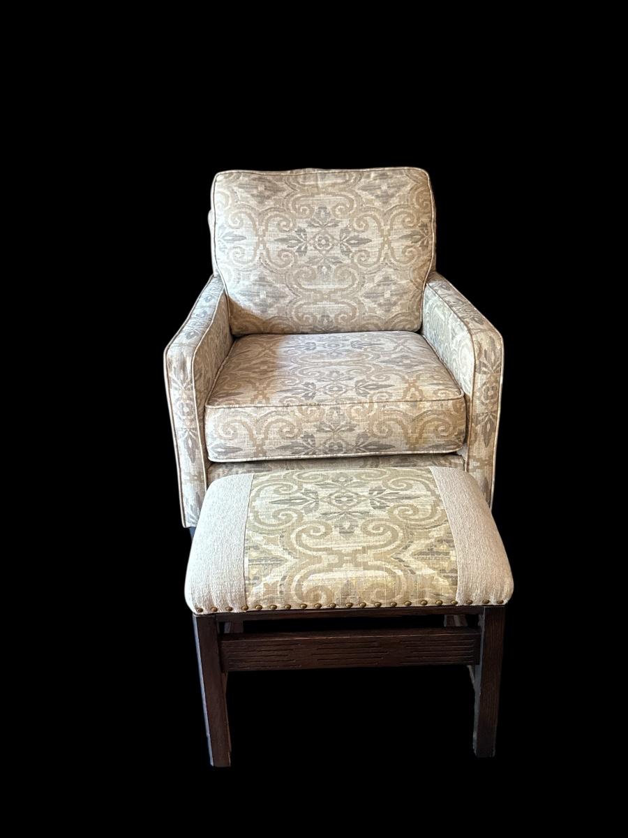 Stylish armchair by Ashley Furniture in a neutral beige and taupe medallion pattern. Features clean lines, tapered wood legs, and a removable back cushion. Comes with a coordinating upholstered ottoman featuring nailhead trim and a dark wood base. Both pieces are in very good condition and offer classic comfort with modern flair.