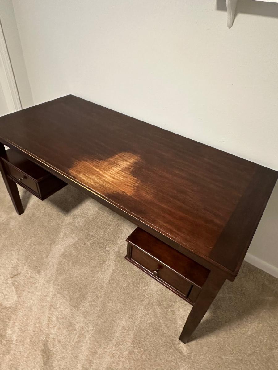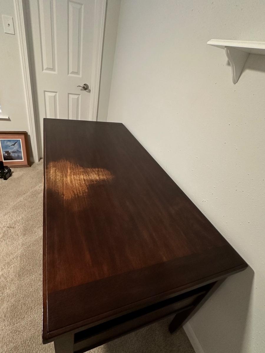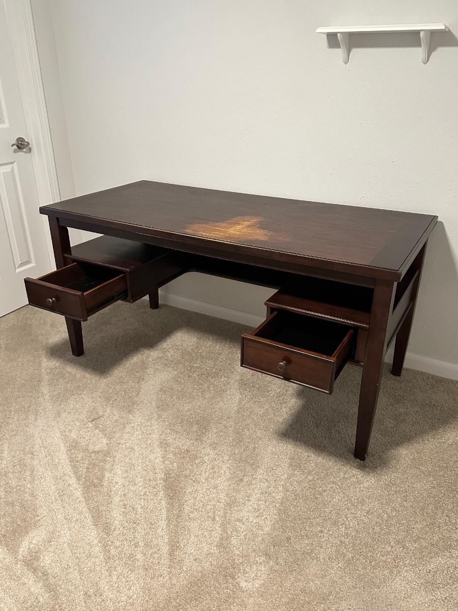 Nice and heavy ~ Shows wear on the top where the owner used that spot on the desk. Nothing a desk mat can’t cover. It’s not damaged, per say, just worn. Has two drawers with some shelving (see photos) 30” H x 60” W x 28” D