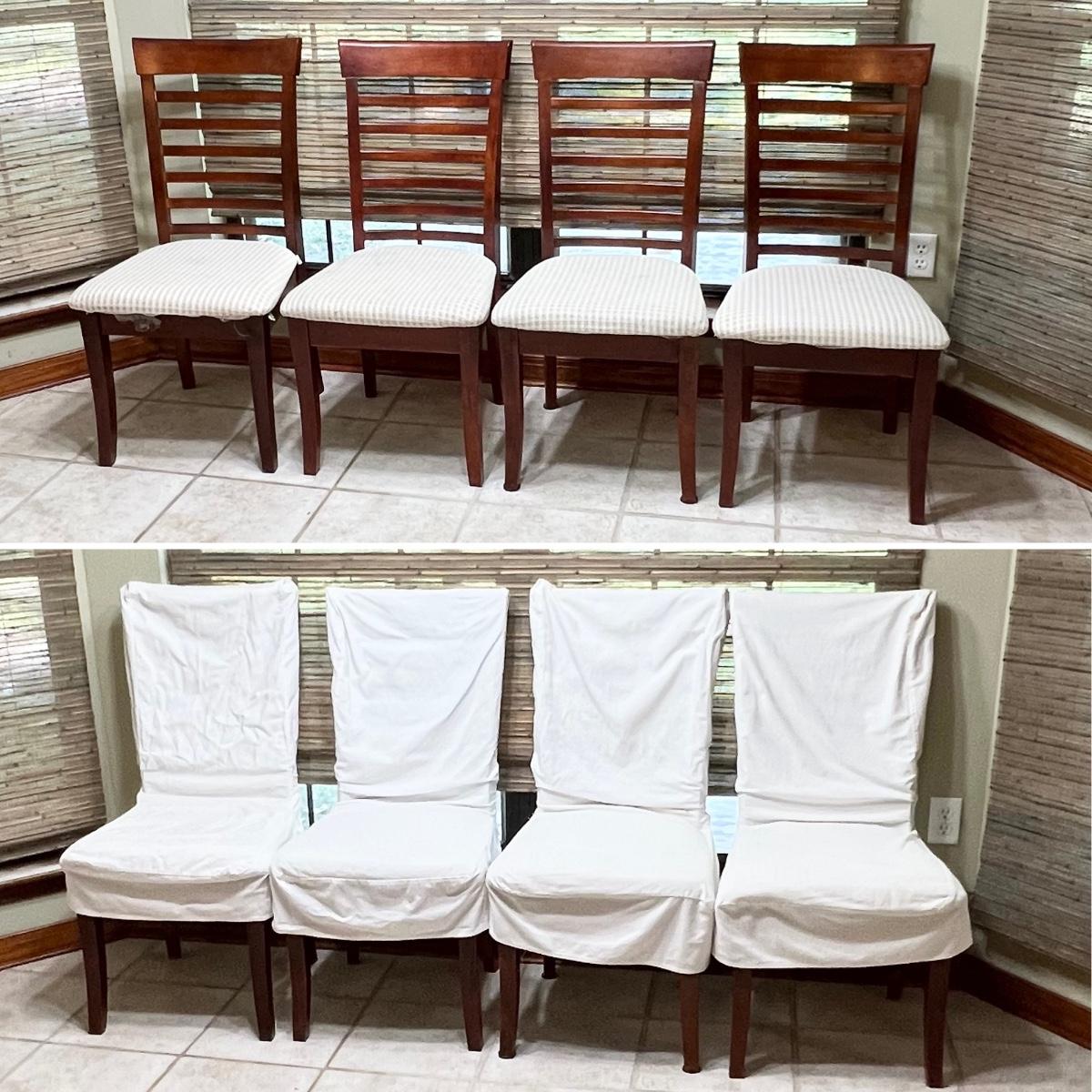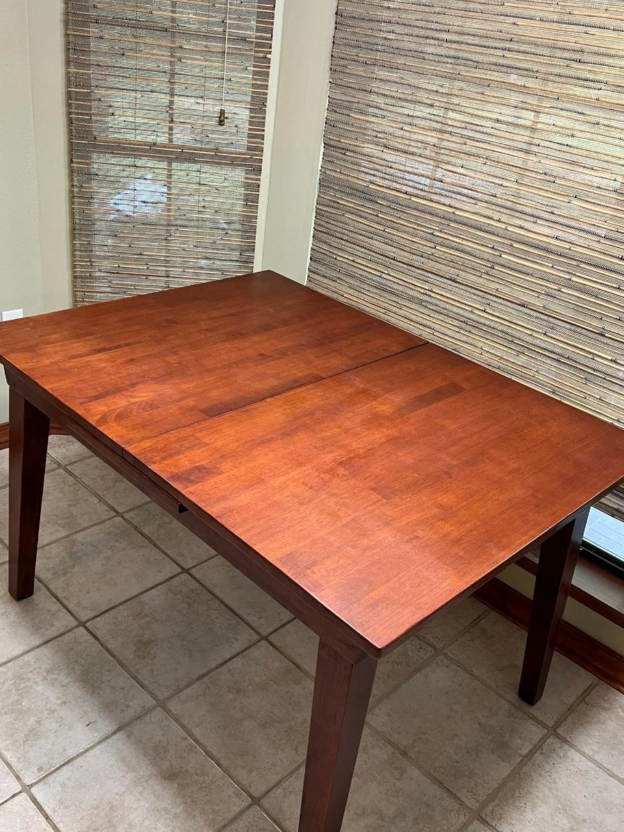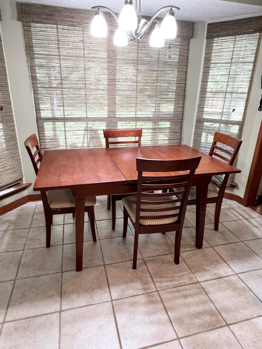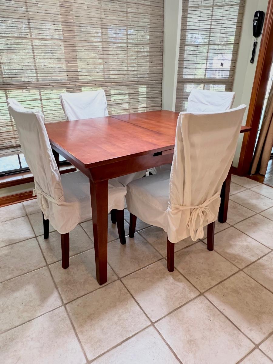 There are 6 chairs, only 4 chairs have covers ~ Table top & spring leaf has minor wear from use, see photos ~ Seats are upholstered ~ Table without leave = 30” H x 48” W x 36” D ~ Leaf = 14” W ~ All chairs = 37" H x 18" W x 21" D