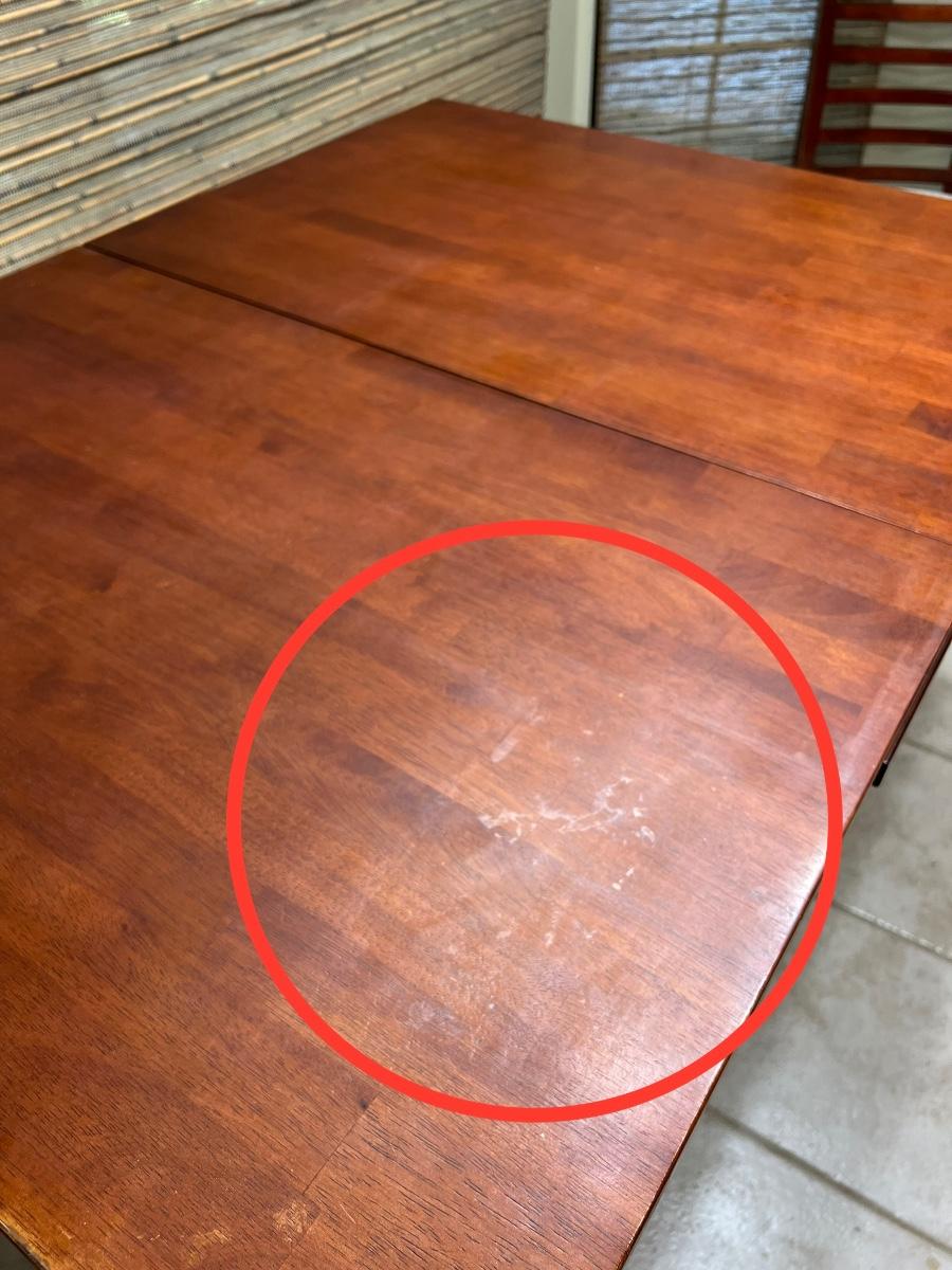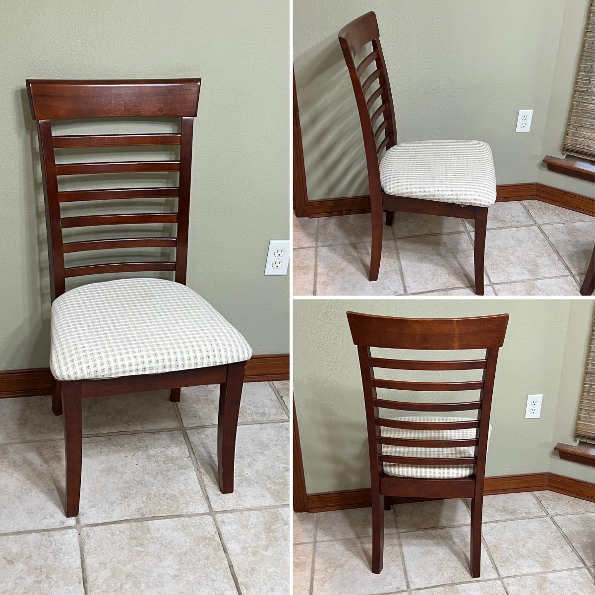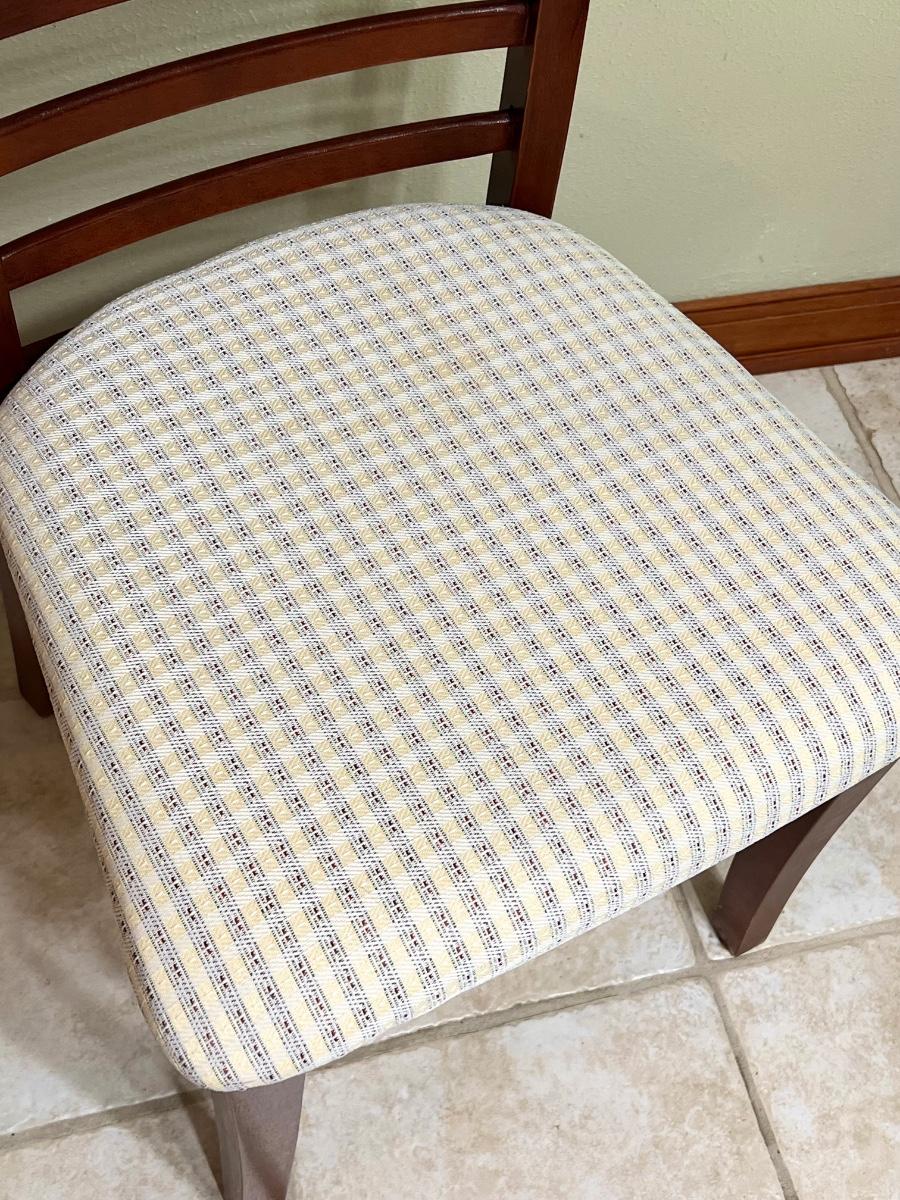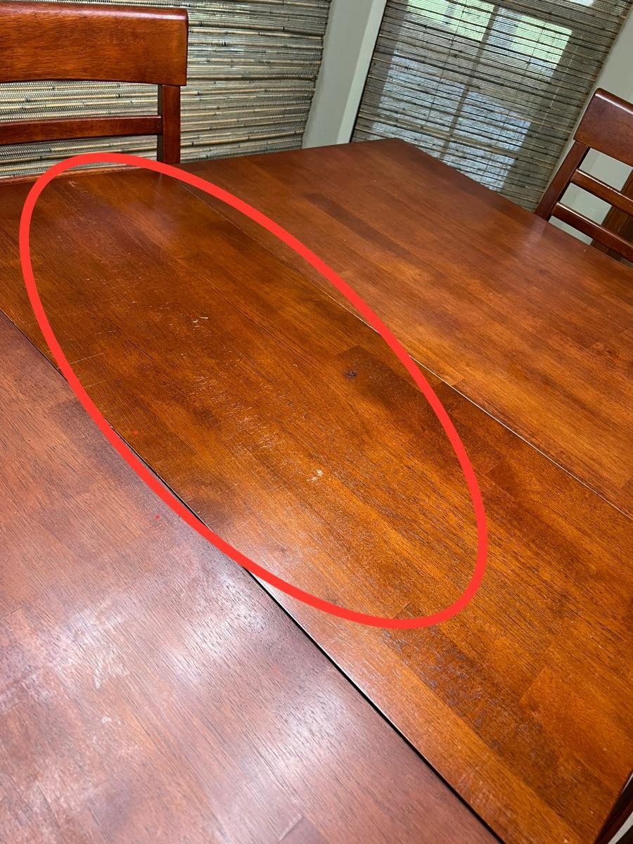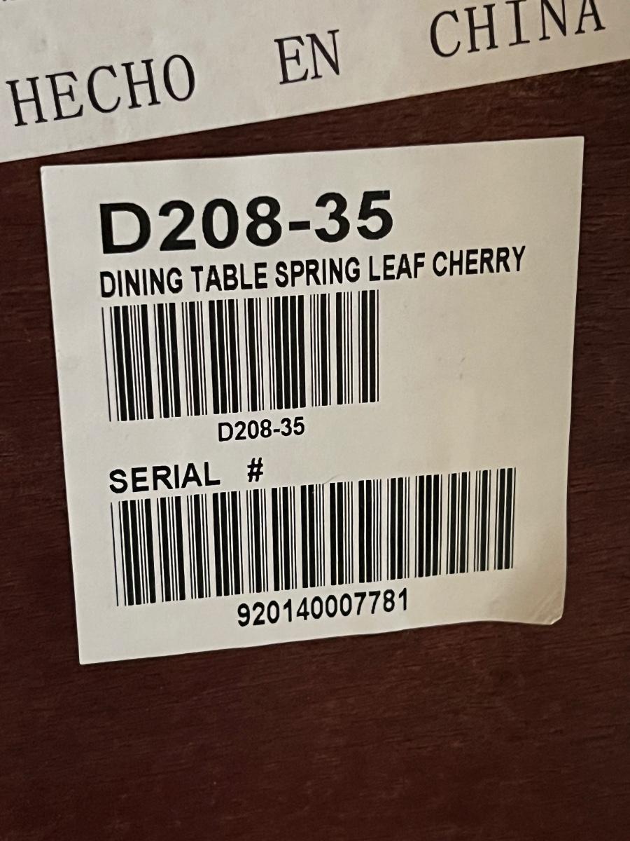 There are 6 chairs, only 4 chairs have covers ~ Table top & spring leaf has minor wear from use, see photos ~ Seats are upholstered ~ Table without leave = 30” H x 48” W x 36” D ~ Leaf = 14” W ~ All chairs = 37" H x 18" W x 21" D