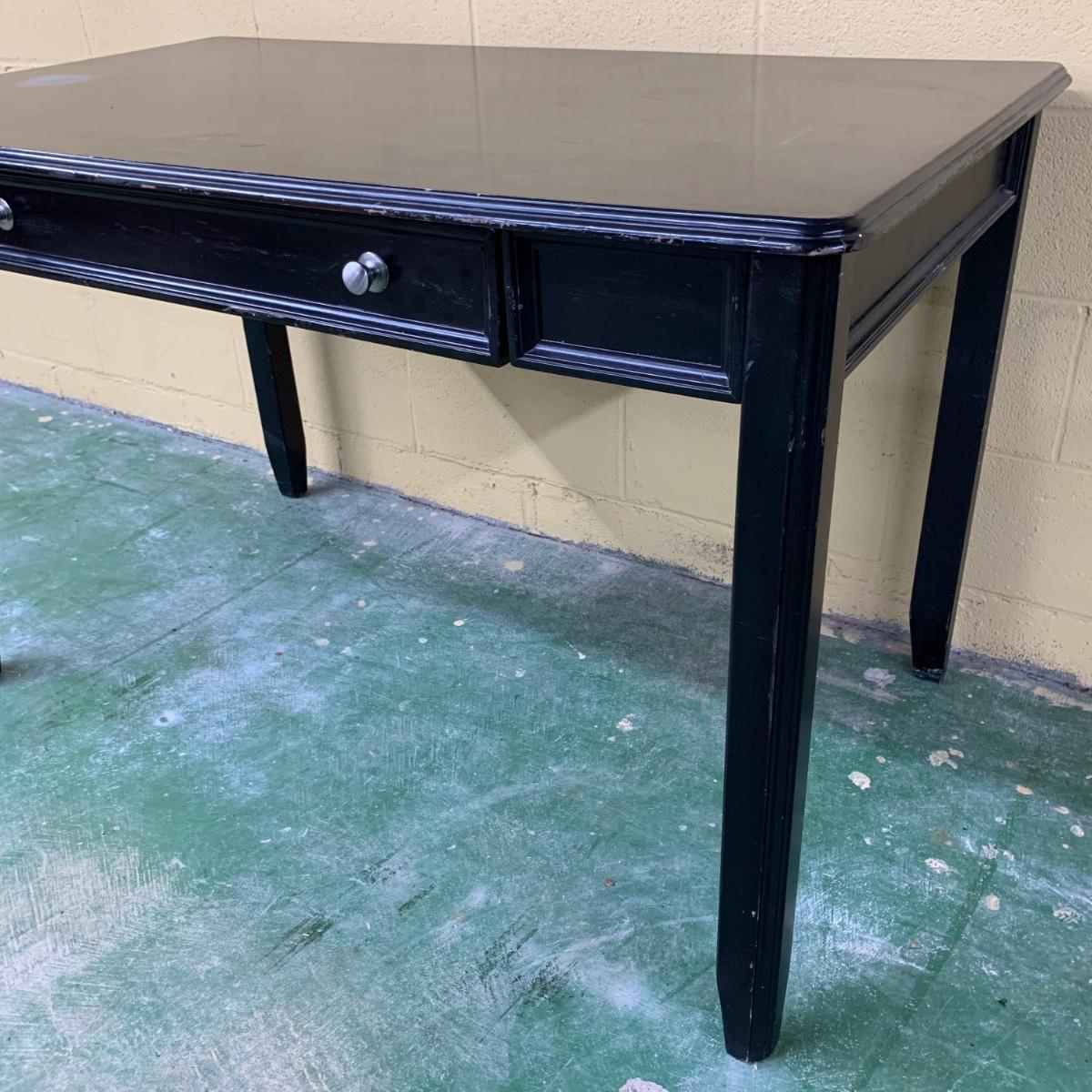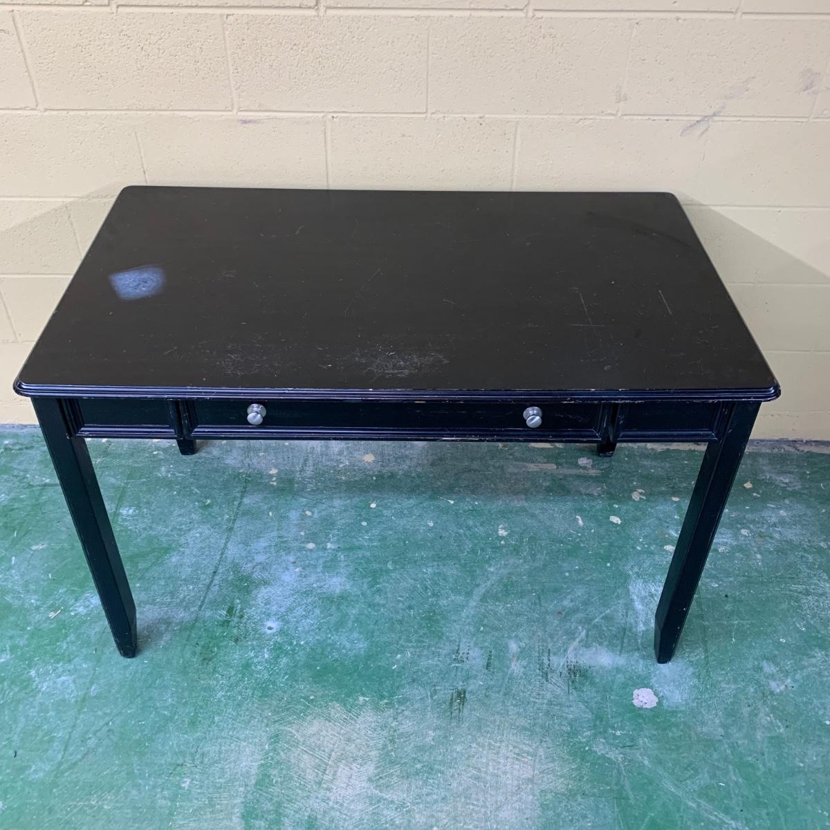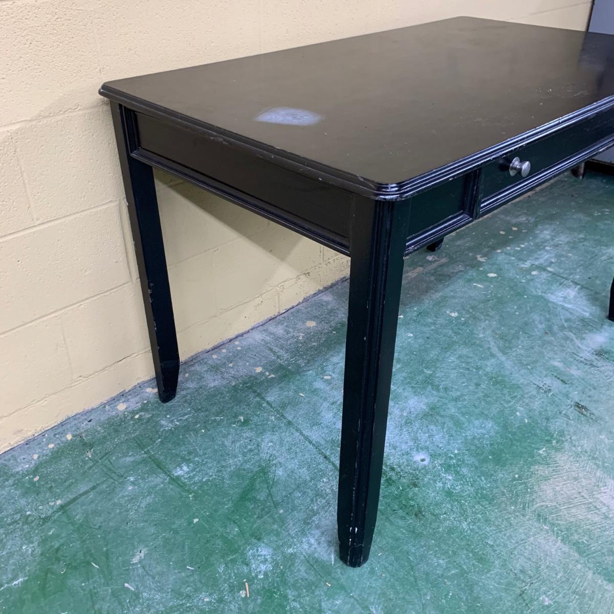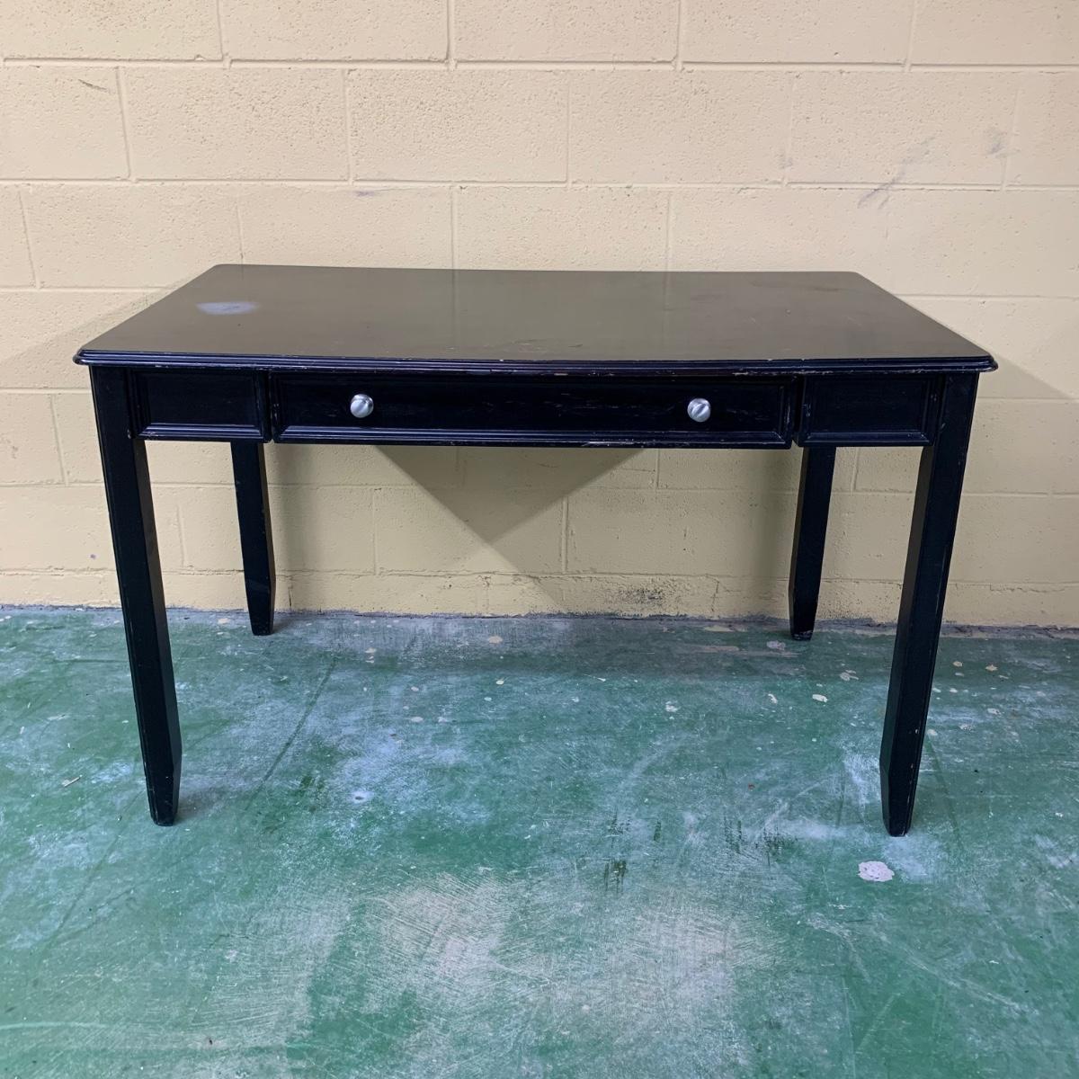 Ashley Furniture brand black-painted wood desk. Measures 48” x 28” x 30”. Desk is in good condition structurally, but does have quite a few blemishes with stains and scratches. The drawer slides smoothly on a metal track. Local pickup only.