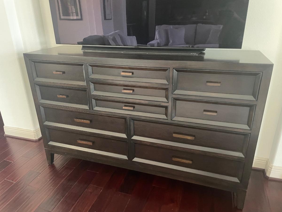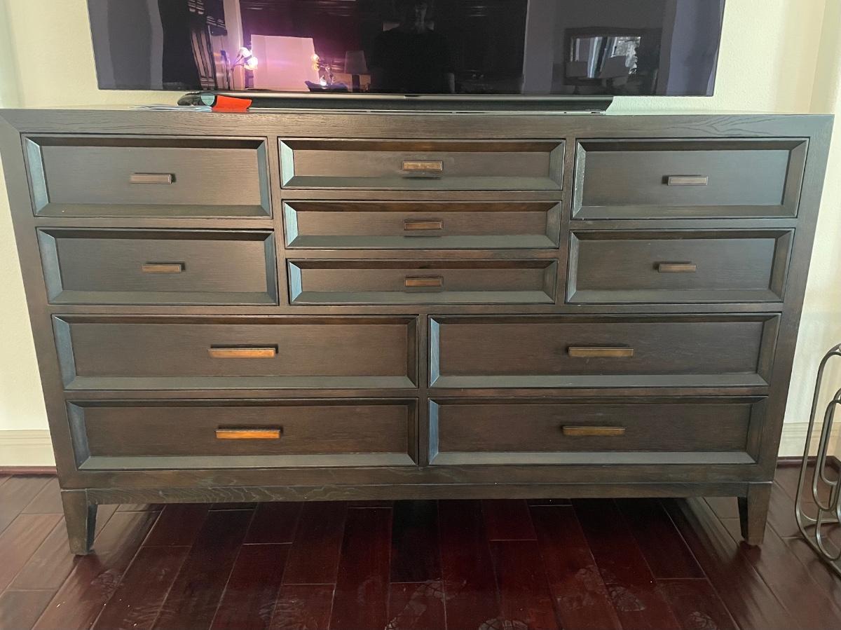 Dark espresso/walnut-tone wood with bronze-tone drawer pulls. Like new condition. 66" x 19" x 40.5" tall. Two matching nightstands available.