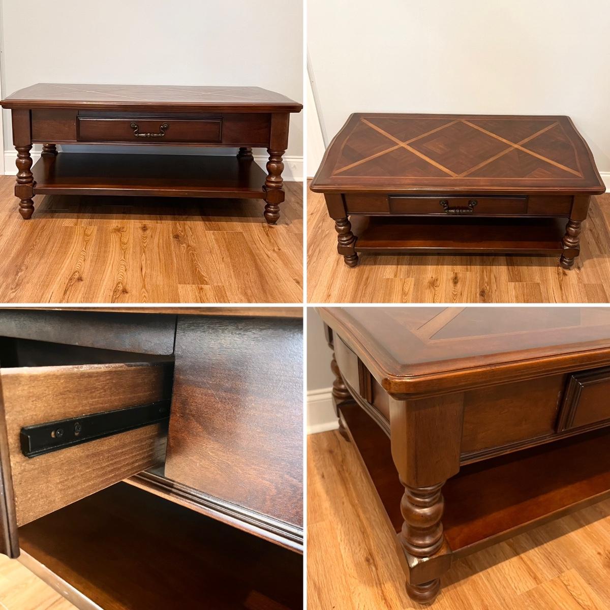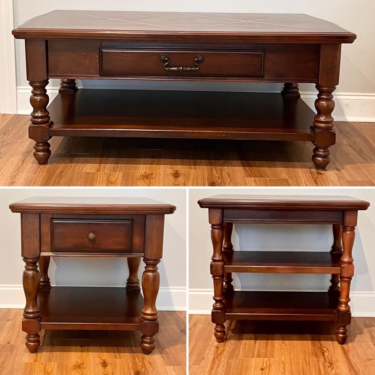 Includes = (1) Coffee Table 20.5” H x 50” W x 29” D ~ (1) Square Side Table 26” H x 26.5 “ W x 28” D ~ (1) Oblong Side Table 26” H x 28” W x 16.5 D