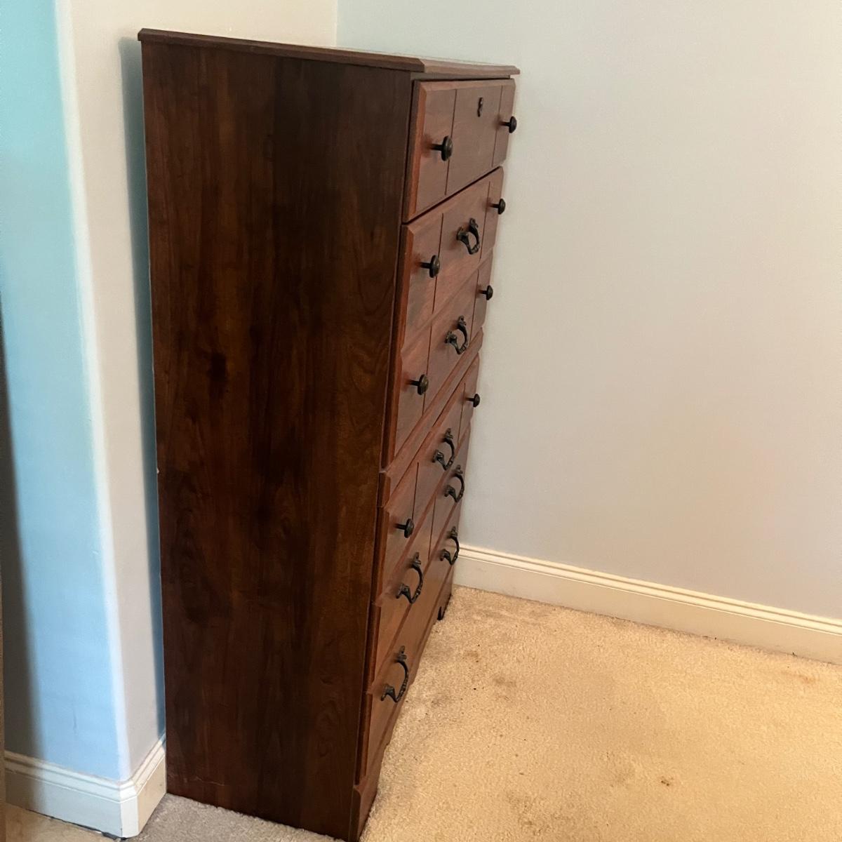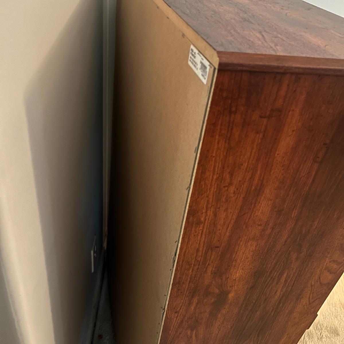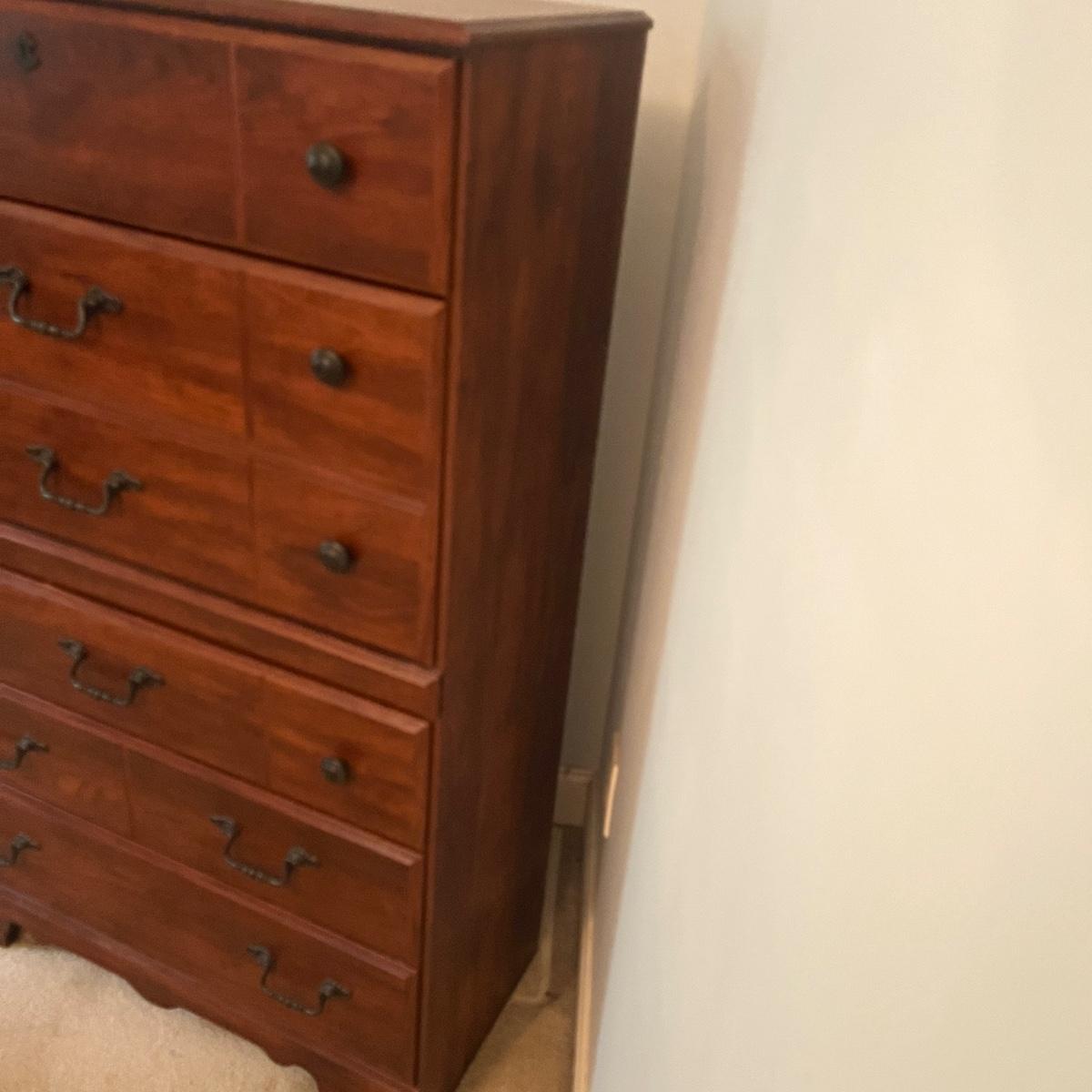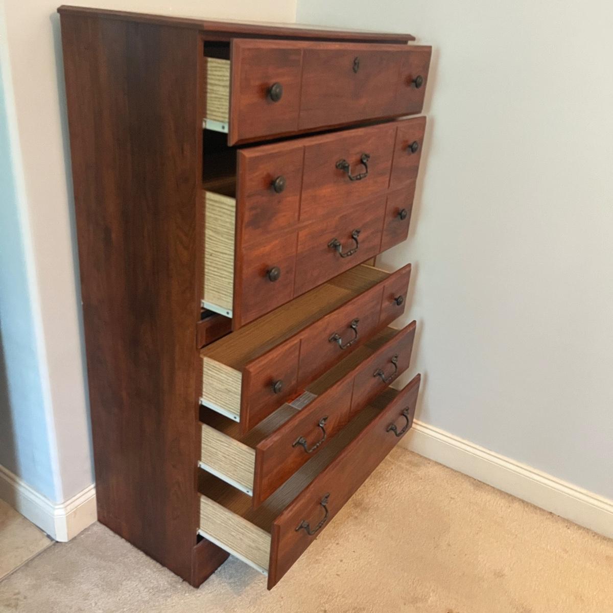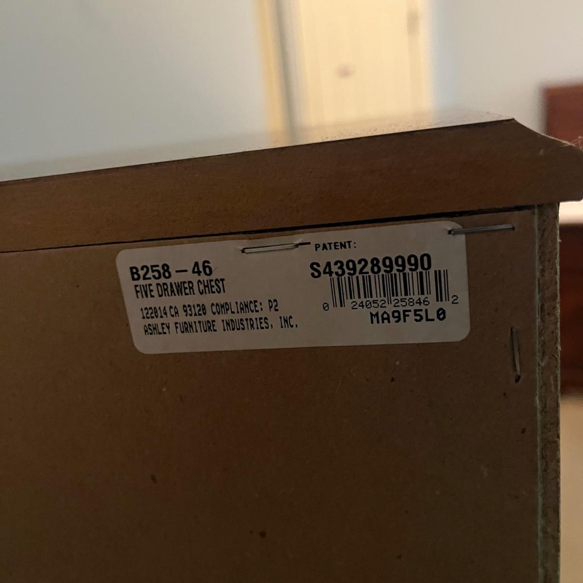 This Ashley Furniture chest of drawers has five drawers and measures 34” x 16” x 54”H. Chest appears to be pressed wood with metal track slides.
