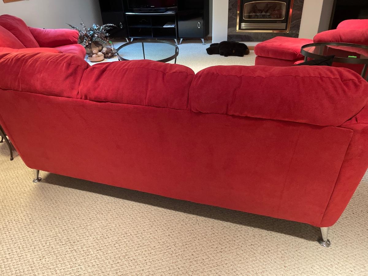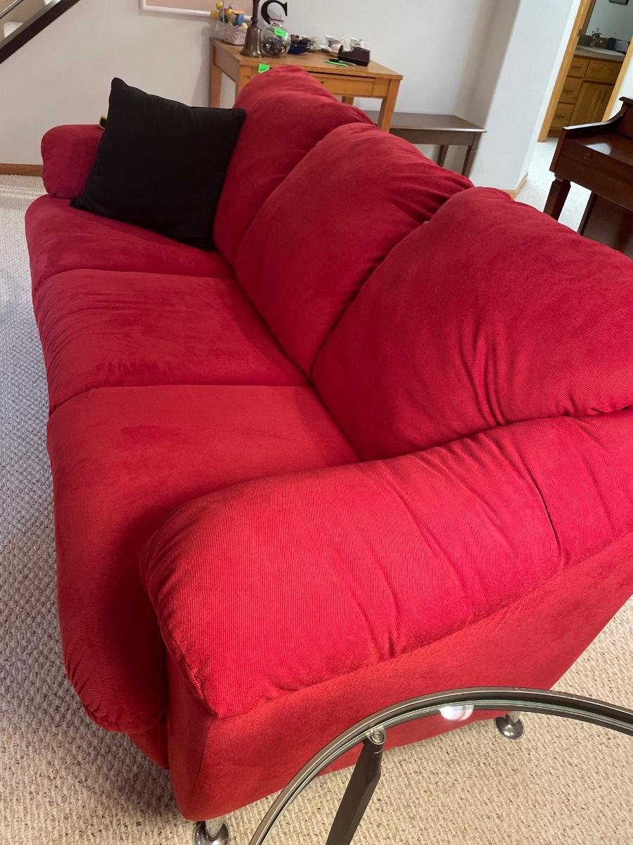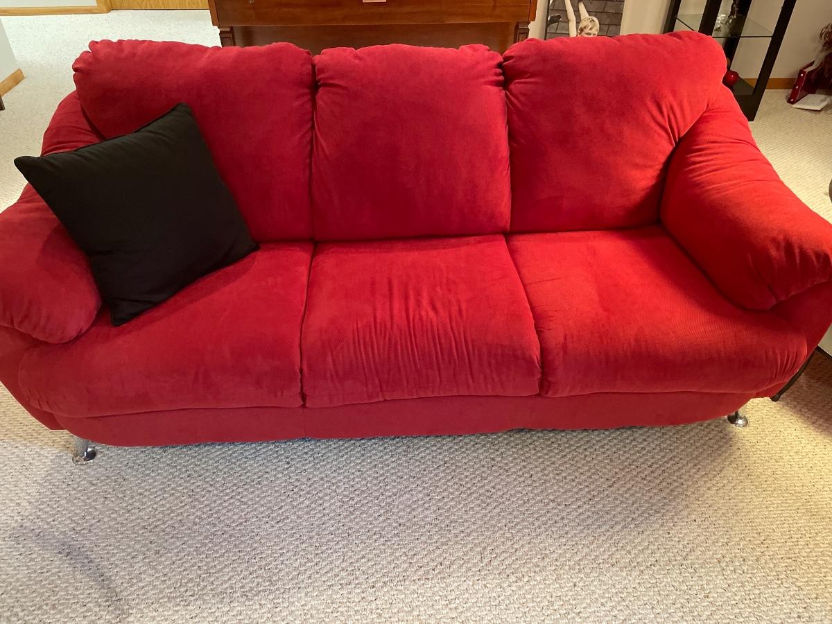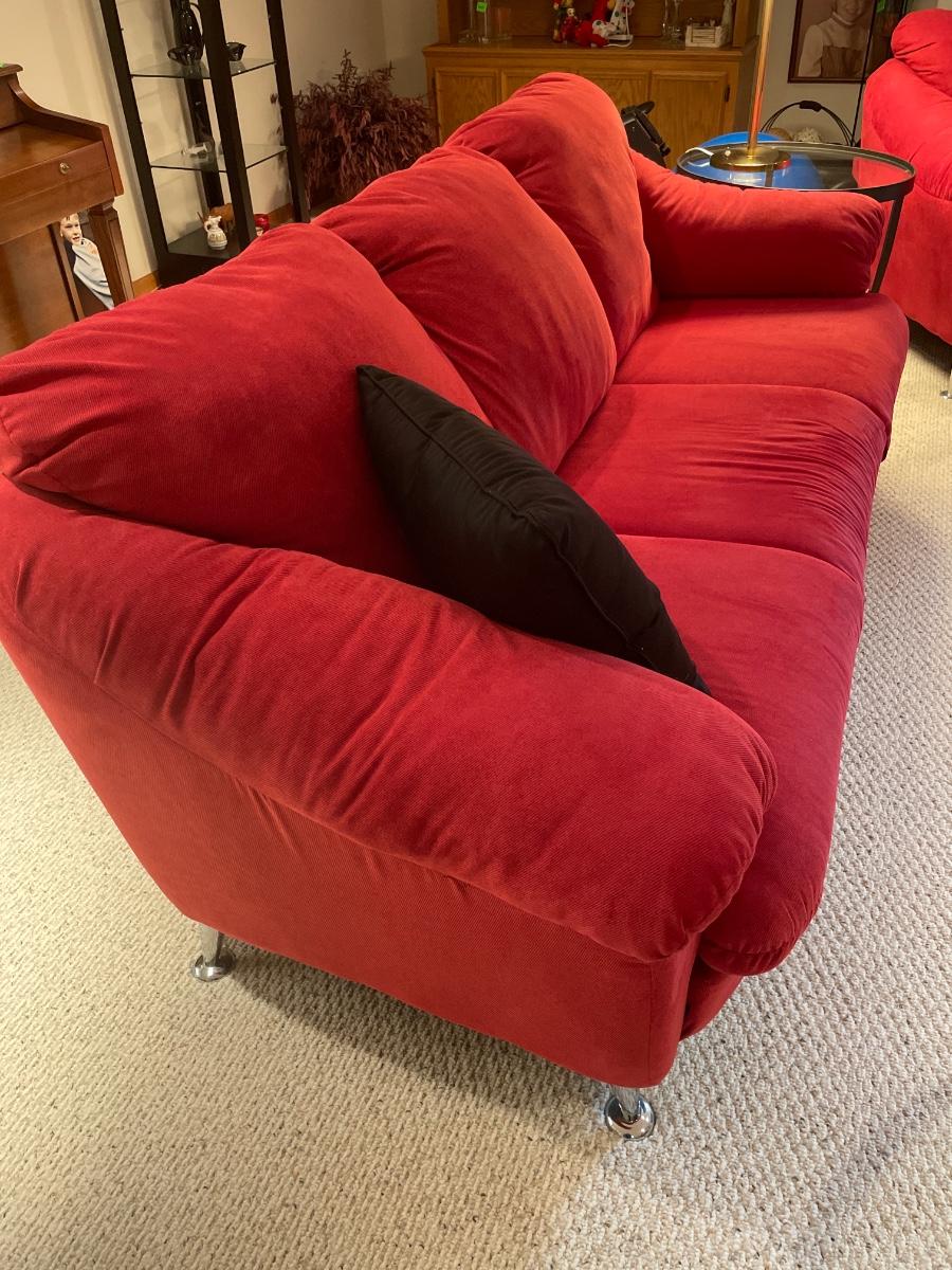In great condition red plush fabric sofa with silver legs