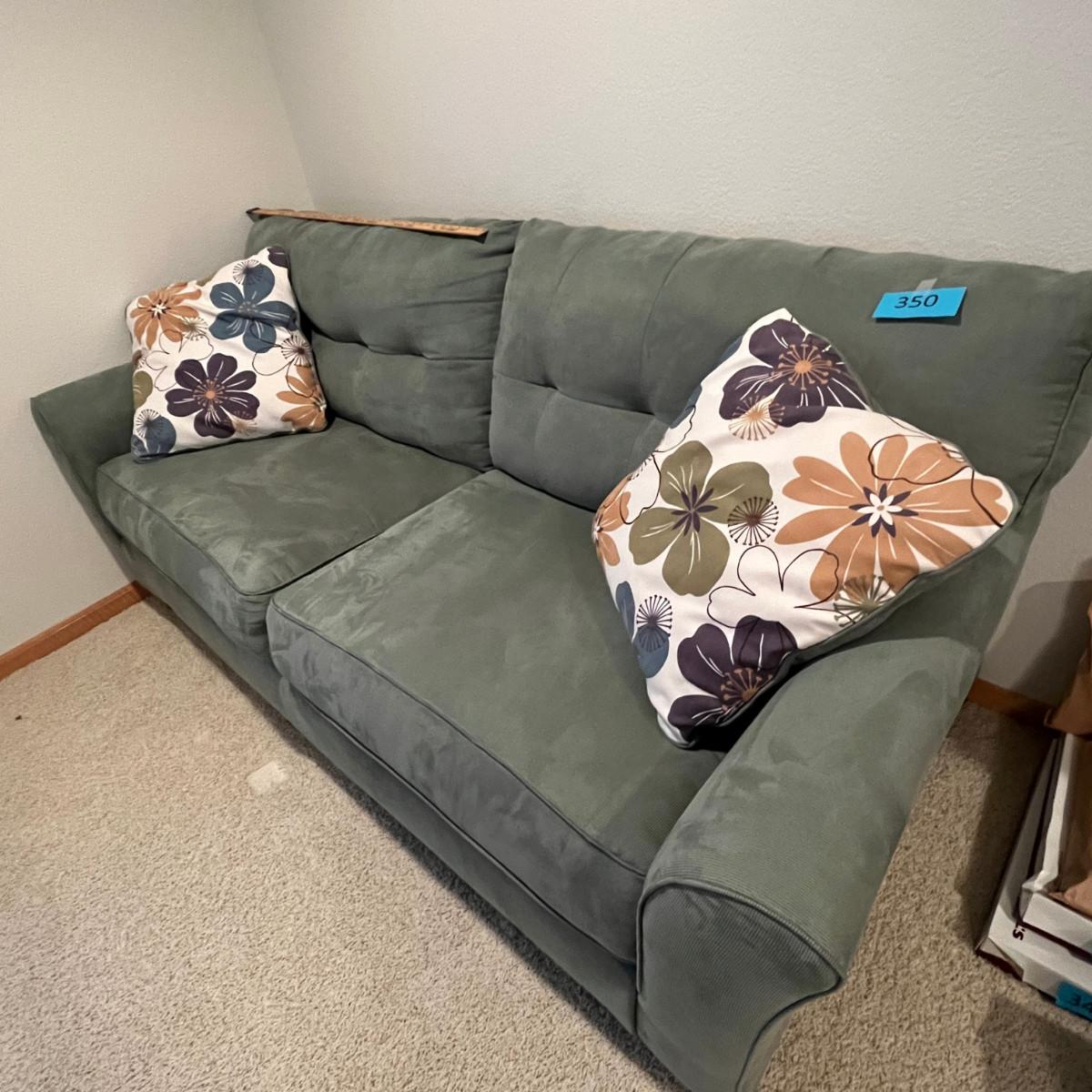 64" long, roughly. Clean, no stains! Not a sleeper sofa!!! Watch for the chair.