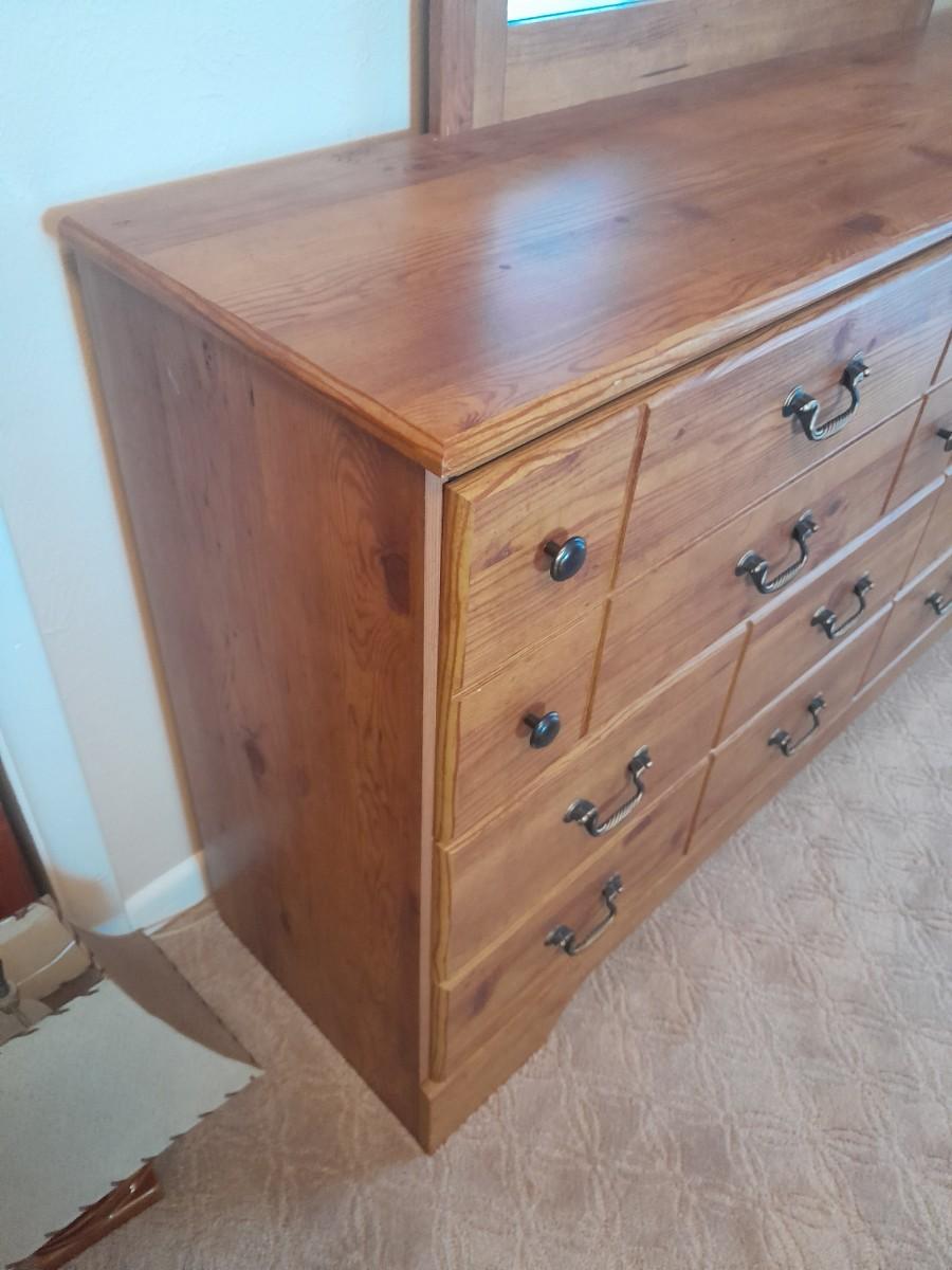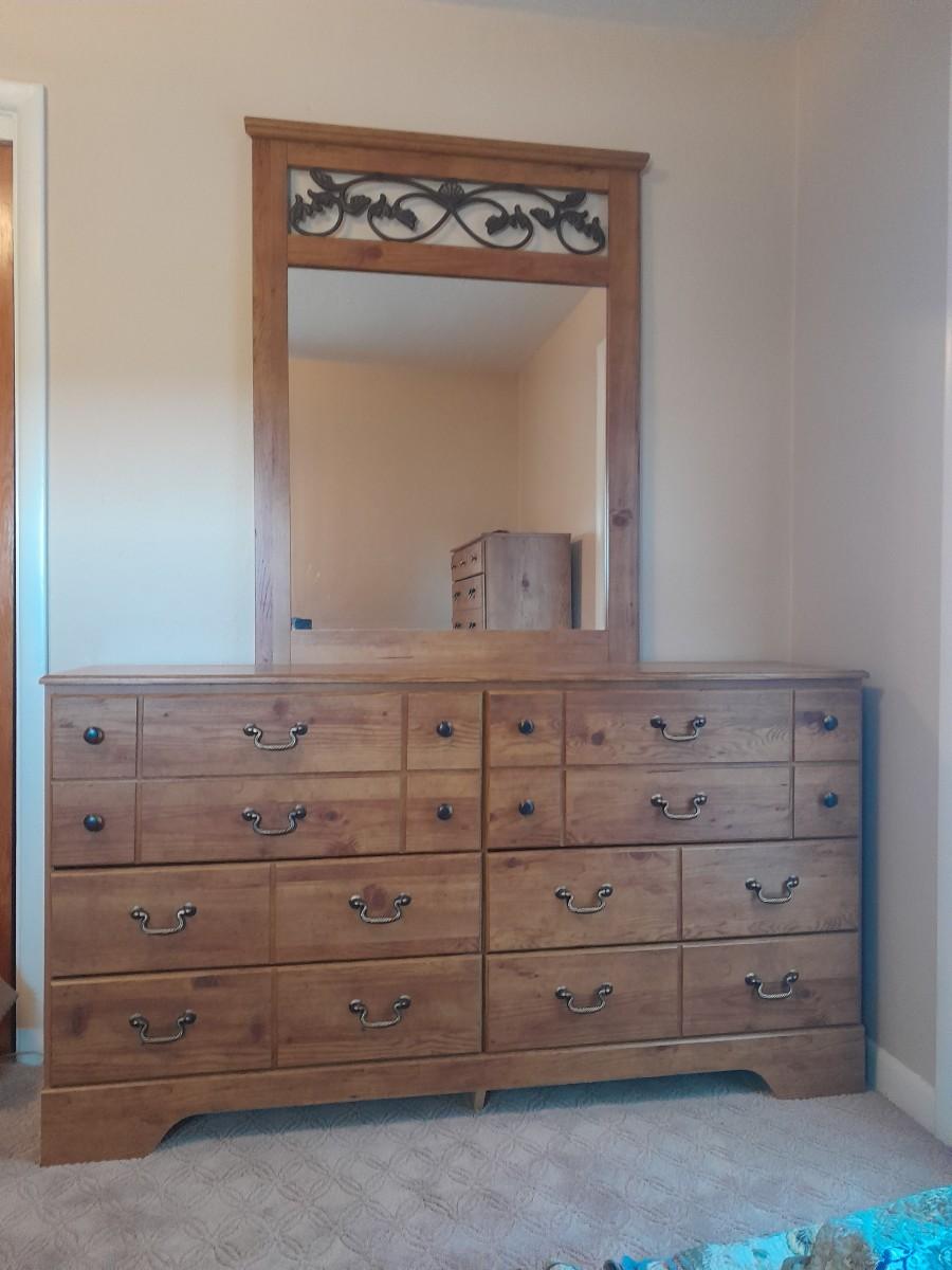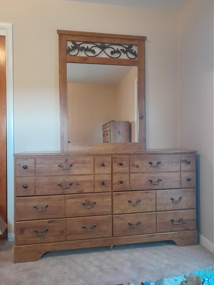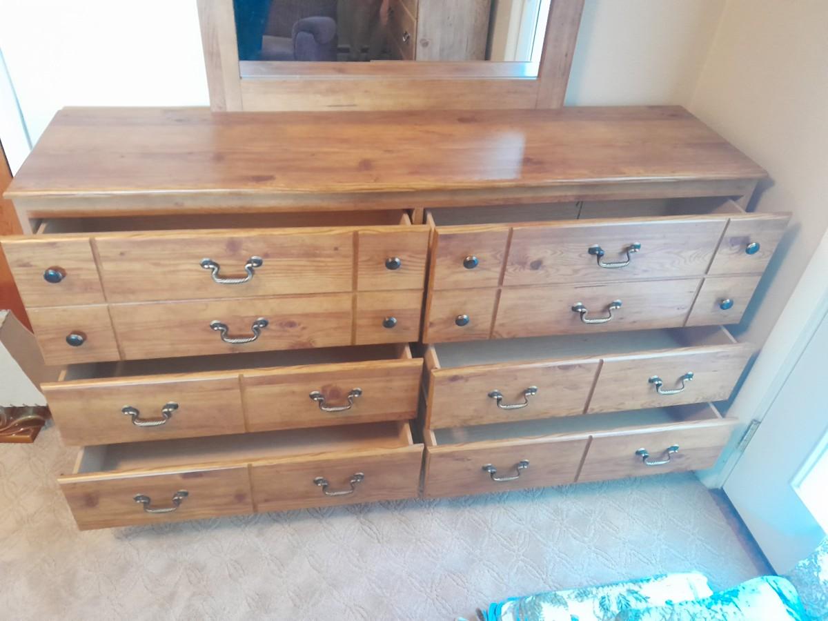 NICE ASHLEY FURNITURE SIX DRAWER LONG DRESSER 62" X 63" WITH MIRROR 47" X 35" REPLICATED PINE GRAIN