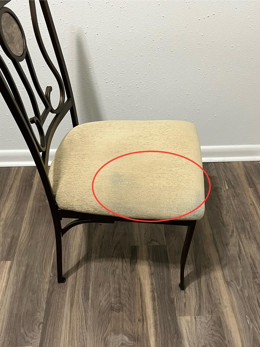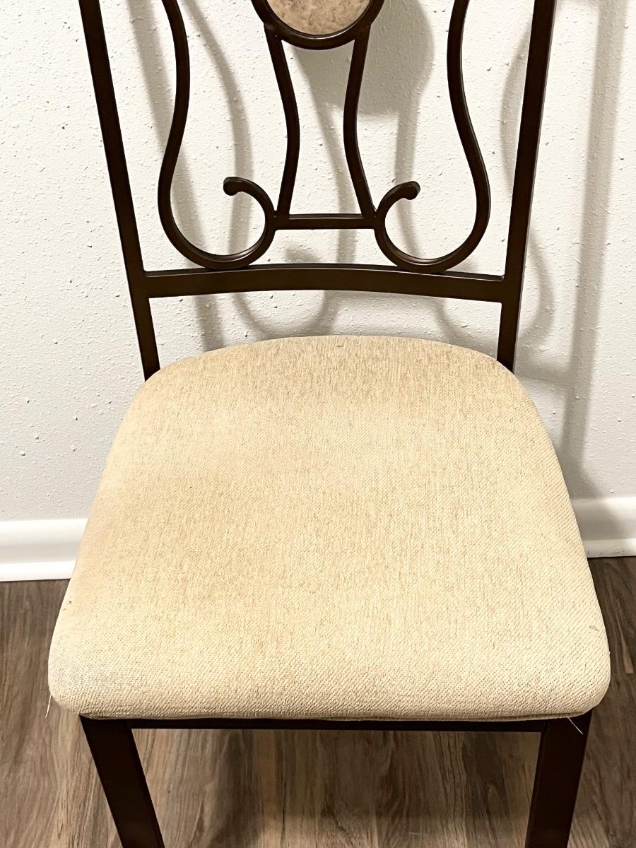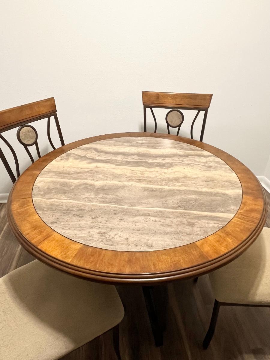 Marble in top is faux ~ Upholstery on chairs has been disinfected, deodorized & sanitized but could use additional cleaning. ~ One chair upholstery appears to have been used more than the rest and shows more signs of wear as seen in photo ~ Table 31” H x 45” Round ~ (4) Chairs 40” H x 18” W x 18” D