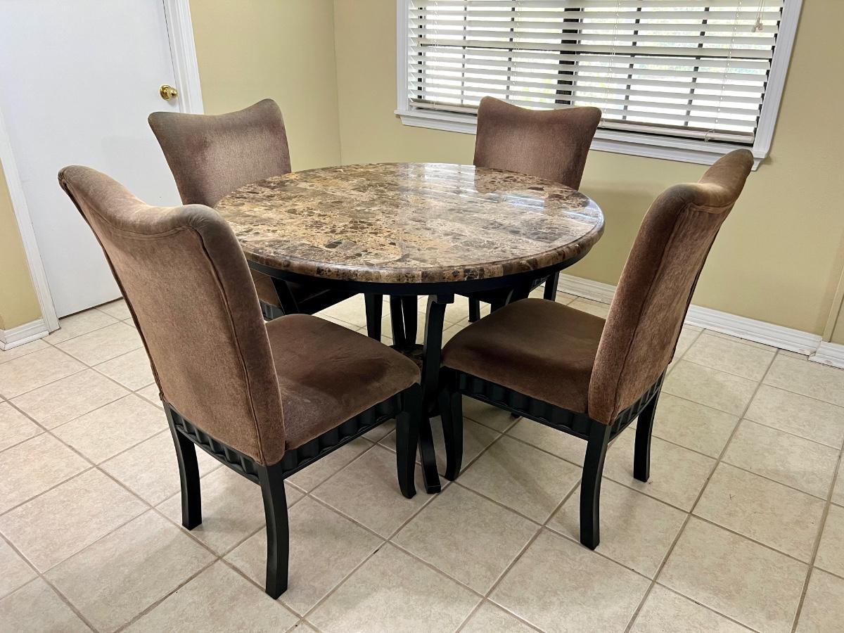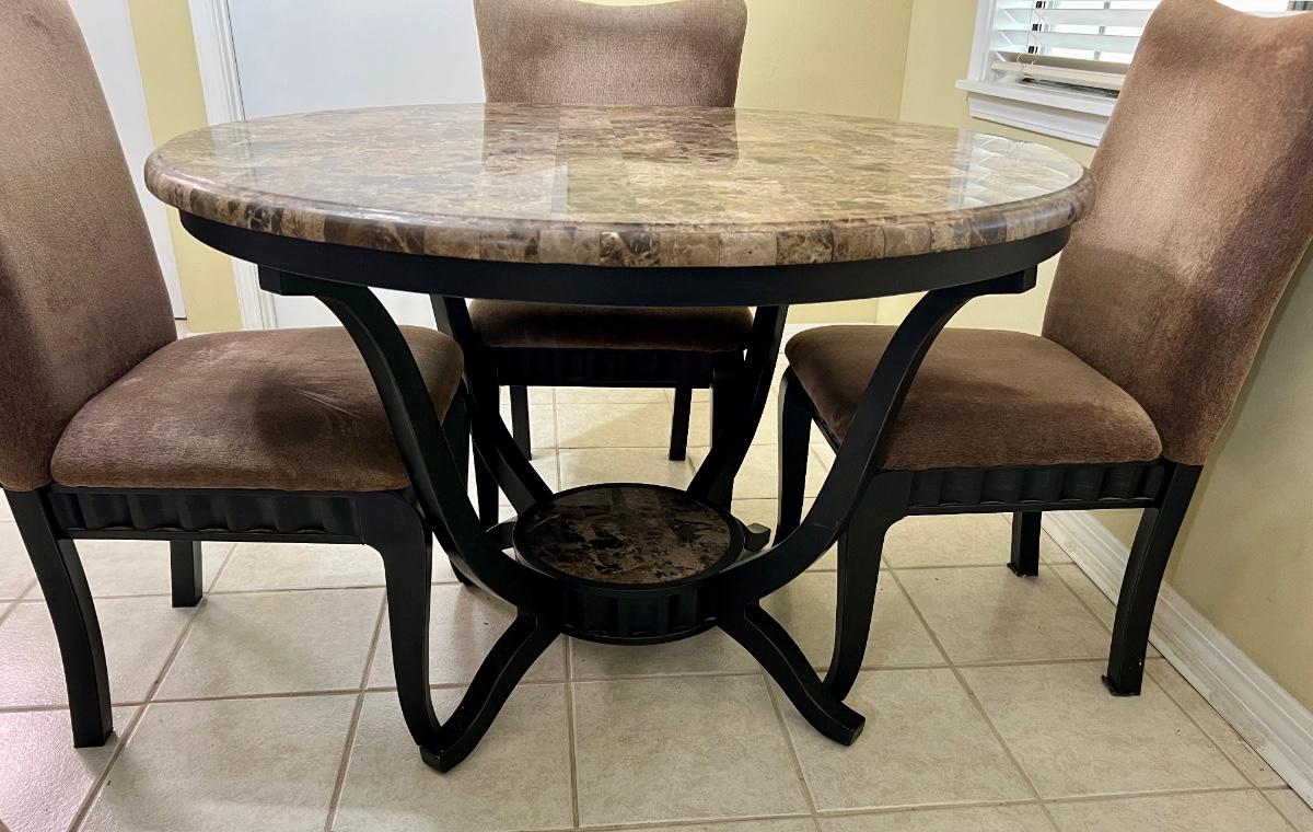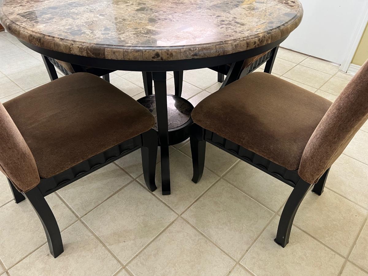 ASHLEY FURNITURE Round Marble & Metal Table & 4 Chairs. Table Measures 31 inches tall and 45 inches round. Chairs measure 38 inches tall and 17 inches floor to seat. Chairs do show some signs of use and wear, see pictures.