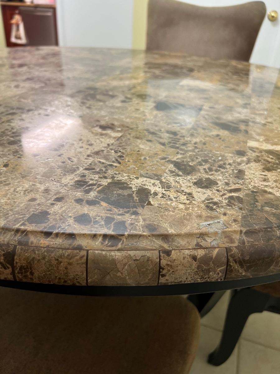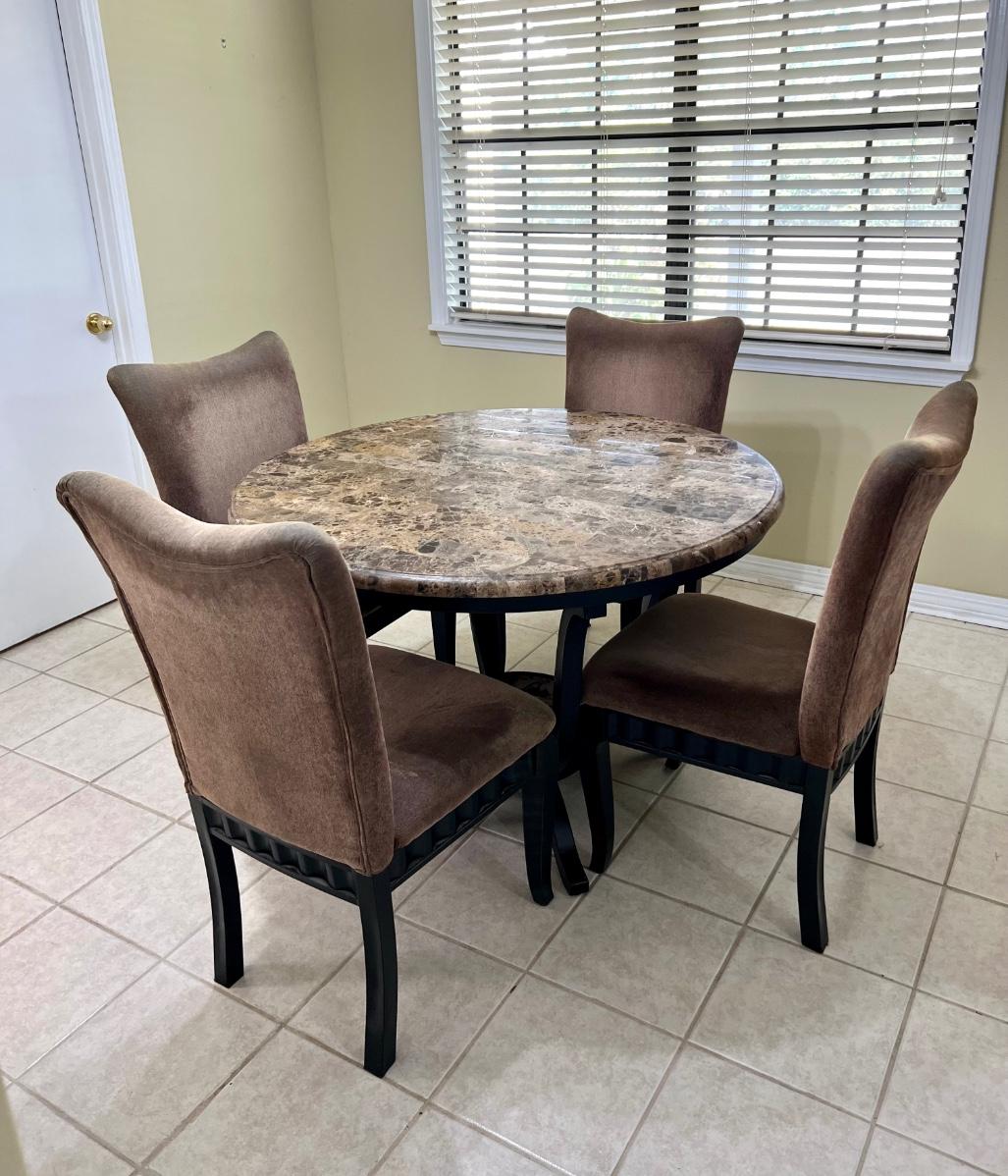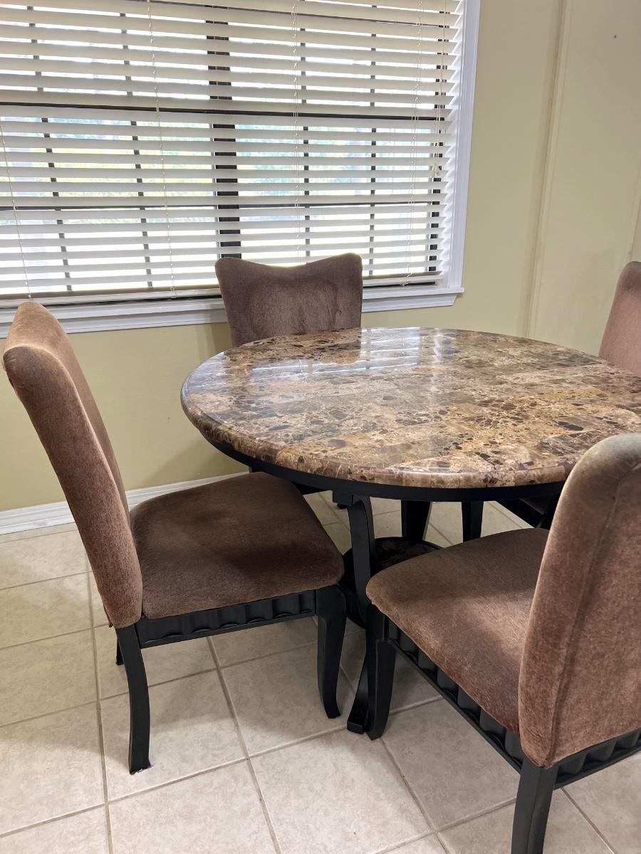 ASHLEY FURNITURE Round Marble & Metal Table & 4 Chairs. Table Measures 31 inches tall and 45 inches round. Chairs measure 38 inches tall and 17 inches floor to seat. Chairs do show some signs of use and wear, see pictures.