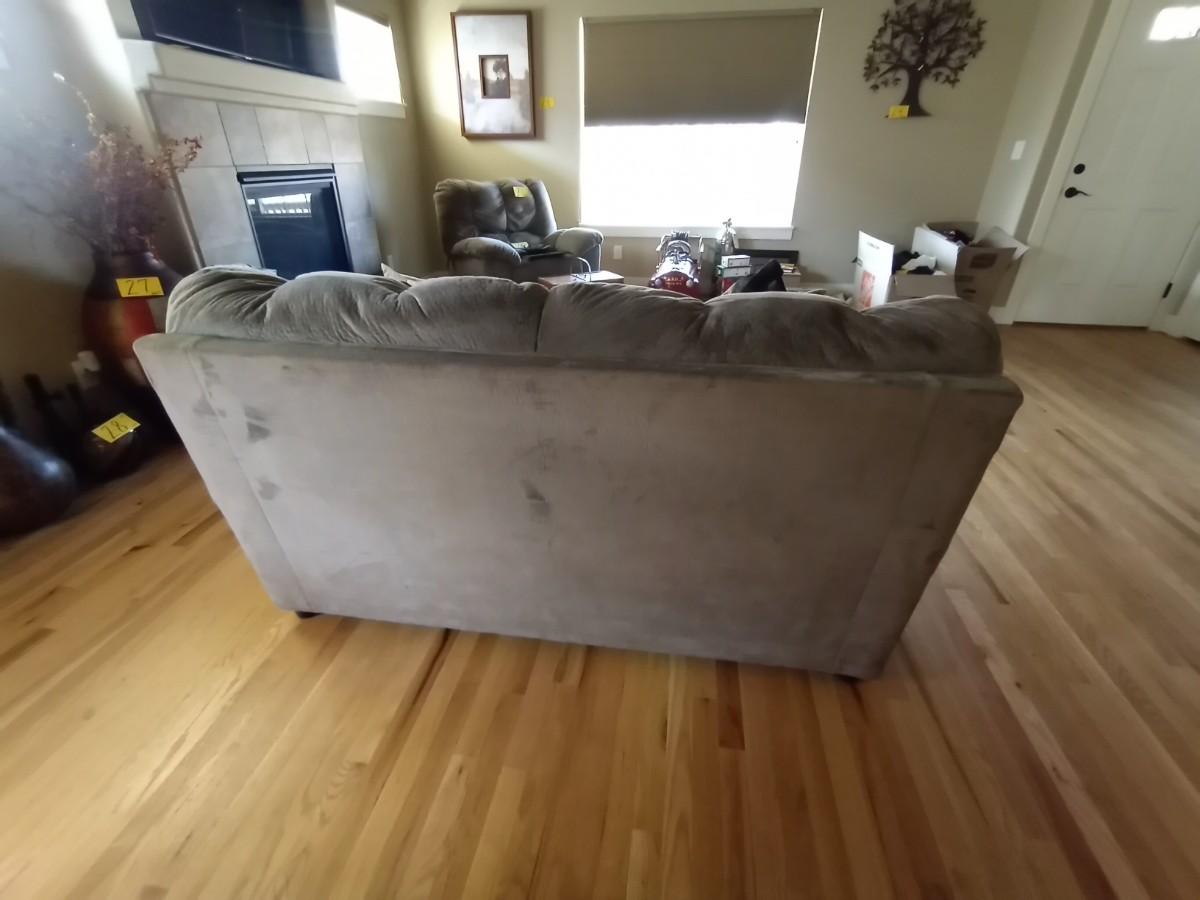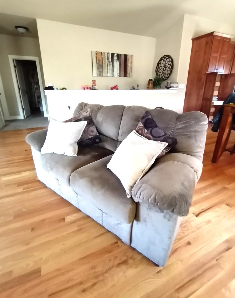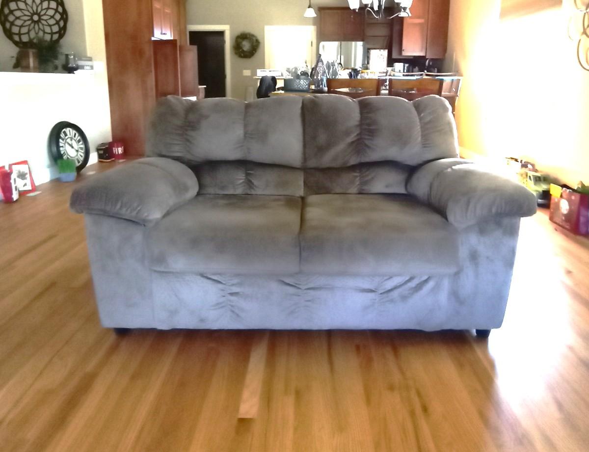APPROX. 62 WIDE ASHLEY FURNITURE TAN MICROFIBER LOVESEAT SOFA (MATCHES RECLINER IN LOT 22) WITH 4 THROW PILLOWS
