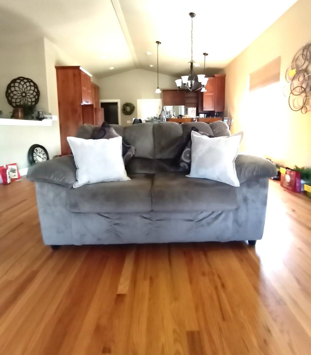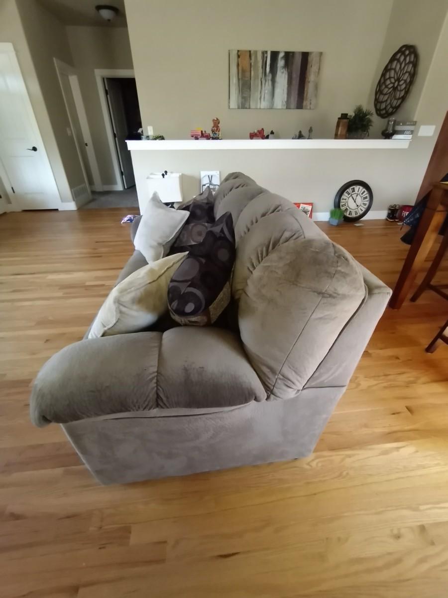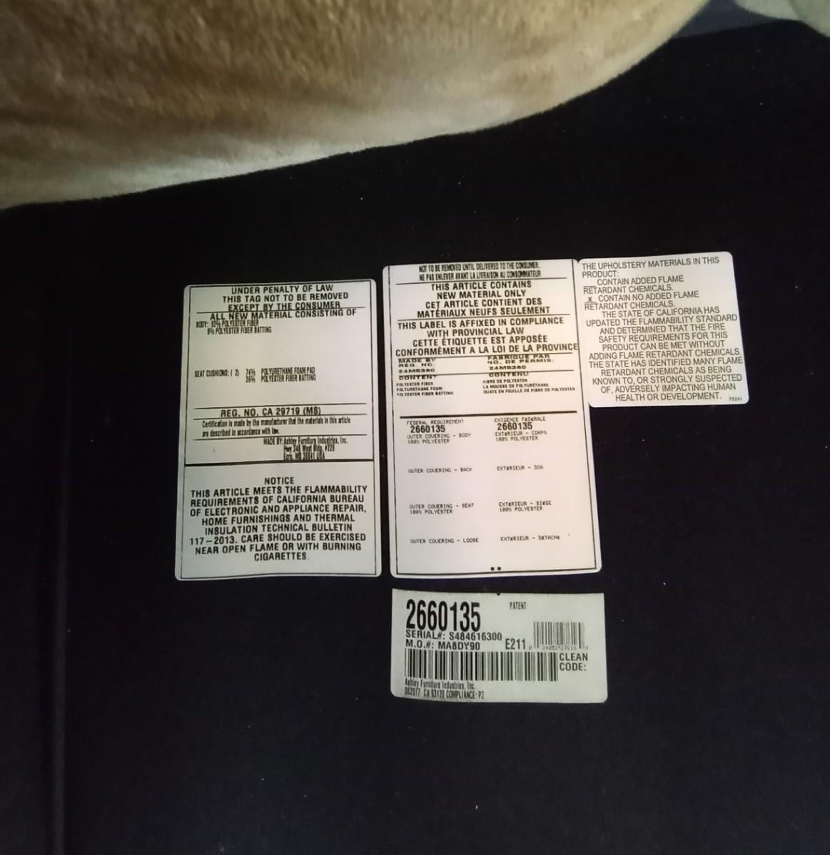 APPROX. 62 WIDE ASHLEY FURNITURE TAN MICROFIBER LOVESEAT SOFA (MATCHES RECLINER IN LOT 22) WITH 4 THROW PILLOWS