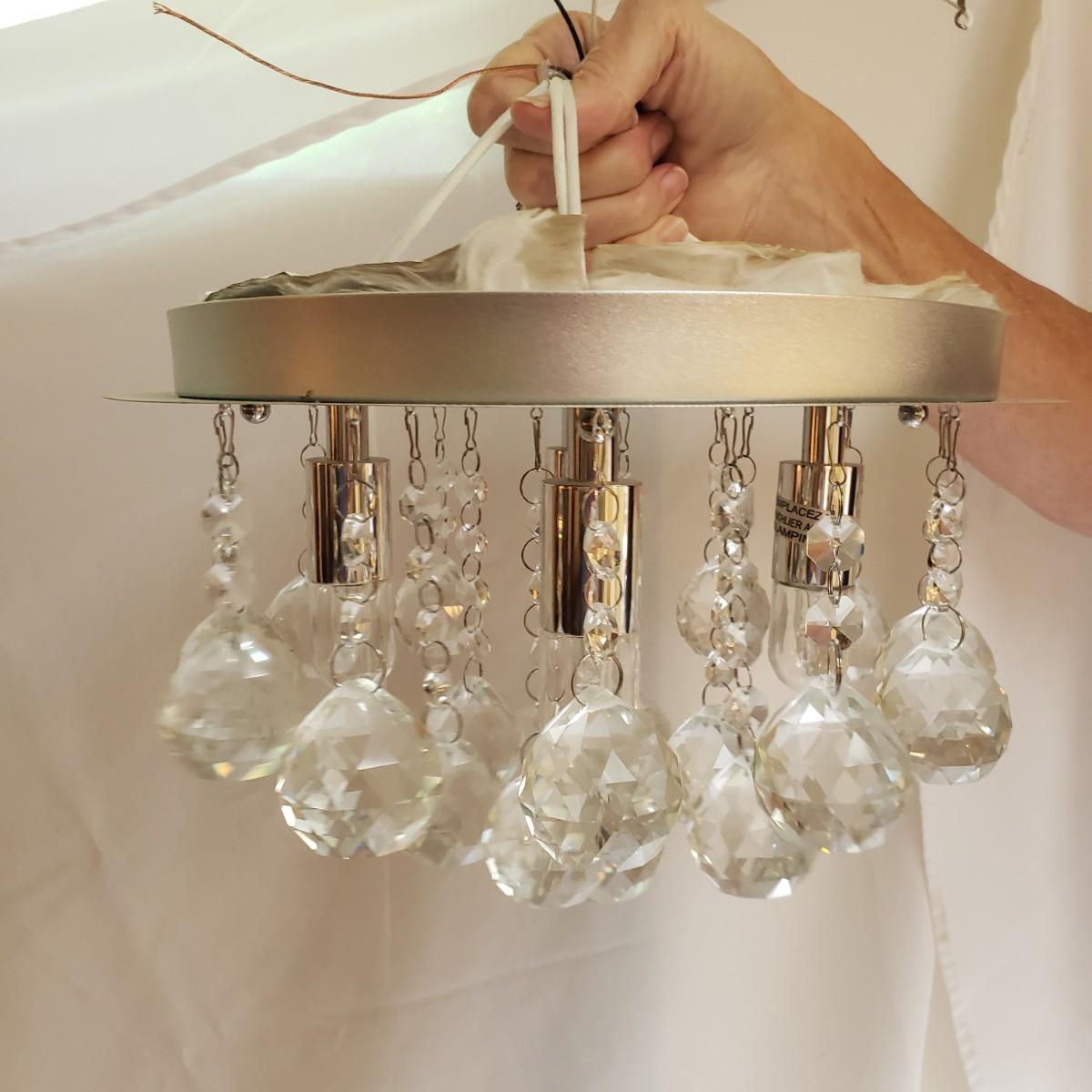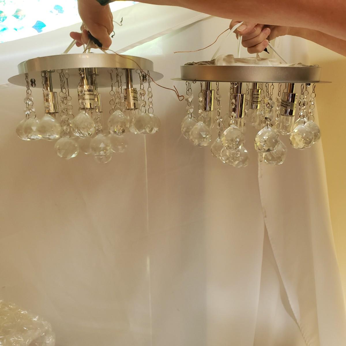 These two Ashley Harbour crystal raindrop light fixtures will add rainbows to any room! Each fixture measures 12" x 7"H. The pendants are heavy. The rim is a silver metal and the crystal balls are glass.